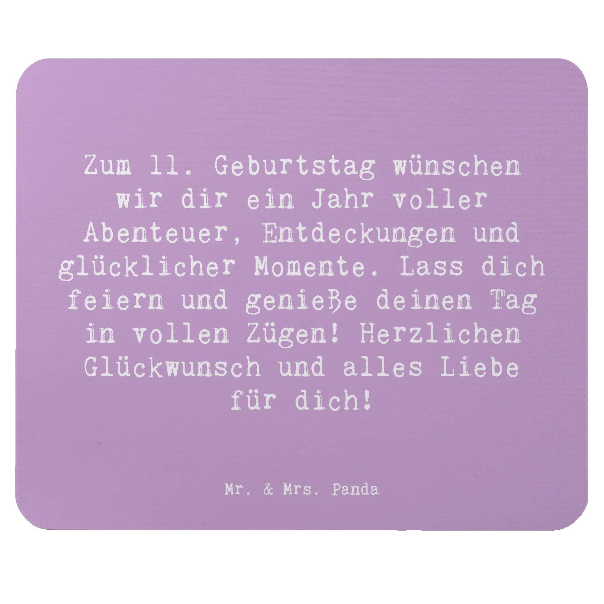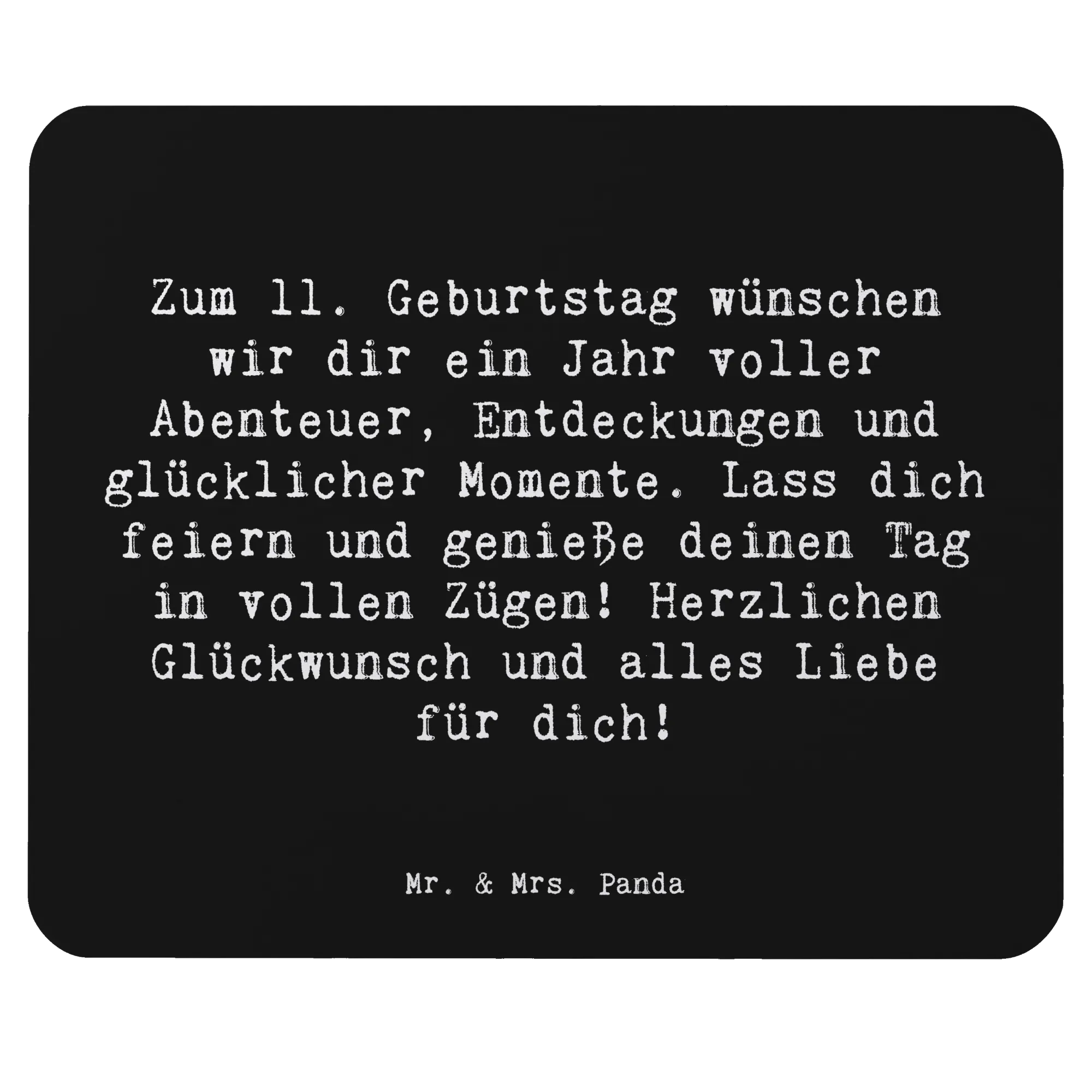 Das Mauspad ist mit dem herzlichen Spruch "Zum 11. Geburtstag wünschen wir dir ein Jahr voller Abenteuer, Entdeckungen und glücklicher Momente. Lass dich feiern und genieße deinen Tag in vollen Zügen! Herzlichen Glückwunsch und alles Liebe für dich!" bedruckt. Dieses Motiv wurde liebevoll von Mr. & Mrs. Panda designt und erinnert an den besonderen Tag, an dem die Welt ein ganzes Jahr später ein wenig bunter wird.