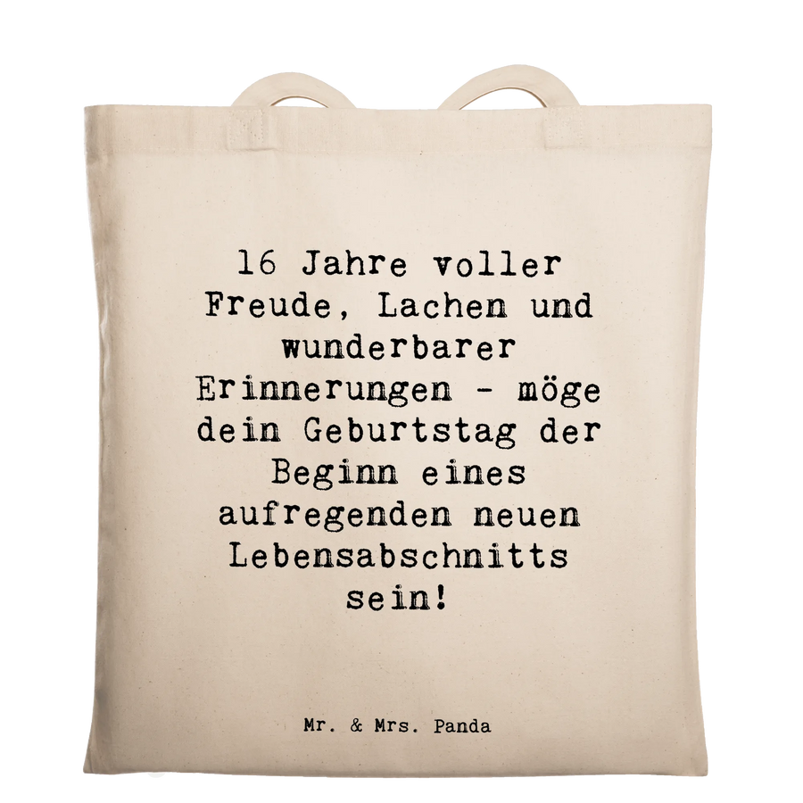 Suchst du ein Geschenk, das von Herzen kommt und zugleich im Alltag praktisch ist? Unsere Mr. & Mrs. Panda Tragetasche „16. Geburtstag“ vereint liebevolle Gestaltung mit echtem Nutzwert. Mit dem warmen Spruch „16 Jahre voller Freude, Lachen und wunderbarer Erinnerungen - möge dein Geburtstag der Beginn eines aufregenden neuen Lebensabschnitts sein!“ wird jede Nutzung zu einem kleinen Festmoment.