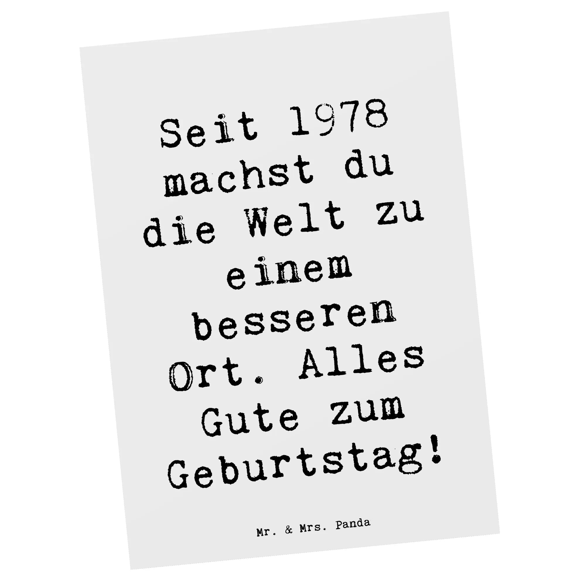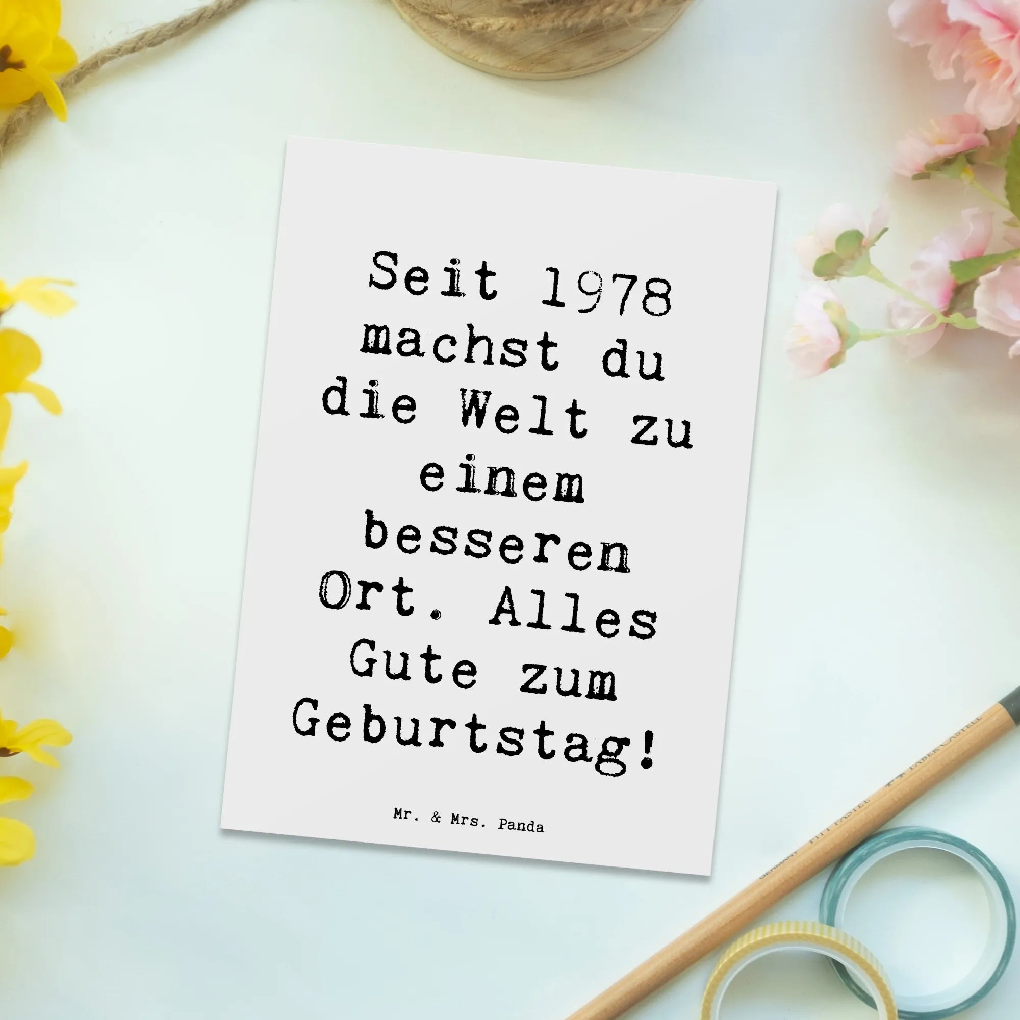 Entdecke die zauberhafte Postkarte aus der Mr. & Mrs. Panda Kollektion für 1978 Geburtstag! Diese einzigartige Postkarte mit dem liebevollen Spruch 'Seit 1978 machst du die Welt zu einem besseren Ort. Alles Gute zum Geburtstag!' eignet sich perfekt für all jene, die im Jahr 1978 das Licht der Welt erblickt haben. Ob für einen Freund, ein Familienmitglied oder einfach nur, um jemandem eine Freude zu bereiten – diese Geburtstagskarte ist das ideale Geschenk! Sie ist nicht nur schön gestaltet, sondern überzeugt auch durch ihre hochwertige Verarbeitung aus 300 Gramm Karton und einen lang anhaltenden Druck mit hochqualitativer Tinte.