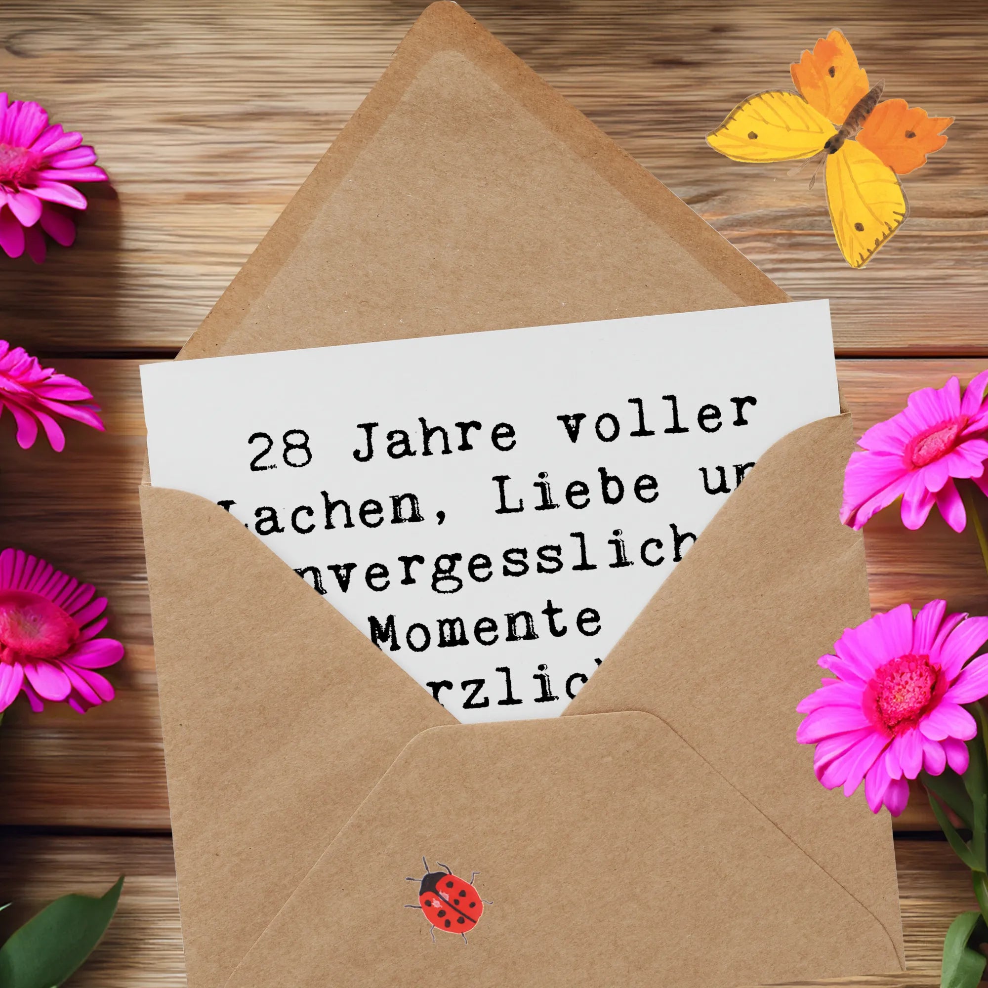 Diese hochwertige Klappkarte ist nicht nur ein schöner Gruß, sondern auch ein liebevoll gestaltetes Erinnerungsstück, das das Herz des Empfängers erwärmen wird. Mit dem zauberhaften Spruch '28 Jahre voller Lachen, Liebe und unvergesslicher Momente - herzlichen Glückwunsch zu deinem Geburtstag!' auf der Vorderseite, bringt diese Karte die genau richtigen Worte für diesen besonderen Anlass.