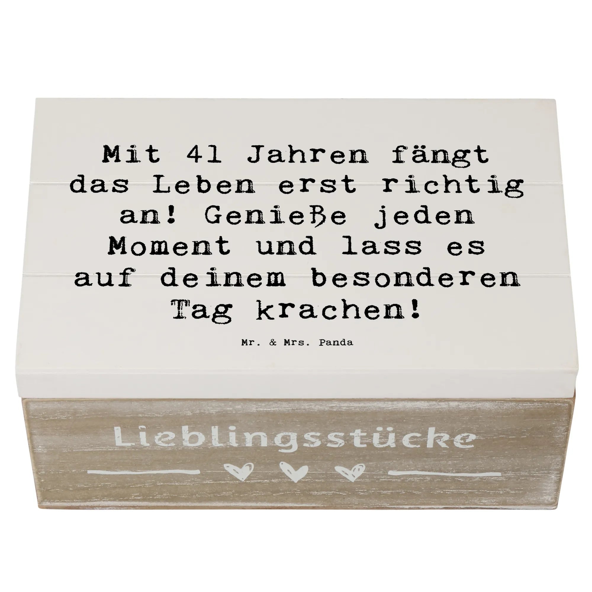 Die wunderschöne Holzkiste von Mr. & Mrs. Panda ist das perfekte Geschenk für deinen besonderen Menschen, der den 41. Geburtstag feiert. Diese einzigartige Holzkiste ist nicht nur ein Aufbewahrungsort für Erinnerungen, sondern auch eine liebevolle Hommage an das Leben, das mit 41 Jahren erst richtig beginnt! Sie ist mit dem lebensfrohen Spruch "Mit 41 Jahren fängt das Leben erst richtig an! Genieße jeden Moment und lass es auf deinem besonderen Tag krachen!" verziert und bringt die richtige Portion Freude an jeden festlichen Anlass.
