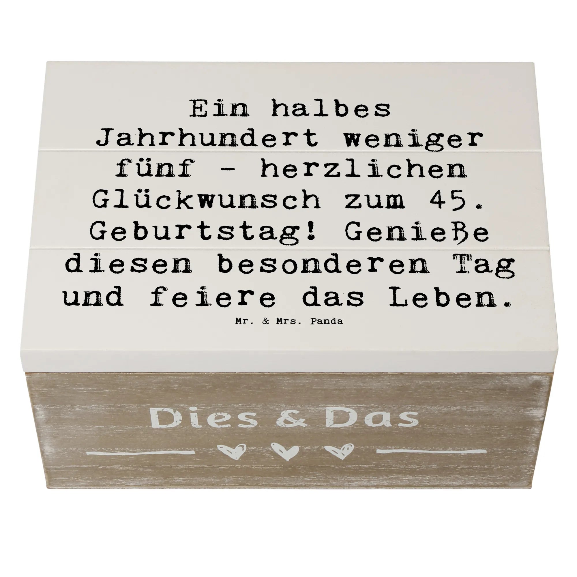Entdecke die zauberhafte Holzkiste von Mr. & Mrs. Panda, die perfekt geeignet ist, um Erinnerungen zu bewahren und Geschenke auf eine liebevolle Art zu verpacken. Diese besondere Schatzkiste feiert mit einem einzigartigen Design den 45. Geburtstag - ein halbes Jahrhundert weniger fünf! Mit dem fröhlichen Spruch "Ein halbes Jahrhundert weniger fünf - herzlichen Glückwunsch zum 45. Geburtstag! Genieße diesen besonderen Tag und feiere das Leben." wird sie zum idealen Geburtstagsgeschenk für Freunde, Familienmitglieder oder Kollegen.
