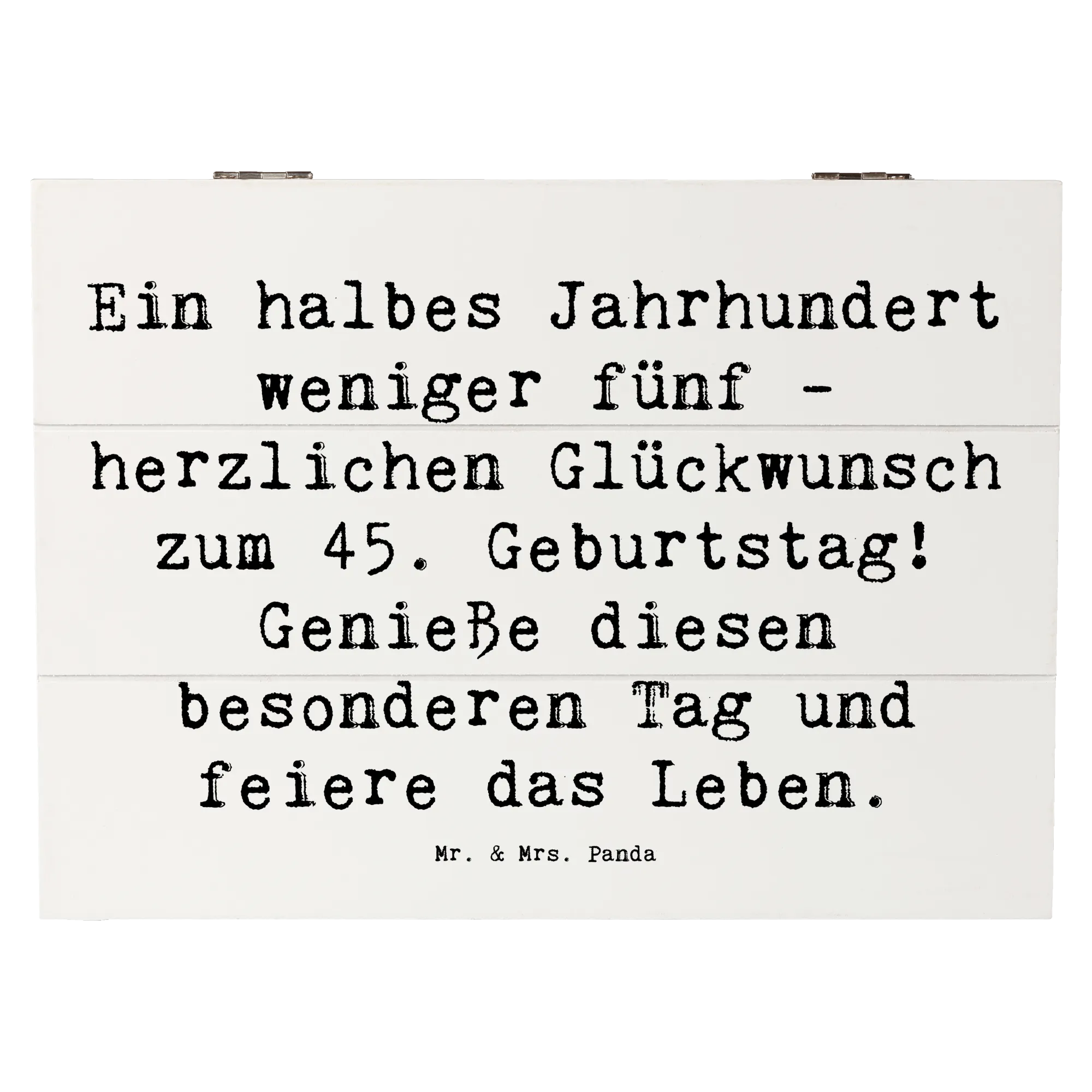 Diese wunderschöne Holzkiste von Mr. & Mrs. Panda ist ein ideales Geschenk zum 45. Geburtstag! Mit liebevollen Details und dem einzigartigen Spruch "Ein halbes Jahrhundert weniger fünf - herzlichen Glückwunsch zum 45. Geburtstag! Genieße diesen besonderen Tag und feiere das Leben." ist sie nicht nur ein echter Hingucker, sondern auch eine perfekte Möglichkeit, wertvolle Erinnerungen festzuhalten.
