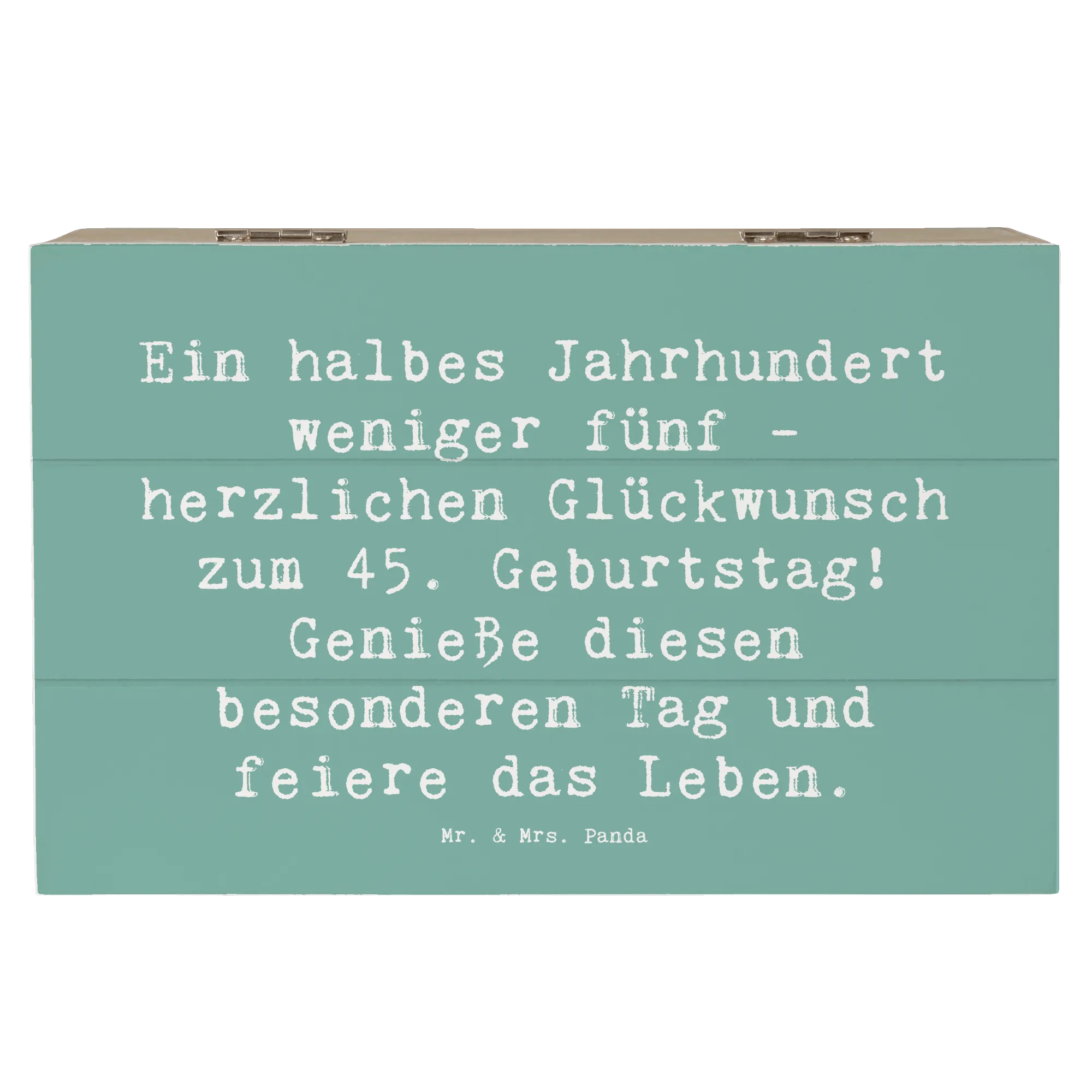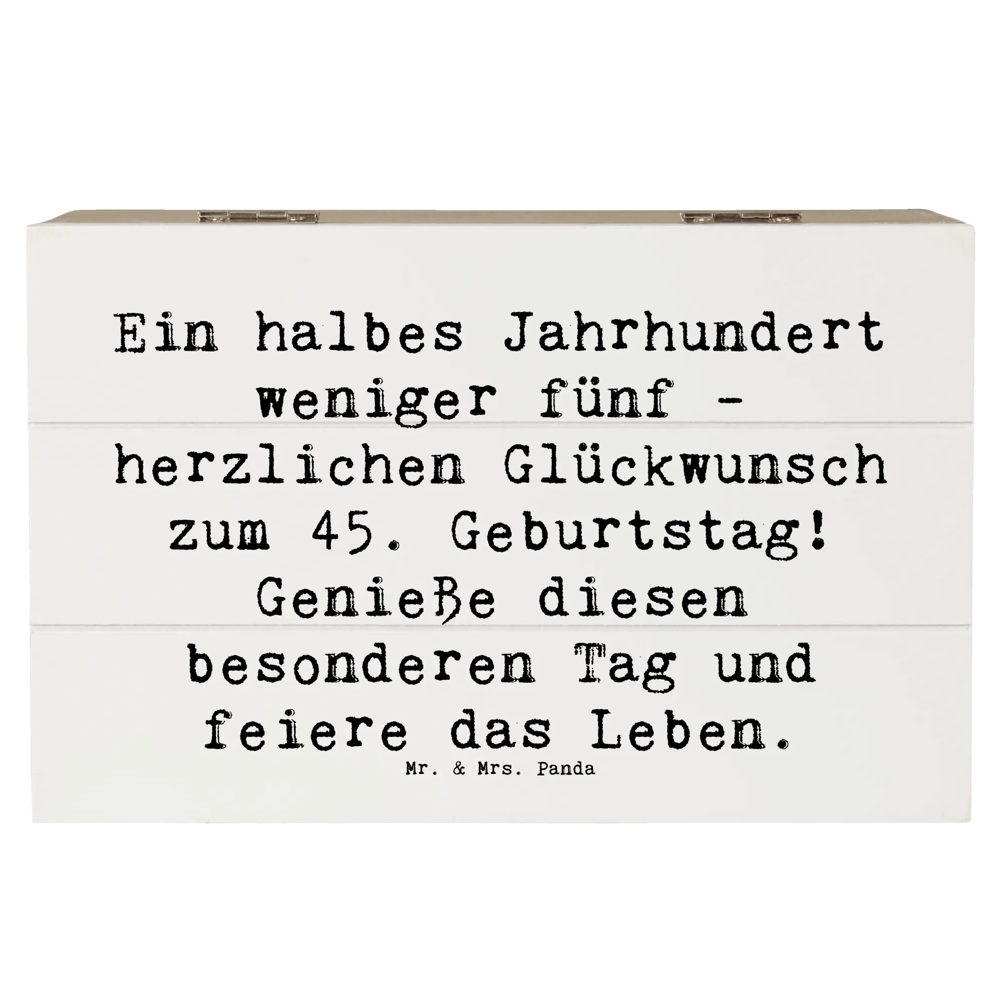 Die wundervolle Holzkiste zum 45. Geburtstag von Mr. & Mrs. Panda ist das perfekte Geschenk für alle, die diesen besonderen Tag auf eine unvergessliche Weise feiern möchten. Mit dem liebevoll gestalteten Spruch "Ein halbes Jahrhundert weniger fünf - herzlichen Glückwunsch zum 45. Geburtstag! Genieße diesen besonderen Tag und feiere das Leben." wird diese Kiste zum Highlight unter den Geschenken.