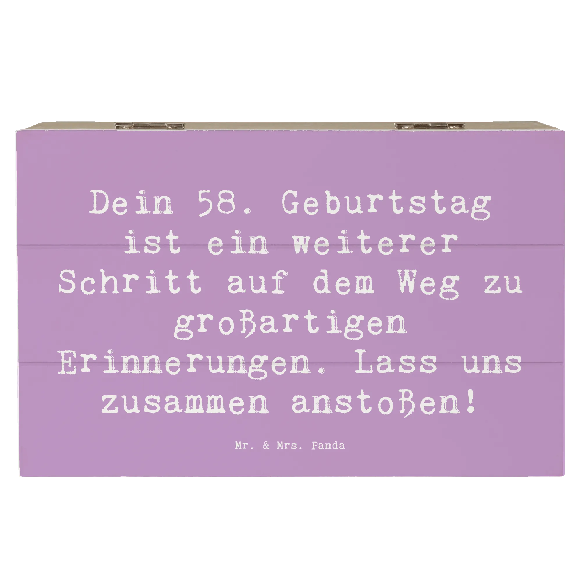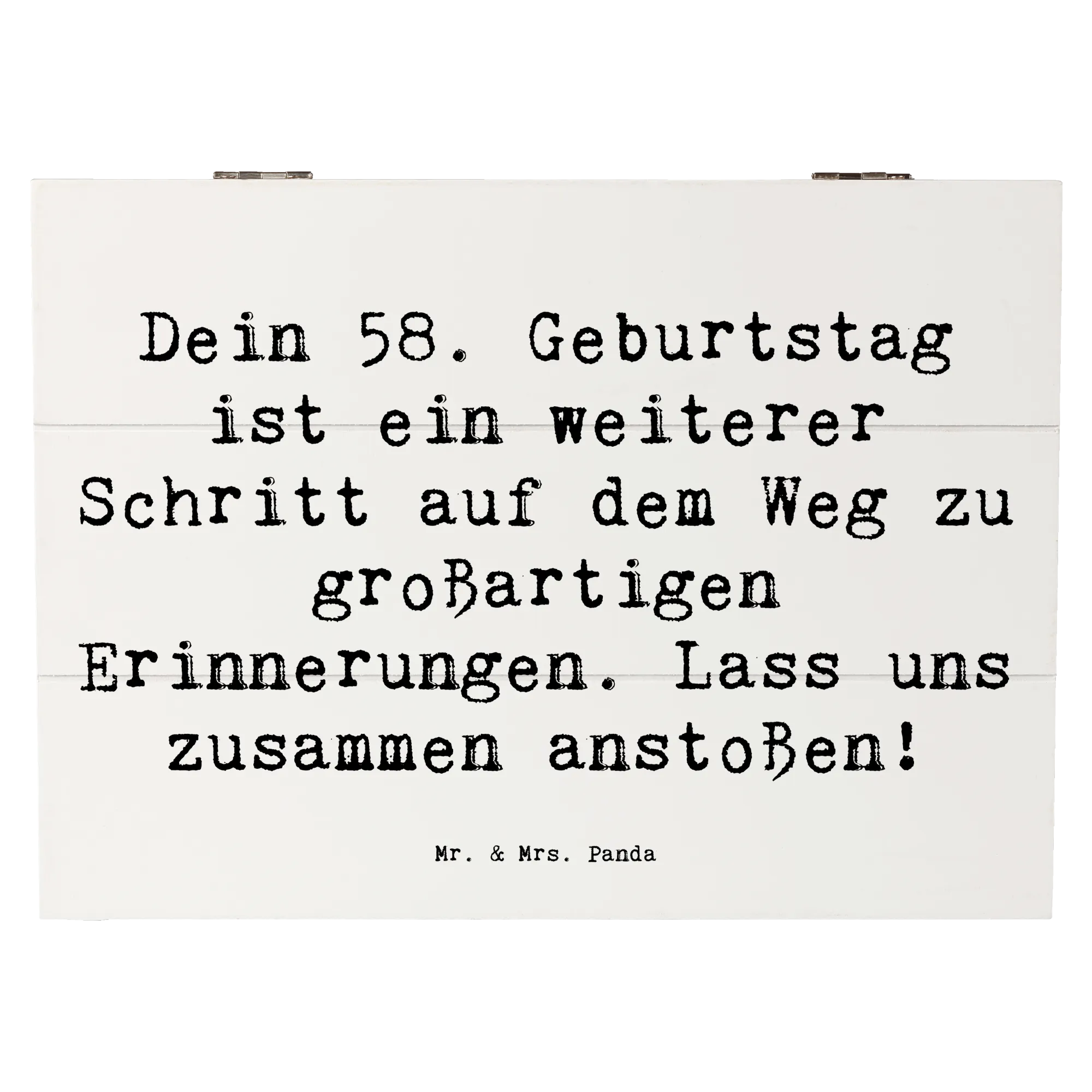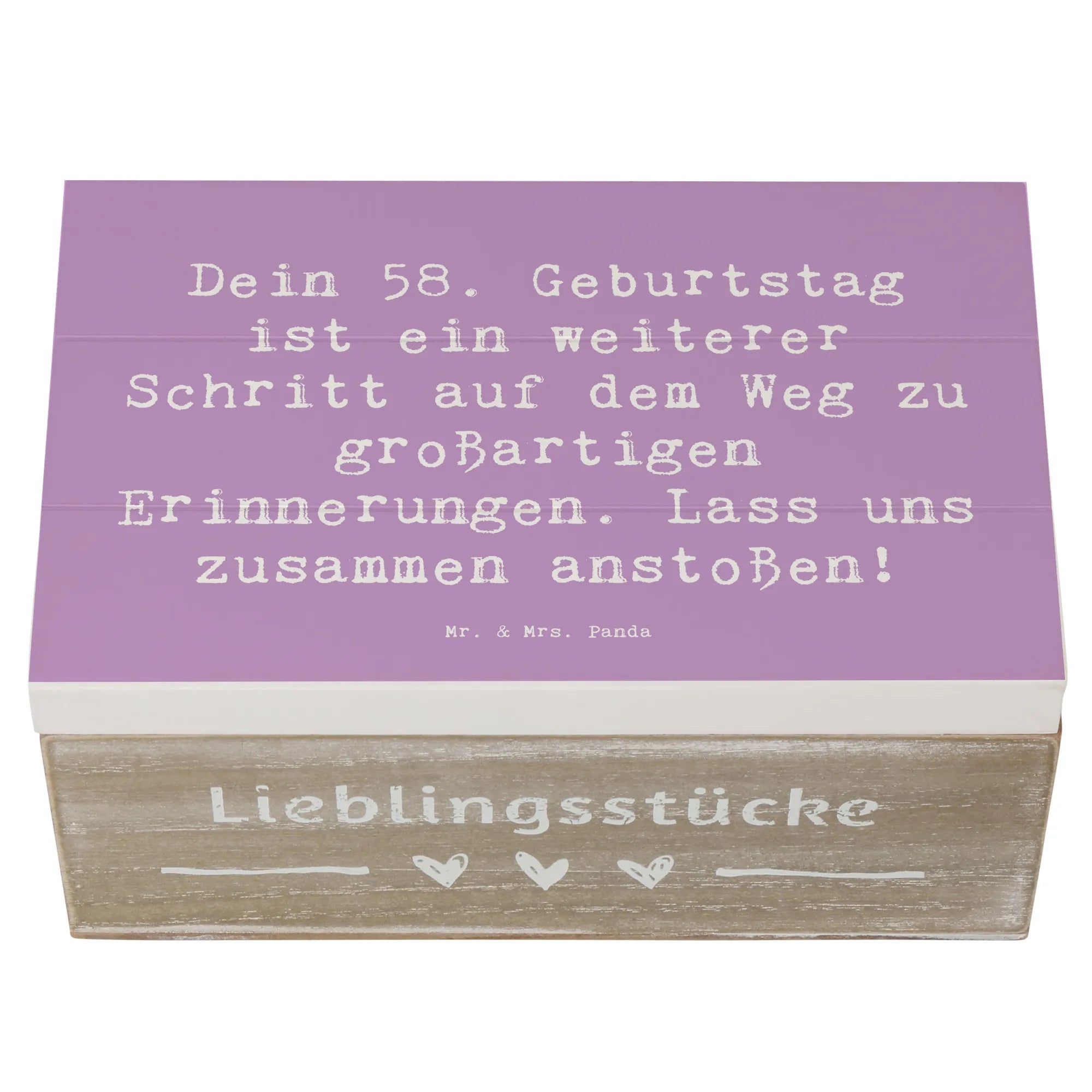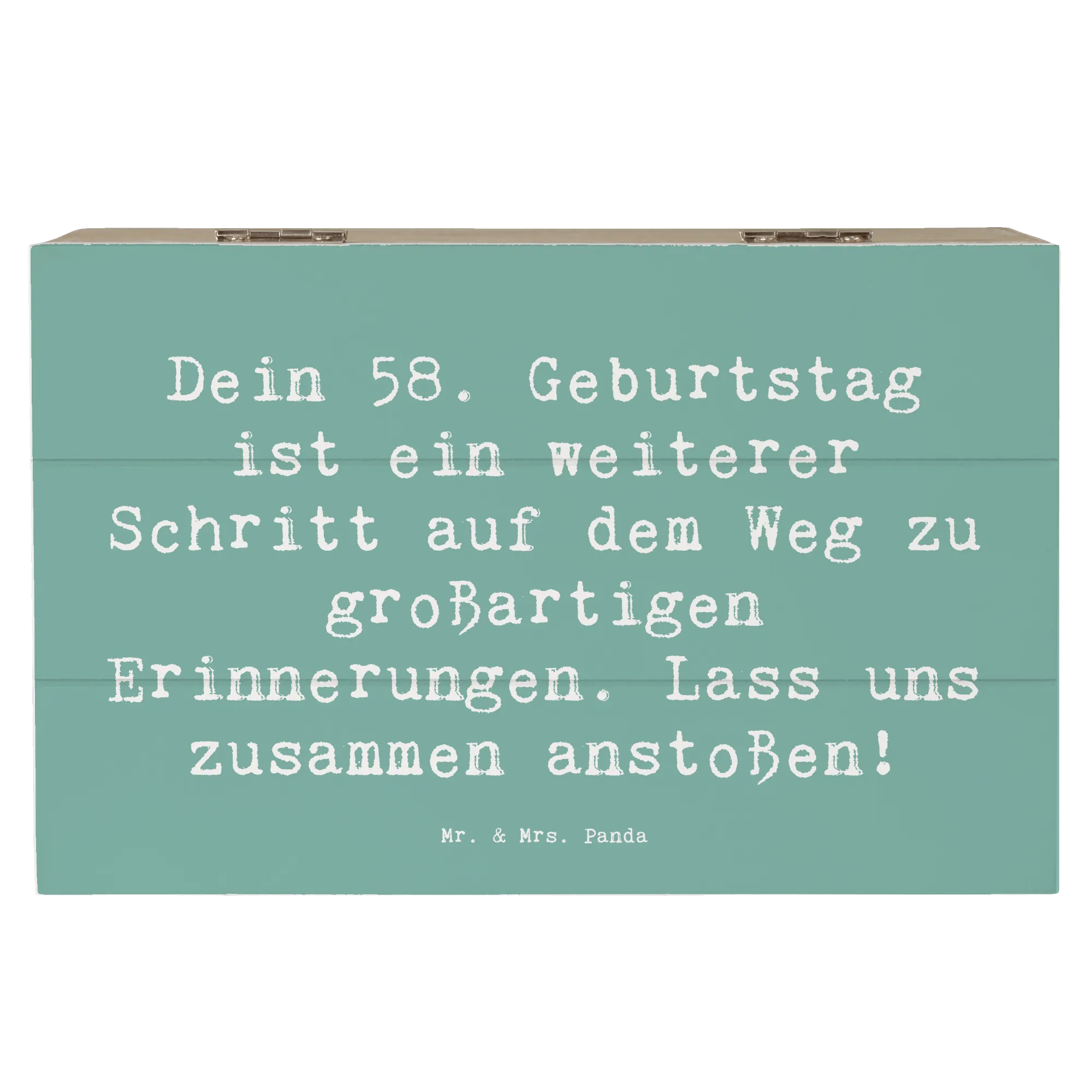 Entdecke die zauberhafte Holzkiste von Mr. & Mrs. Panda! Diese wunderschöne Kiste ist nicht nur ein echter Blickfang, sondern auch der perfekte Aufbewahrungsort für deine kostbarsten Erinnerungen. Ob für Fotos, kleine Schätze oder als Geschenkbox für einen unvergesslichen Anlass – mit einem liebevollen Design und dem Motto 'Dein 58. Geburtstag ist ein weiterer Schritt auf dem Weg zu großartigen Erinnerungen. Lass uns zusammen anstoßen!' sorgt diese Erinnerungskiste für das i-Tüpfelchen bei jedem Geburtstag.