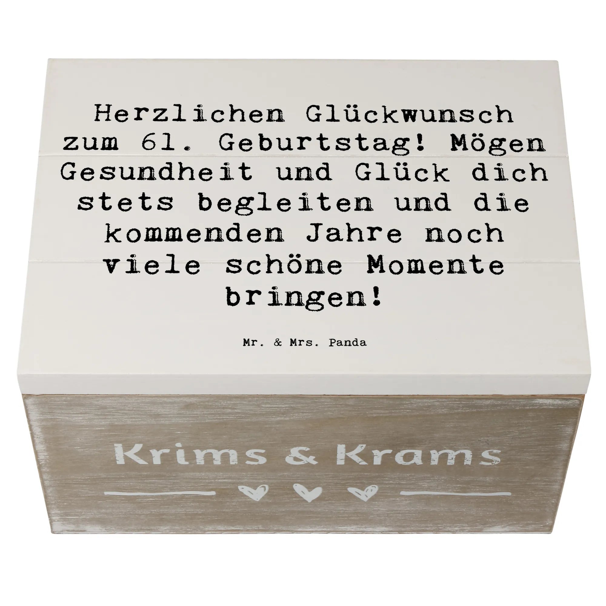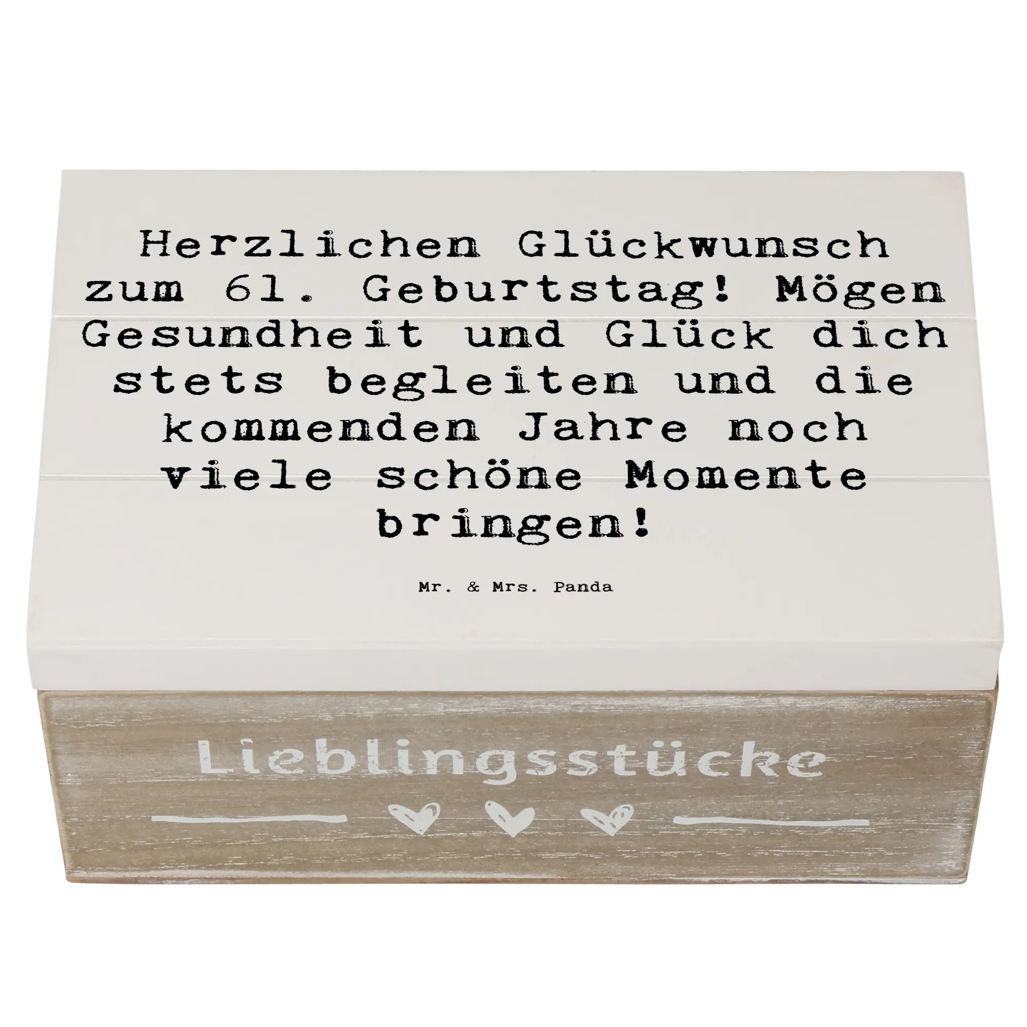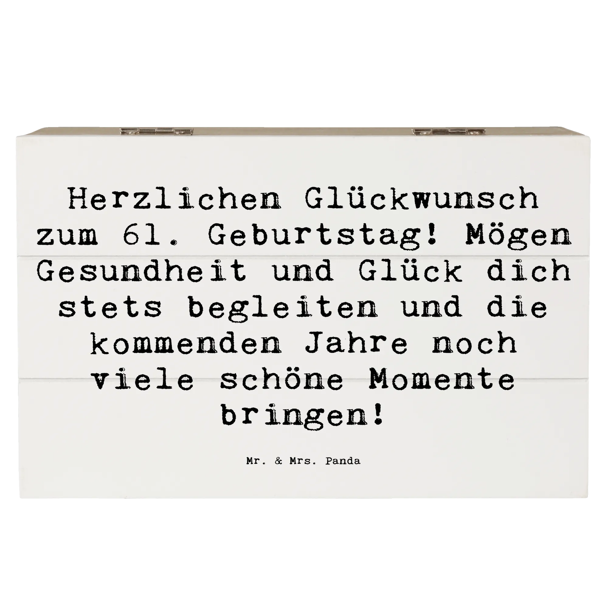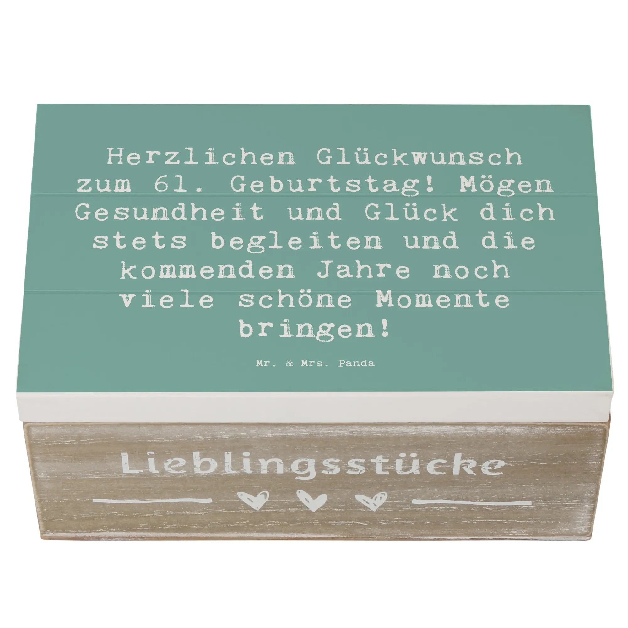 Die wunderschöne Holzkiste von Mr. & Mrs. Panda ist das ideale Geschenk zum 61. Geburtstag! Mit dem liebevollen Motiv und dem inspirierenden Spruch "Herzlichen Glückwunsch zum 61. Geburtstag! Mögen Gesundheit und Glück dich stets begleiten und die kommenden Jahre noch viele schöne Momente bringen!" ist diese Erinnerungskiste perfekt, um besondere Schätze und Erinnerungen aufzubewahren.