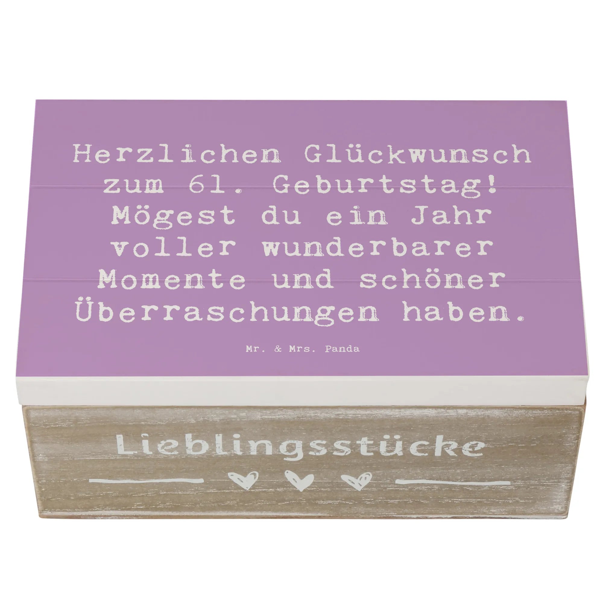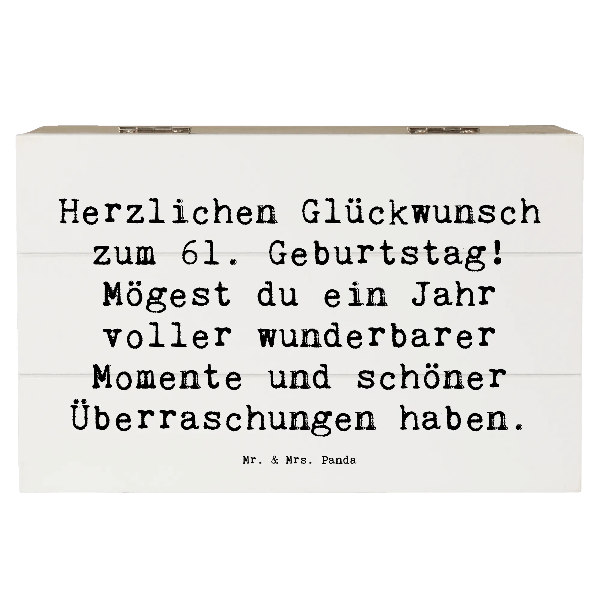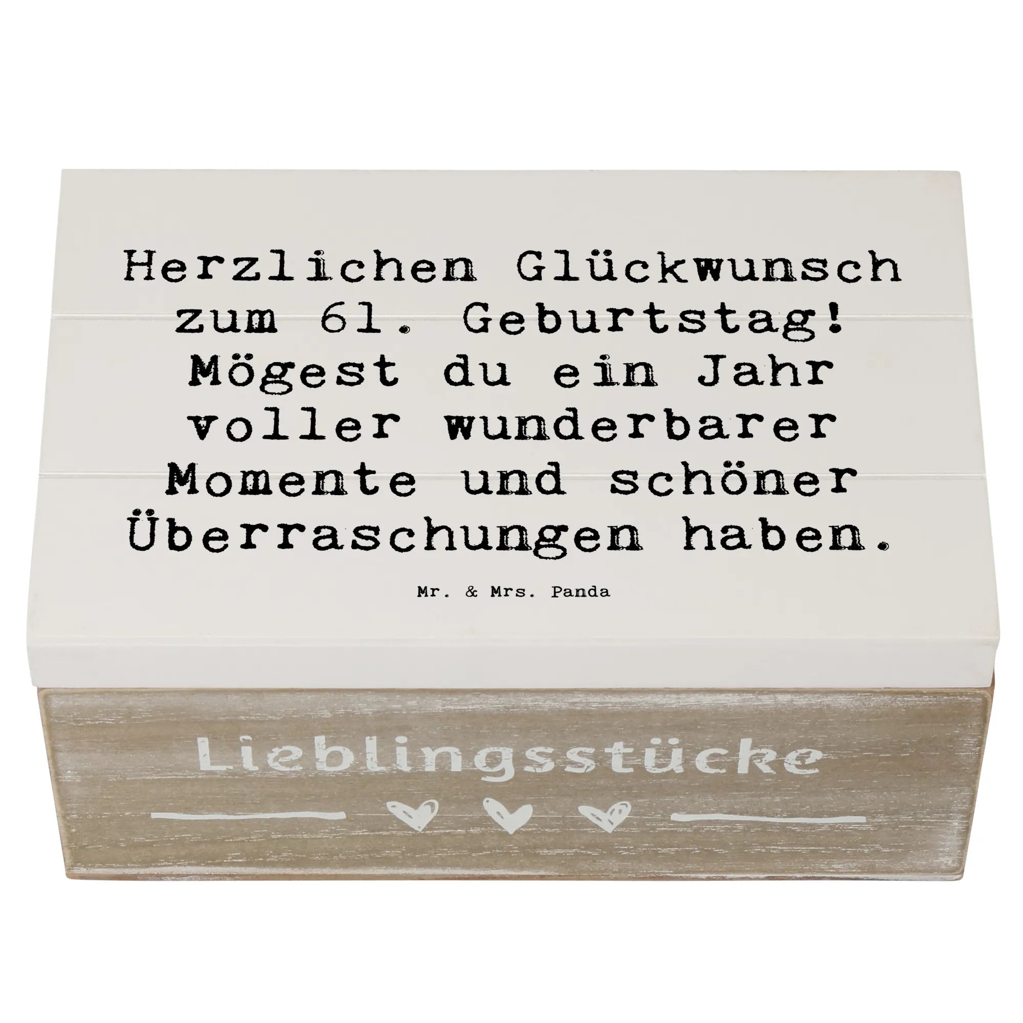 Die wunderschöne Holzkiste von Mr. & Mrs. Panda mit dem Motiv "Herzlichen Glückwunsch zum 61. Geburtstag! Mögest du ein Jahr voller wunderbarer Momente und schöner Überraschungen haben." ist das perfekte Geschenk für alle, die ihren 61. Geburtstag gebührend feiern möchten. Diese besonders stabile und liebevoll gestaltete Kiste besteht aus robuster Holzfaser und bietet ausreichend Platz, um besondere Erinnerungen, Fotos oder kleine Schätze sicher aufzubewahren.