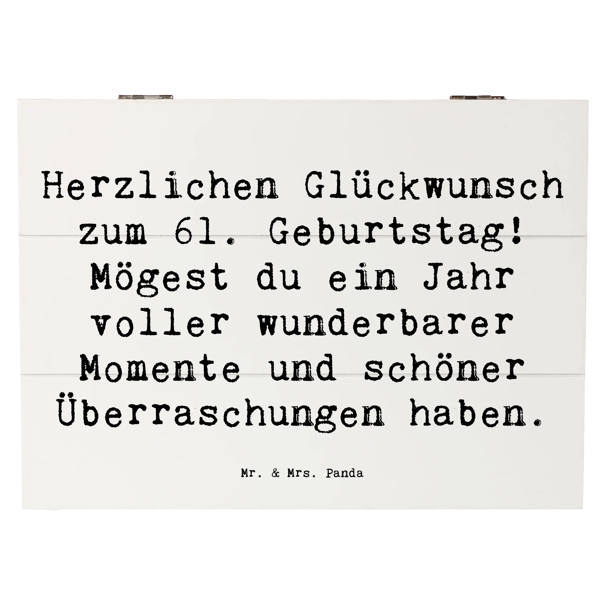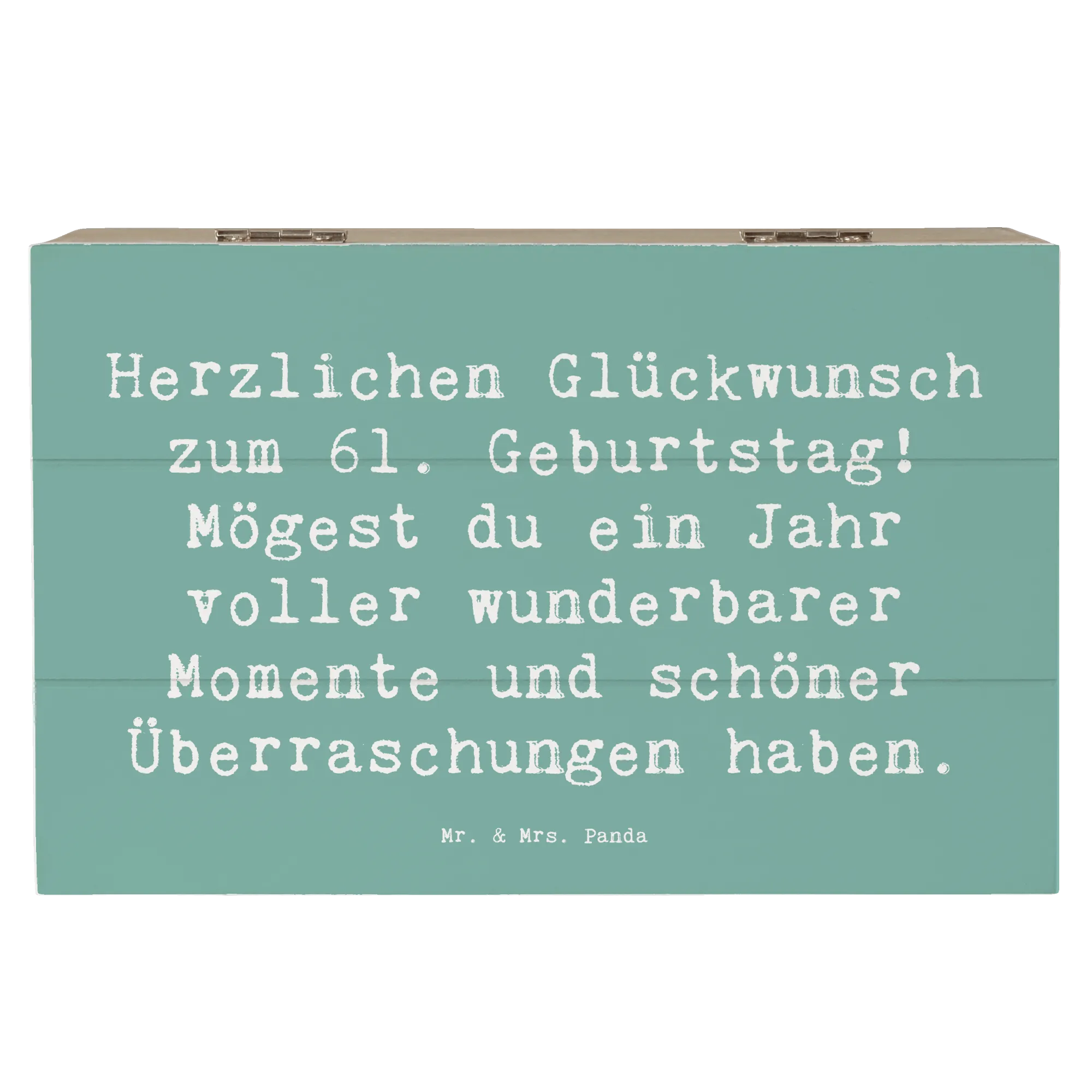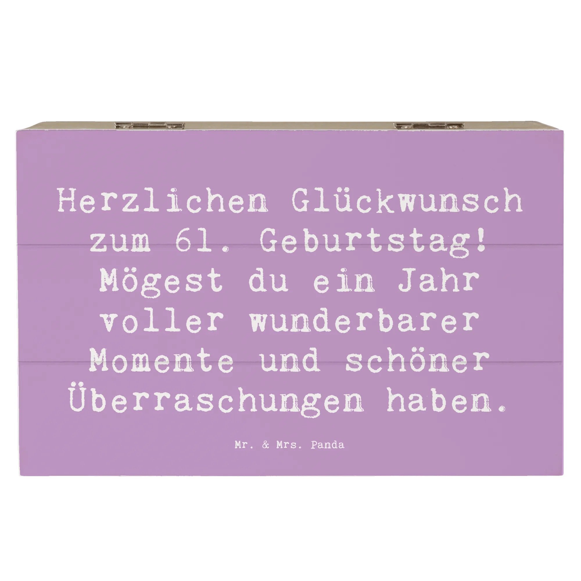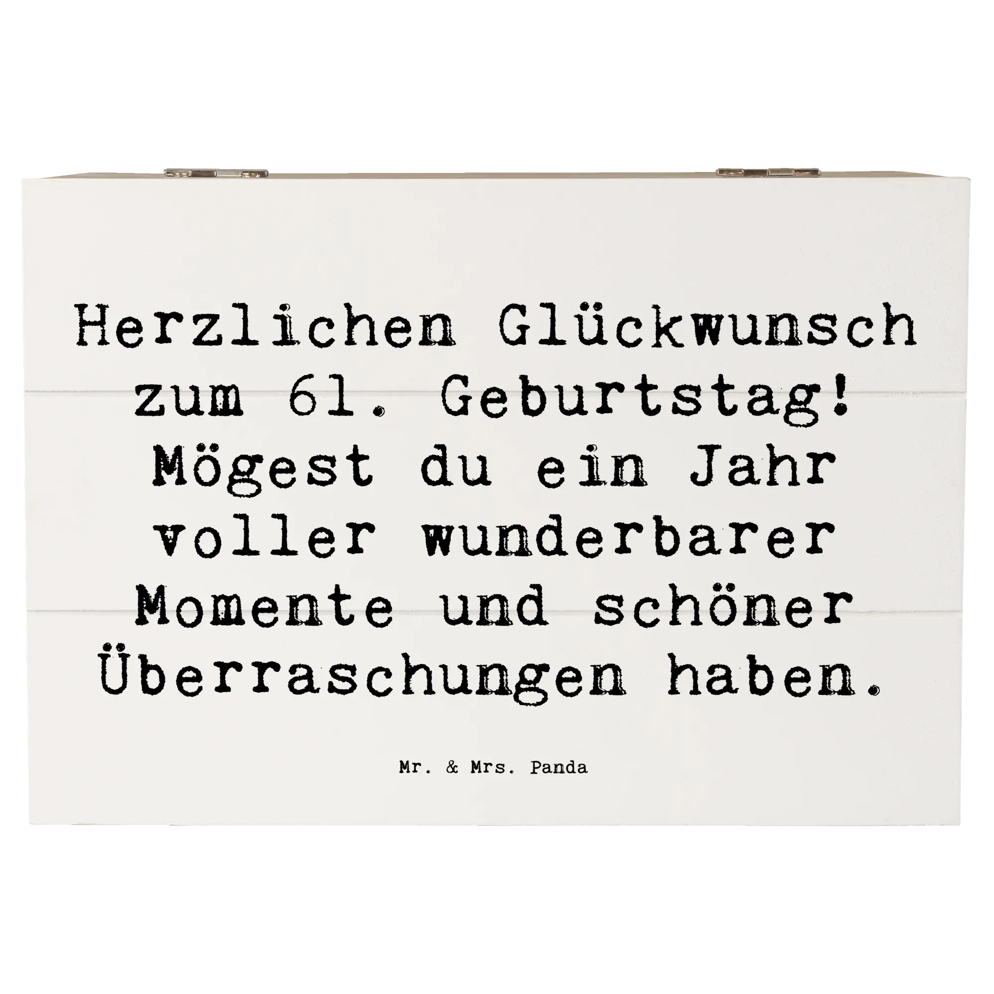 Die wunderschöne Holzkiste von Mr. & Mrs. Panda mit dem Motiv "Herzlichen Glückwunsch zum 61. Geburtstag! Mögest du ein Jahr voller wunderbarer Momente und schöner Überraschungen haben." ist das perfekte Geschenk für alle, die ihren 61. Geburtstag gebührend feiern möchten. Diese besonders stabile und liebevoll gestaltete Kiste besteht aus robuster Holzfaser und bietet ausreichend Platz, um besondere Erinnerungen, Fotos oder kleine Schätze sicher aufzubewahren.