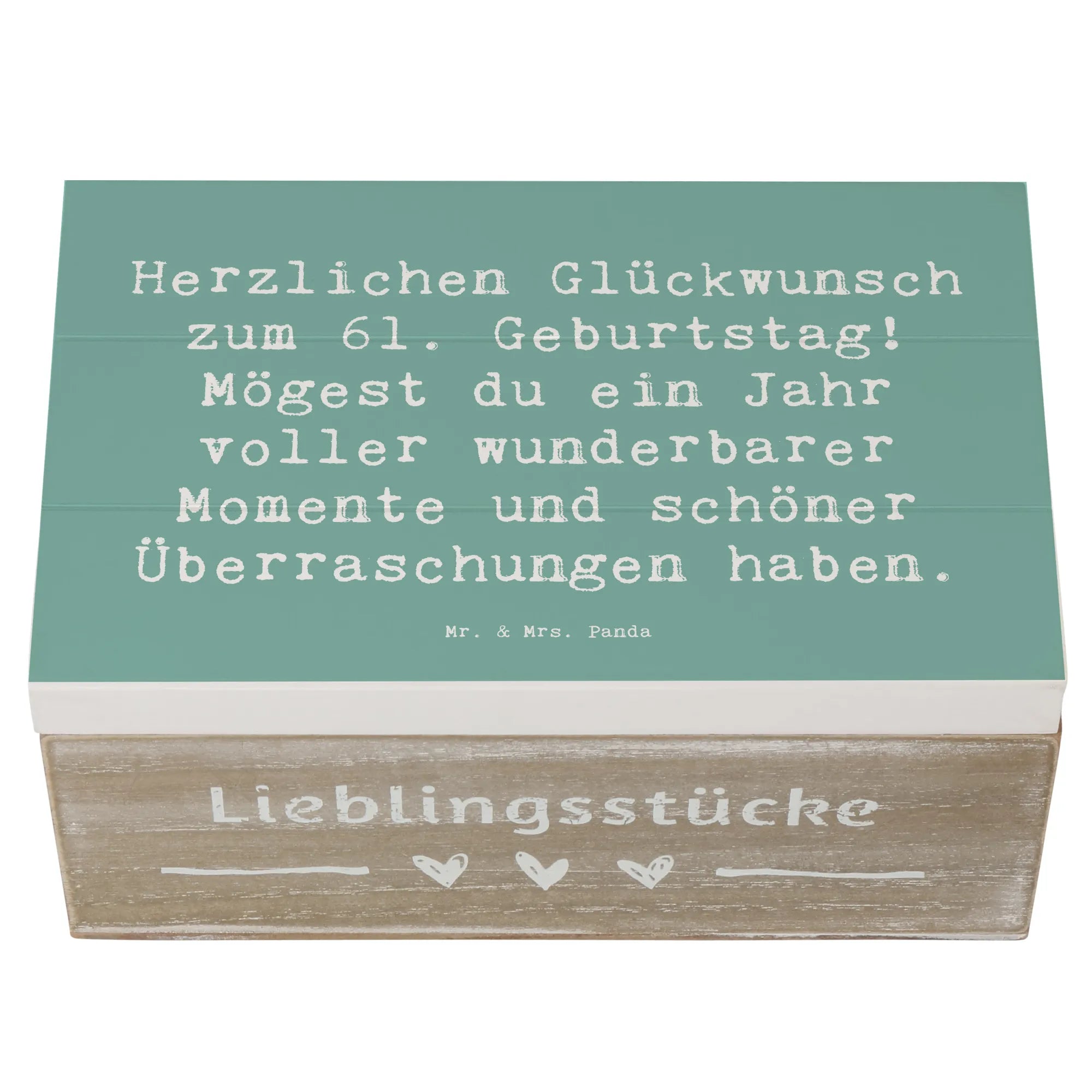 Die wunderschöne Holzkiste von Mr. & Mrs. Panda ist das perfekte Geschenk zum 61. Geburtstag! Mit dem liebevollen Slogan 'Herzlichen Glückwunsch zum 61. Geburtstag! Mögest du ein Jahr voller wunderbarer Momente und schöner Überraschungen haben.' bringt sie Freude und einzigartige Erinnerungen. Diese stabile Kiste aus robuster Holzfaser eignet sich ideal, um besondere Schätze aufzubewahren, sei es für Erinnerungen an die Kindheit, unvergessliche Urlaubsfotos oder einfach als dekoratives Element in deinem Zuhause.