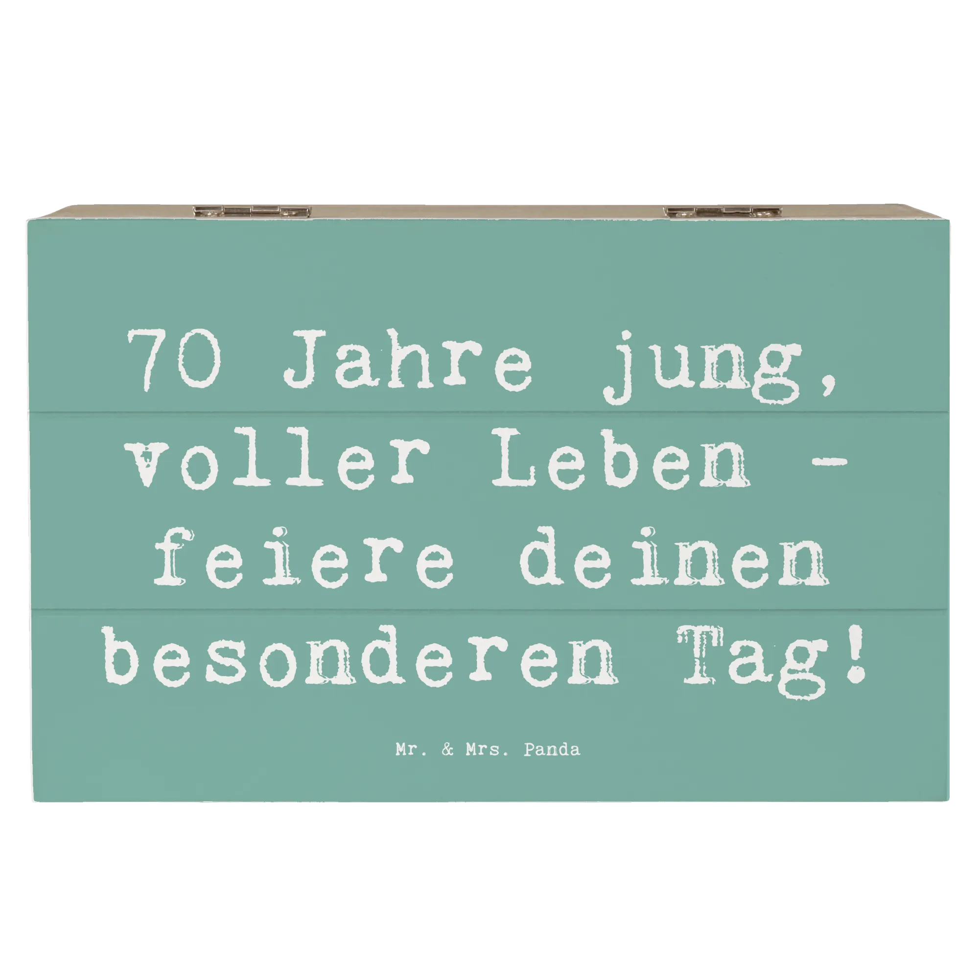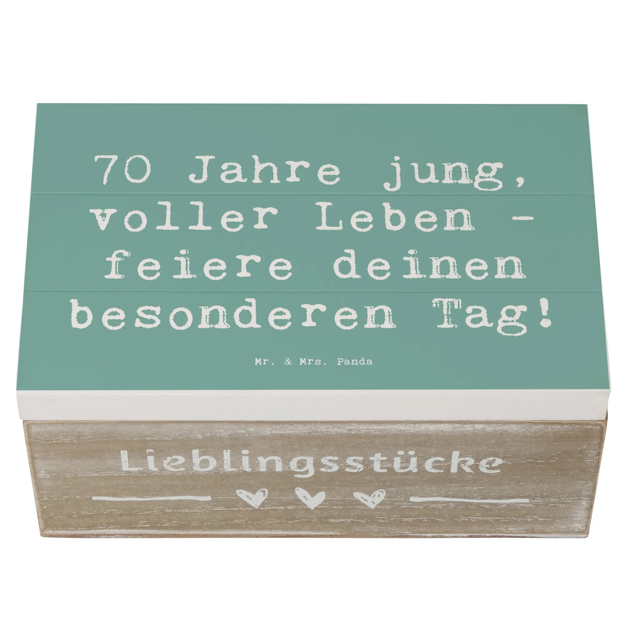 Die Holzkiste "70 Jahre jung, voller Leben - feiere deinen besonderen Tag!" aus der Geburtstag Alter Kollektion von Mr. & Mrs. Panda ist das perfekte Geschenk für jeden, der diesen ganz besonderen 70. Geburtstag feiert. Egal, ob für deinen lieben Freund, deine Mama oder einen ganz besonderen Verwandten – mit dieser wunderschönen Erinnerungskiste machst du allen eine Freude!