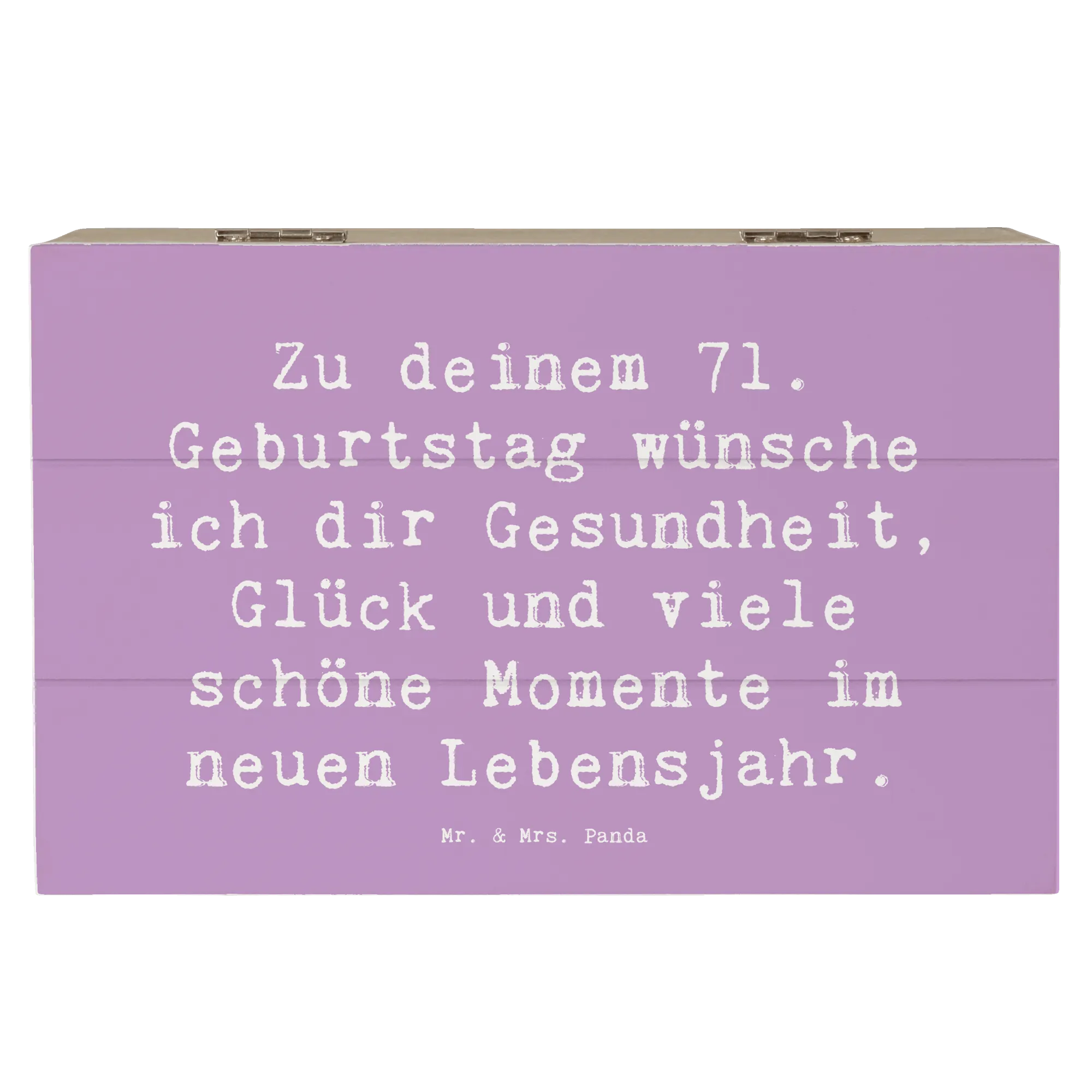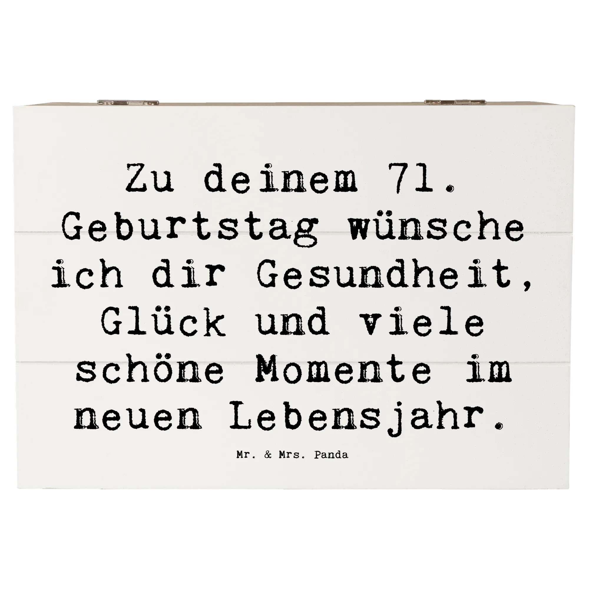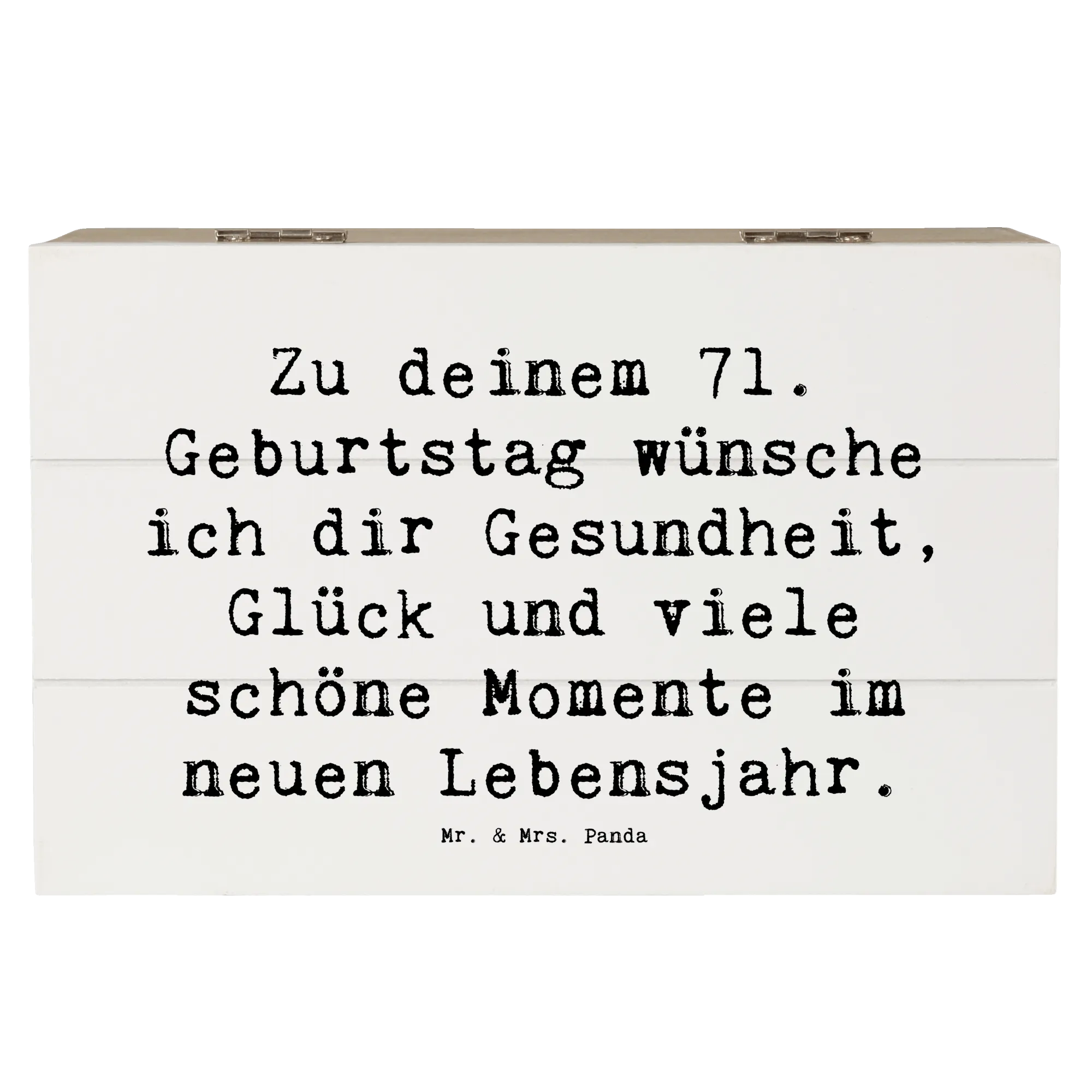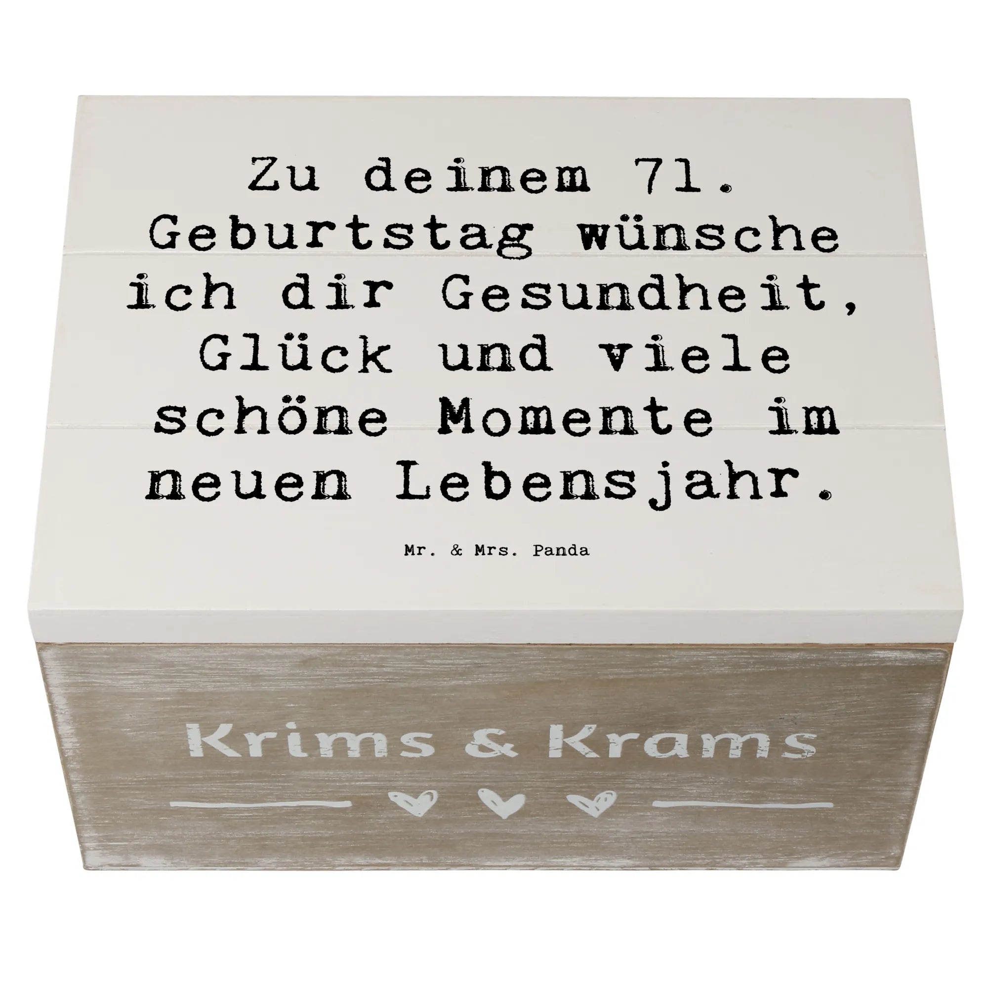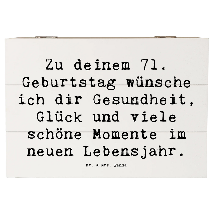 Schenke etwas Besonderes zum 71. Geburtstag! Diese traumhafte Holzkiste von Mr. & Mrs. Panda ist das ideale Geschenk für diesen besonderen Anlass. Die liebevoll gestaltete Kiste, bedruckt mit dem herzlichen Spruch 'Zu deinem 71. Geburtstag wünsche ich dir Gesundheit, Glück und viele schöne Momente im neuen Lebensjahr.', hat nicht nur ein wunderschönes Design, sondern bietet auch jede Menge Platz für die wertvollen Schätze und Erinnerungen des Geburtstagskindes.