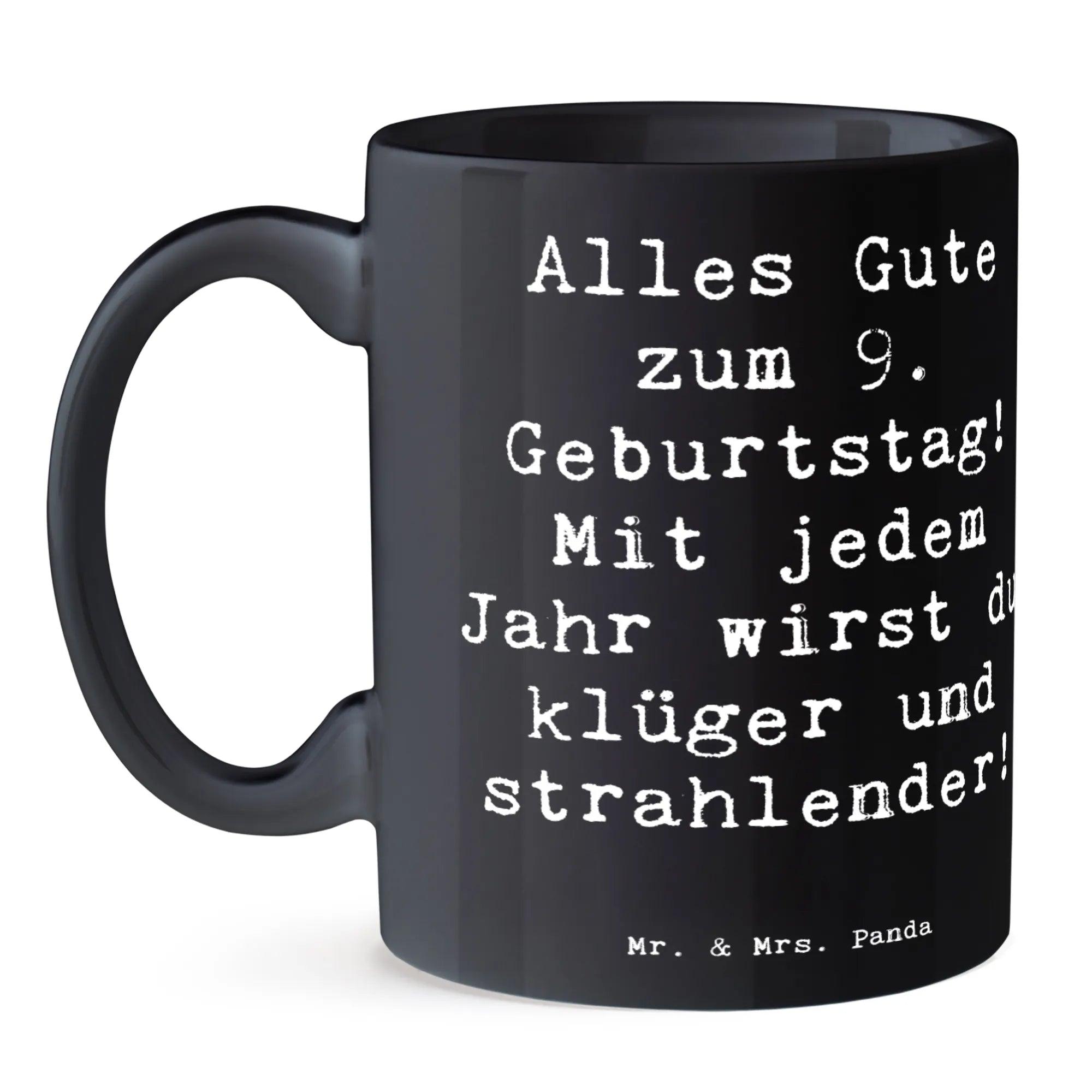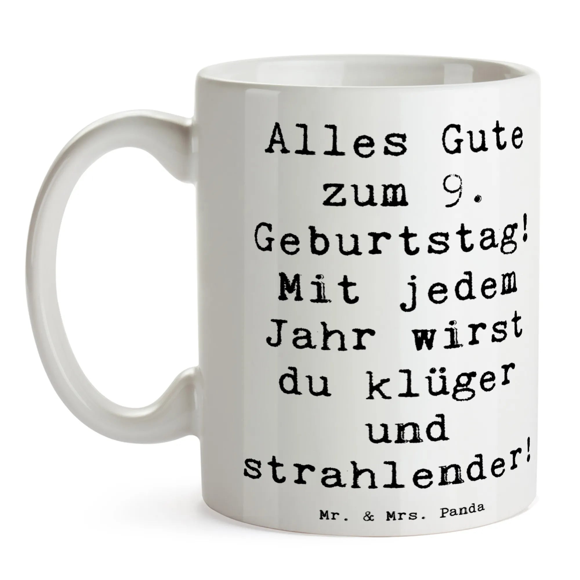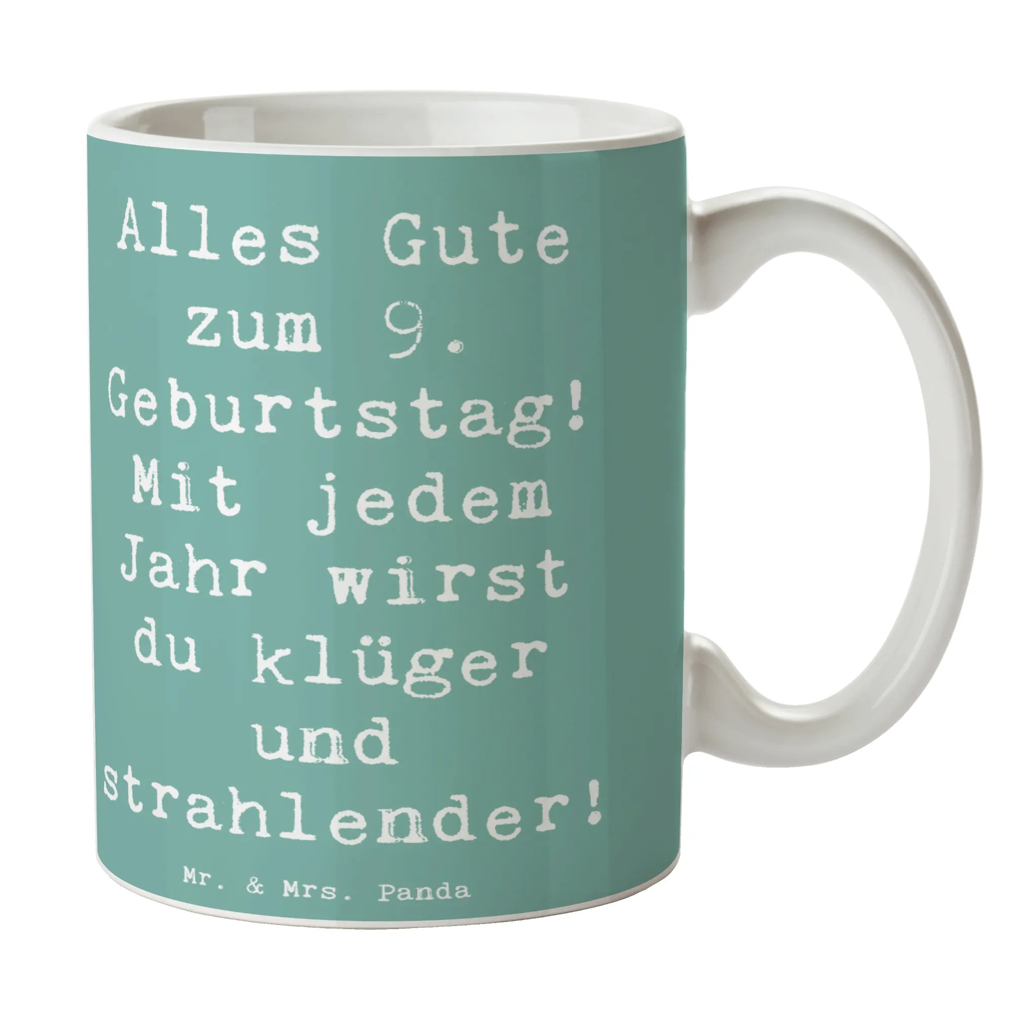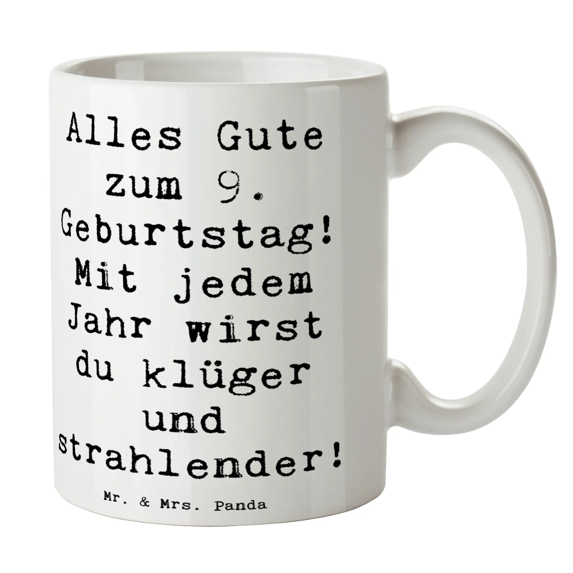 Die bezaubernde Tasse zum 9. Geburtstag von Mr. & Mrs. Panda ist das perfekte Geschenk für jeden kleinen Lieblingsmenschen. Sie ist nicht nur schön anzusehen, sondern auch mit einem herzlichen Spruch versehen: "Alles Gute zum 9. Geburtstag! Mit jedem Jahr wirst du klüger und strahlender!". Diese Keramiktasse mit einer Füllmenge von 325 ml ist ideal für leckeren Kakao, Tee oder Kaffee und wird schnell zum Lieblingsbecher.