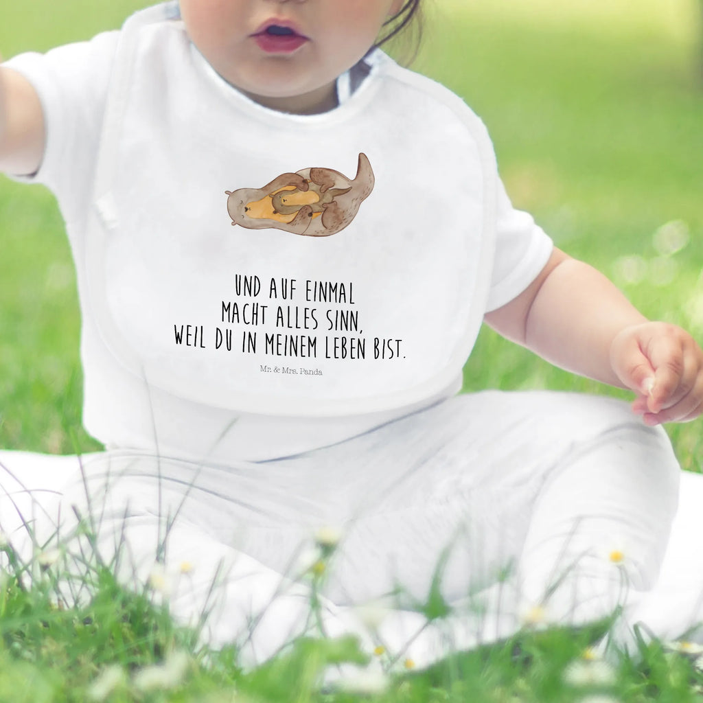 Das charmante Motiv zeigt einen liebevollen Otter und sein Kind, das sich aneinander schmiegt – das Symbol für Geborgenheit und familiäre Wärme. Ideal als Babygeschenk zur Geburt oder als Geschenkidee für eine Babyparty, wird dieses Lätzchen jedem Baby und seinen Eltern ein Lächeln ins Gesicht zaubern.