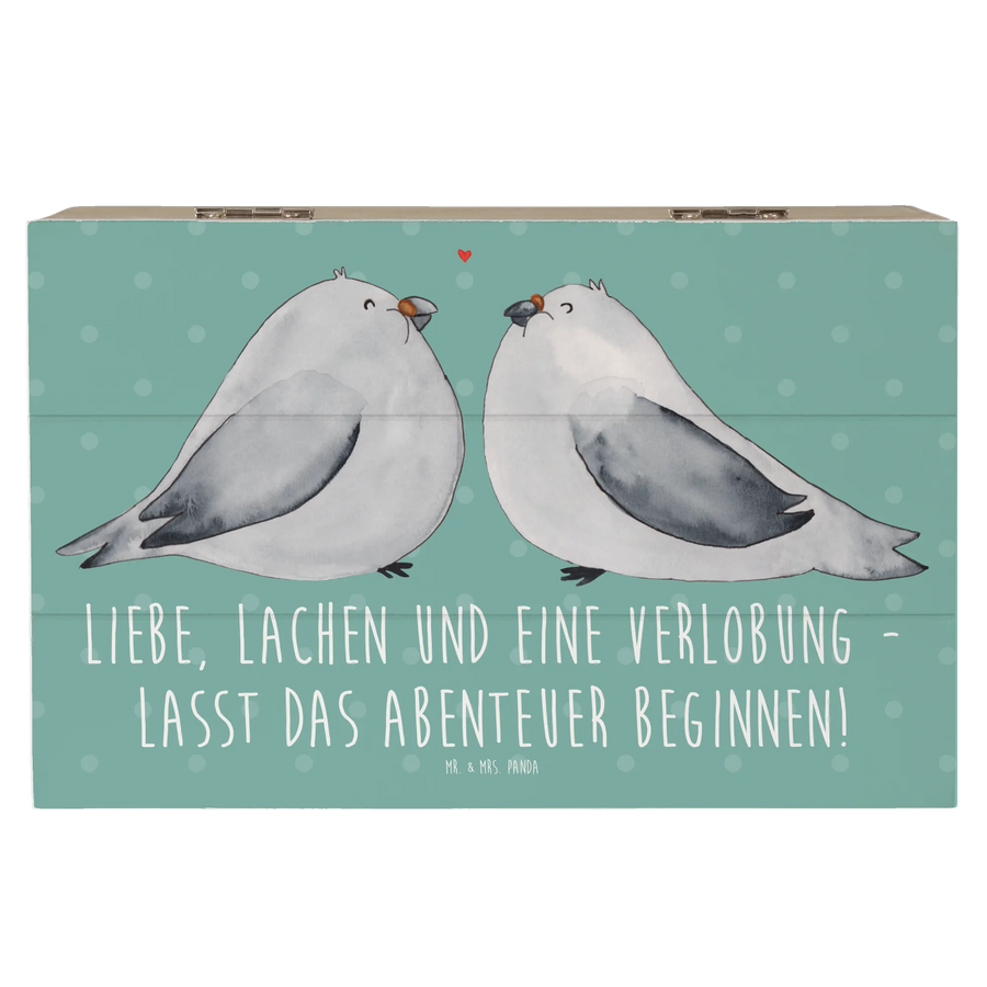 Die wunderschöne Holzkiste von Mr. & Mrs. Panda zur Verlobungsfeier ist das perfekte Geschenk für das frisch verlobte Paar! Mit dem zauberhaften Motiv und dem liebevoll gestalteten Spruch "Liebe, Lachen und eine Verlobung - lasst das Abenteuer beginnen!" wird diese Erinnerungskiste zum idealen Aufbewahrungsort für all die besonderen Momentaufnahmen und Schätze, die während dieser aufregenden Zeit gesammelt werden. Egal, ob Fotos von dem besonderen Heiratsantrag, Briefe mit süßen Worten oder kleine Erinnerungsstücke - diese Holzkiste ist ein wahrer Schatz!