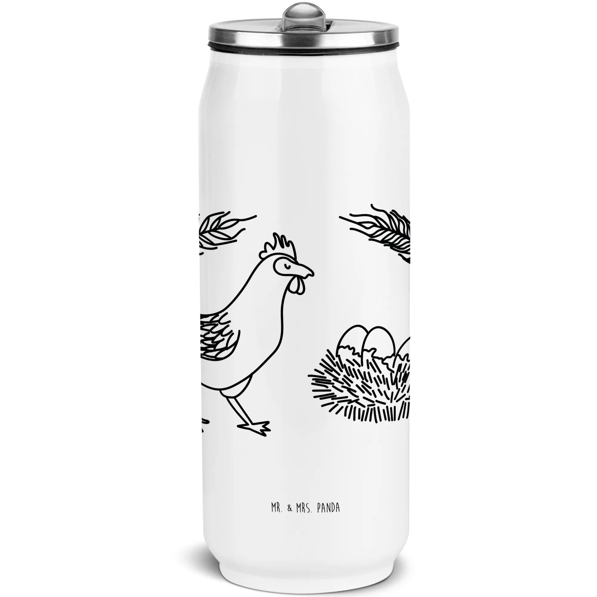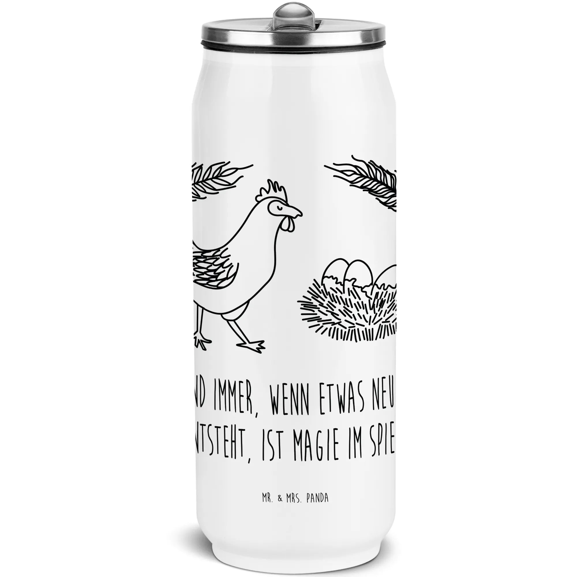 Mr. & Mrs. Panda Getränkedosen Trinkflasche „Huhn stolz“ – die ideale Mischung aus Bauernhof-Charme und moderner Isolierflasche. Unsere Thermoflasche im beliebten Getränkedosen-Look bringt Dir Berta Henne direkt ins Leben: Ein süßes Huhn, das stolz durch den Tag stolziert und Dich mit dem Spruch begrüßt: Und immer, wenn etwas neues entsteht, ist Magie im Spiel.