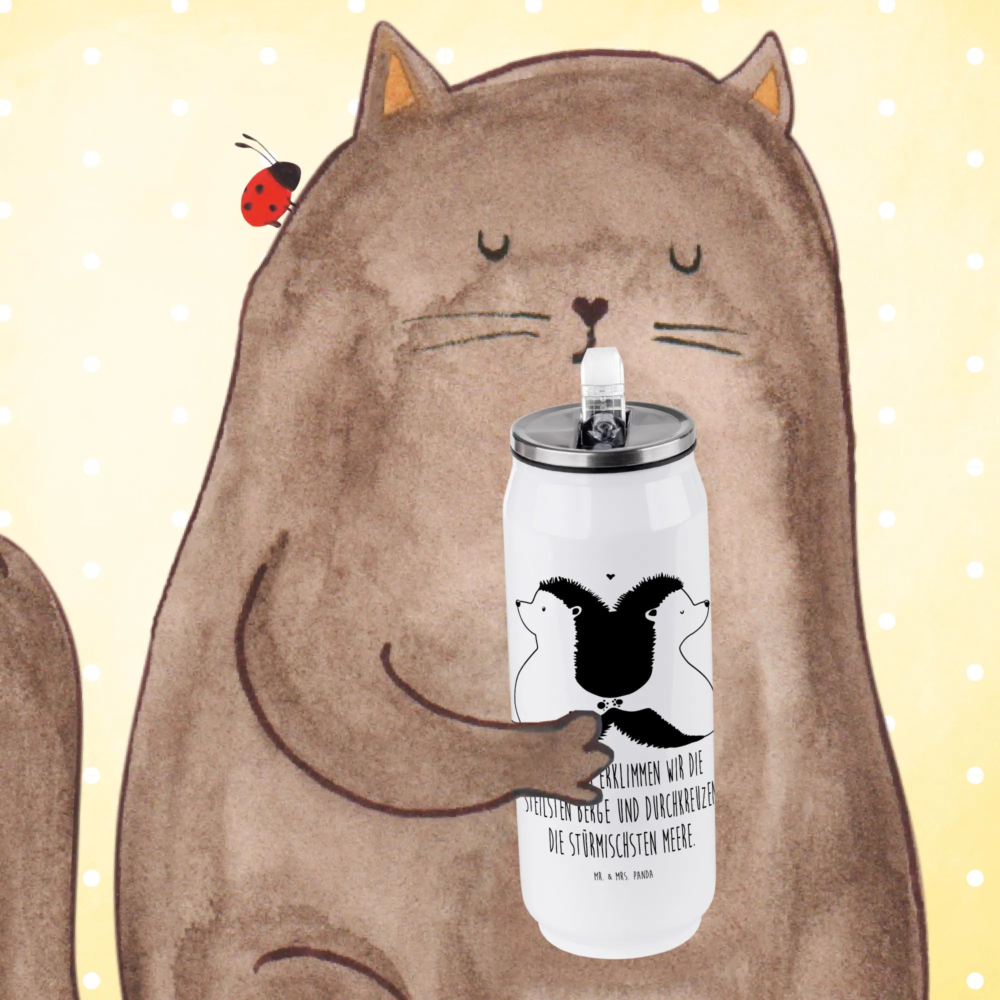 Die Edelstahl Getränkedosen Trinkflasche mit dem bezaubernden Motiv der händchenhaltenden Igel von Mr. & Mrs. Panda ist das perfekte Geschenk für Verliebte oder Menschen, die viel Wert auf die kleinen Dinge im Leben. Diese edle Flasche vereint Funktionalität und liebevolles Design in einem.