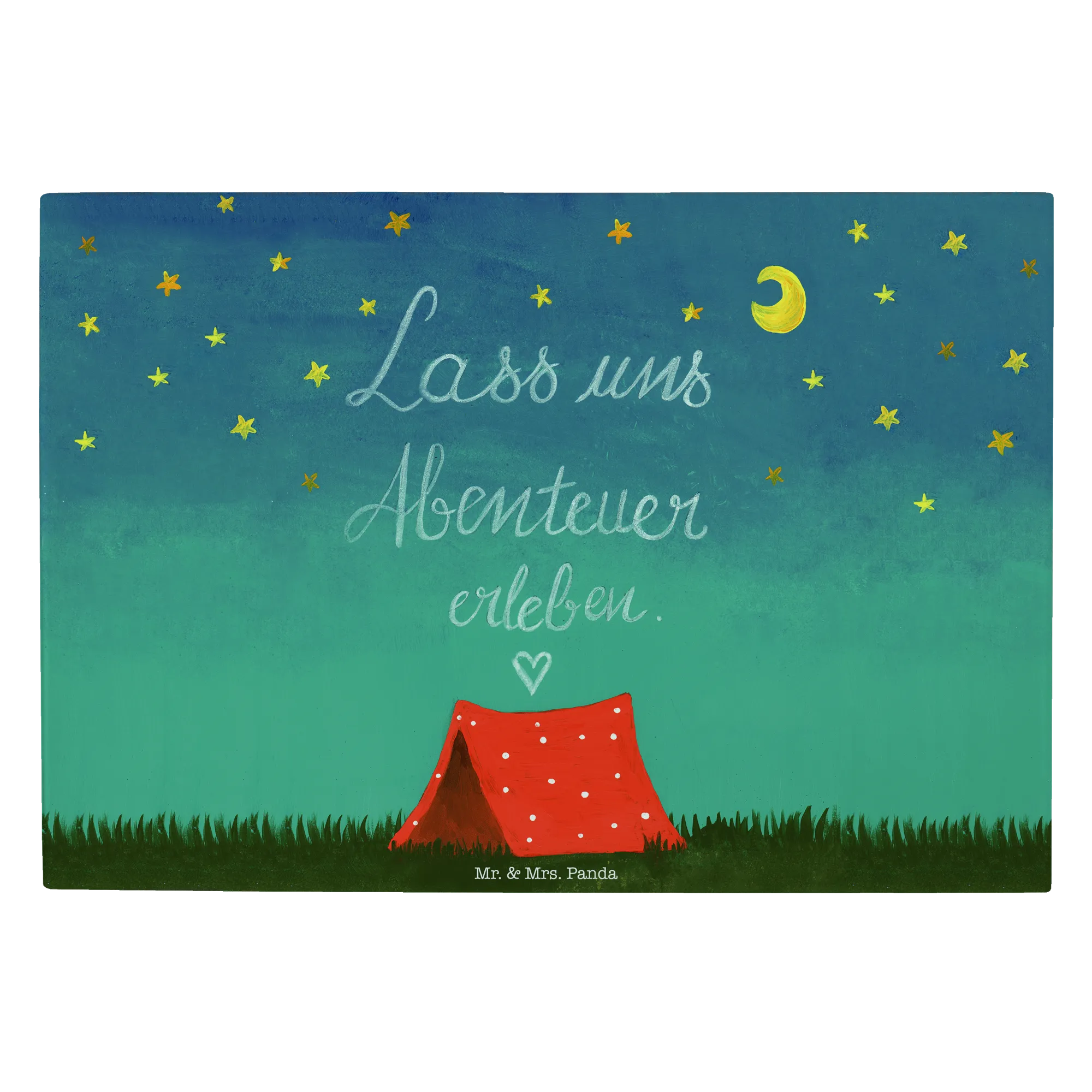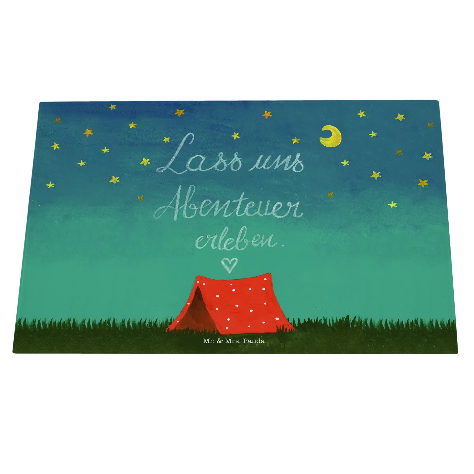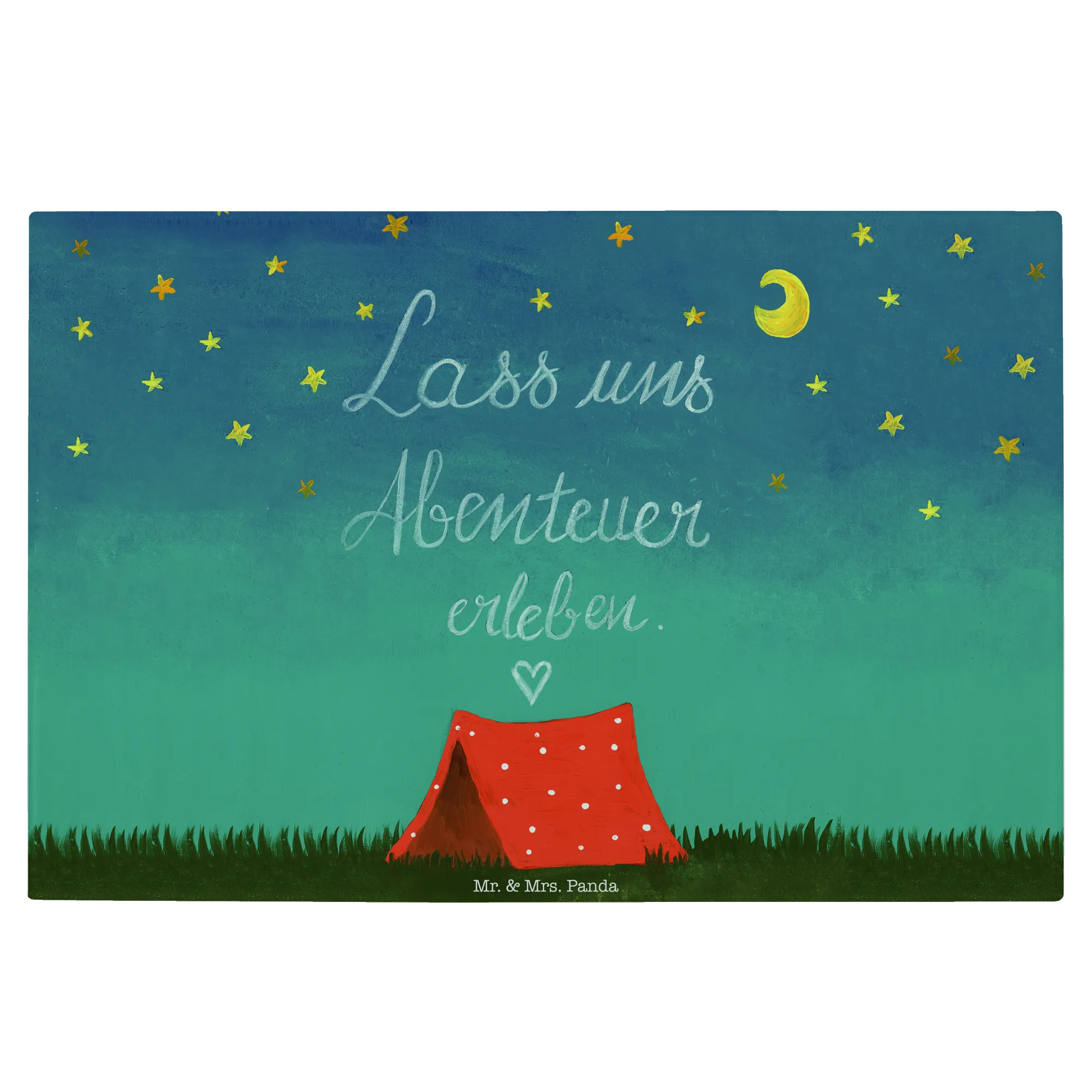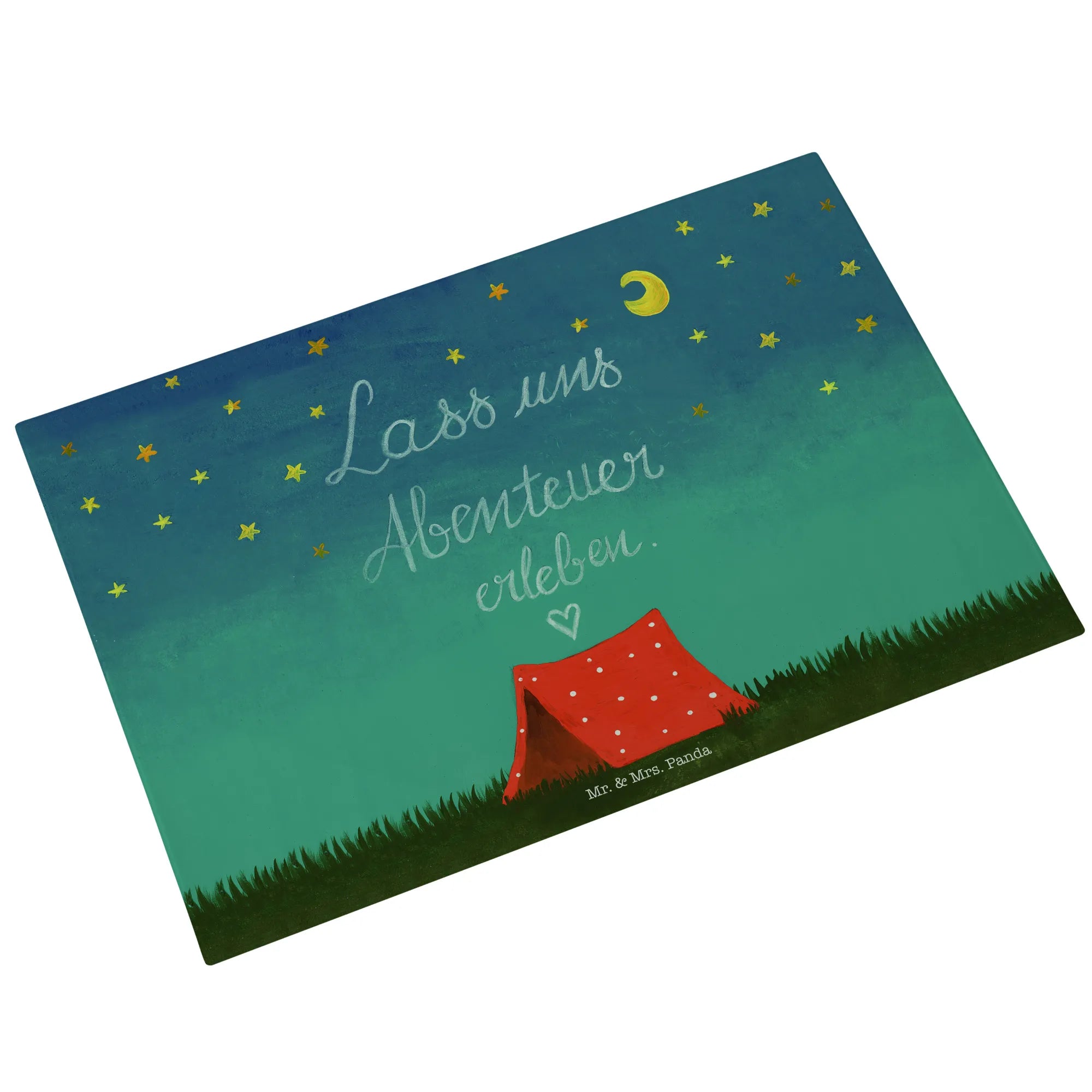Mr. & Mrs. Panda Medium Glas Schneidebrett „Abenteuer“ – Ein zauberhaftes, handgezeichnetes Motiv aus der Collection Wild & Free, das Fernweh und Zusammenhalt in deine Küche bringt. Das Motiv zeigt die Lust auf Aufbruch und trägt den liebevollen Slogan „Lass uns Abenteuer erleben!“. Ein perfektes Geschenk für Naturliebhaber, Camper, Backpacker oder Paare, die das Draußen lieben. 🌿