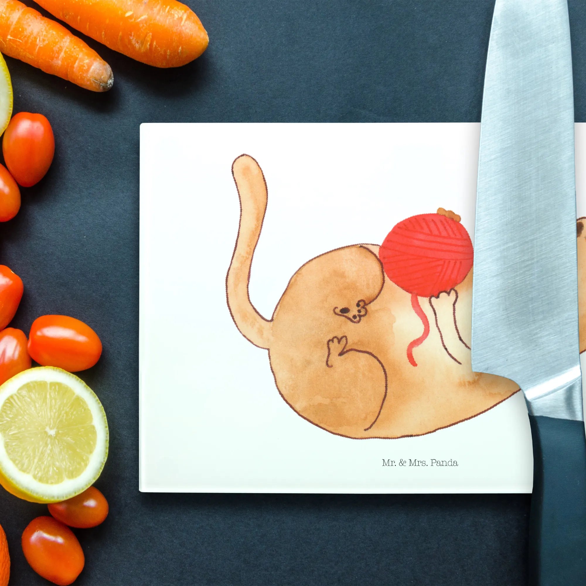 Entdecke unser XL Glas Schneidbrett mit dem zauberhaften Katzenmotiv 'Wollknäul' aus der Katzen - Kollektion von Mr. & Mrs. Panda! Dieses einzigartige und stabile Schneidbrett ist nicht nur ein echter Hingucker in deiner Küche, sondern auch ein praktisches Küchenutensil. Egal ob für die tägliche Zubereitung deiner Speisen oder für ein stilvolles Frühstück, dieses Bord ist vielseitig einsetzbar. Die liebevoll handgezeichnete Katze, die mit ihrem Wollknäuel spielt, bringt eine verspielte Note in dein Zuhause und begeistert Katzenliebhaber und -fans gleichermaßen.