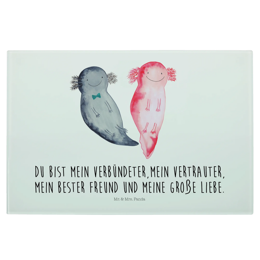 Das Medium Glas Schneidbrett mit dem niedlichen Motiv Axolotl Axel+Lotte aus der Axolotl Kollektion von Mr. & Mrs. Panda ist der perfekte Begleiter in deiner Küche. Ob zum Schneiden von frischem Gemüse oder für die Zubereitung deiner Lieblingsgerichte, dieses Schneidebrett kombiniert Funktionalität mit einem liebevollen Design. Die beiden süßen Axolotl schwimmen Seite an Seite und bringen Freude in deine Küchenarbeit.
