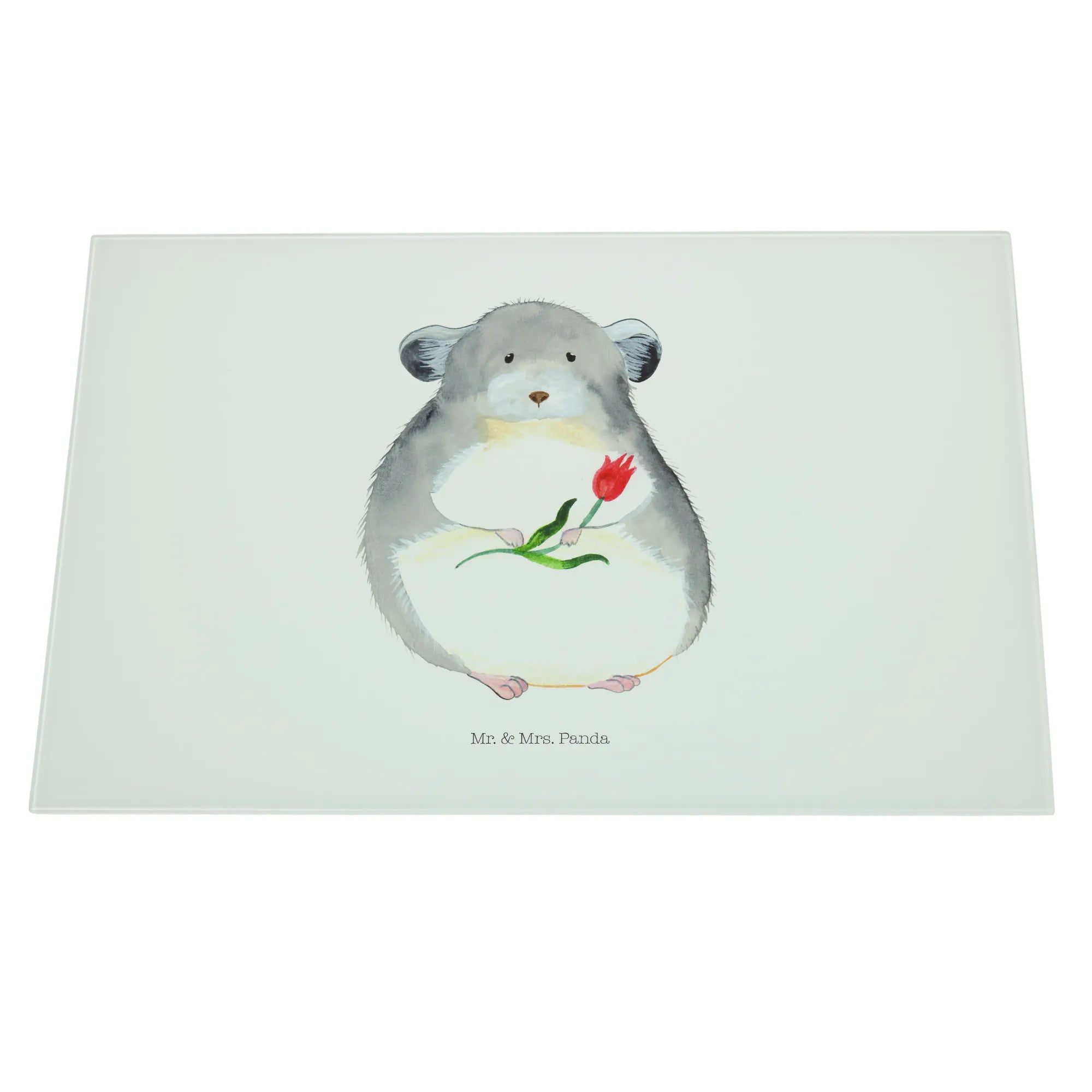Das XL Glas Schneidbrett "Chinchilla mit Blume" aus der Kollektion Small World von Mr. & Mrs. Panda ist nicht nur ein praktisches Küchenutensil, sondern auch ein wahrer Hingucker! Der süße Chinchilla mit einer Blume in der Hand bringt Freude und ein wenig Farbe in deine Küche.