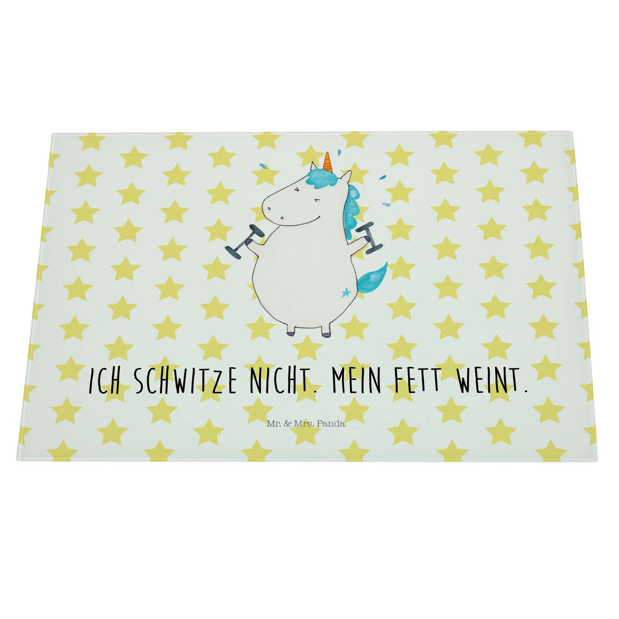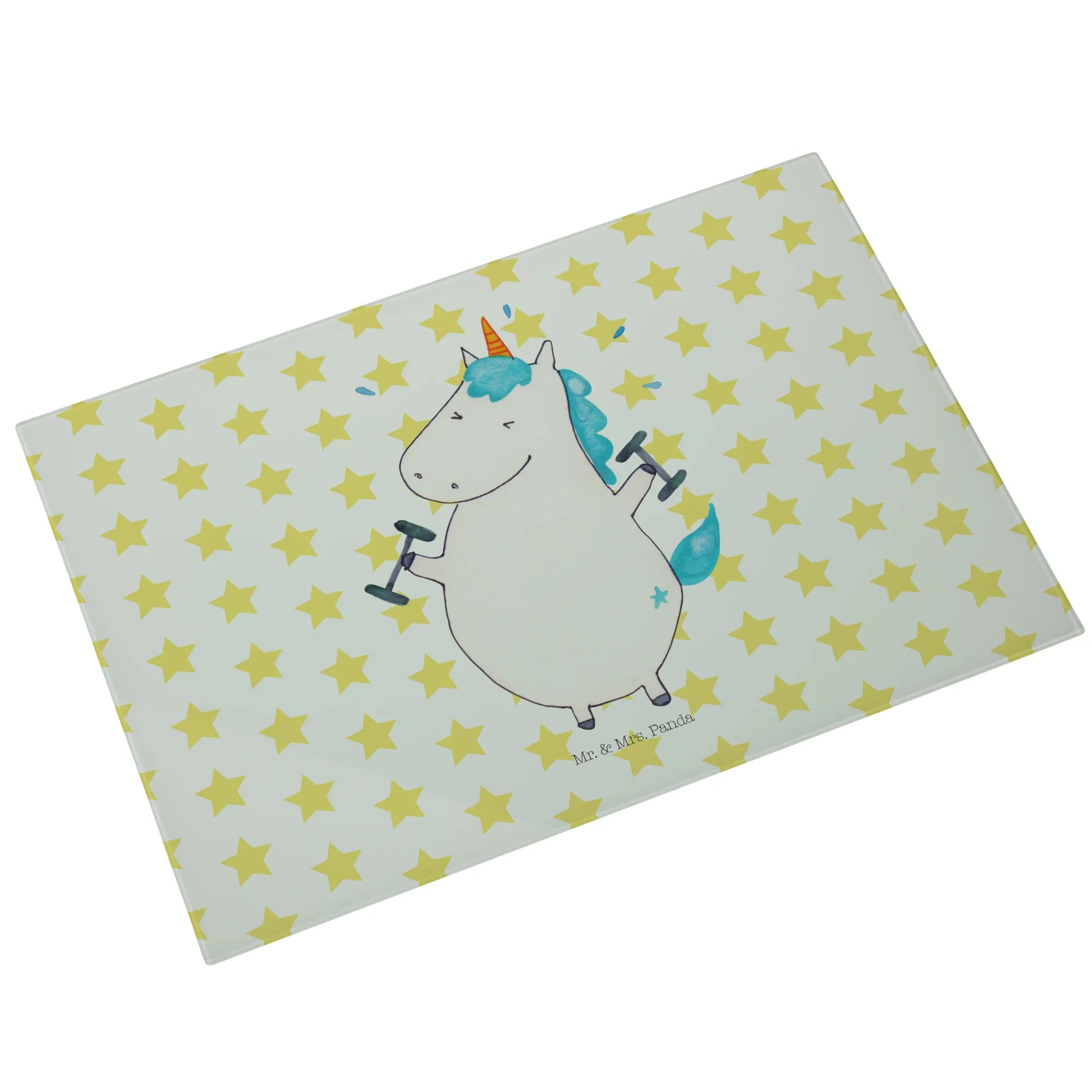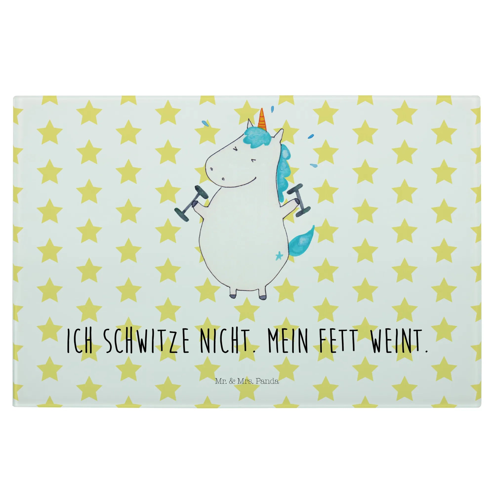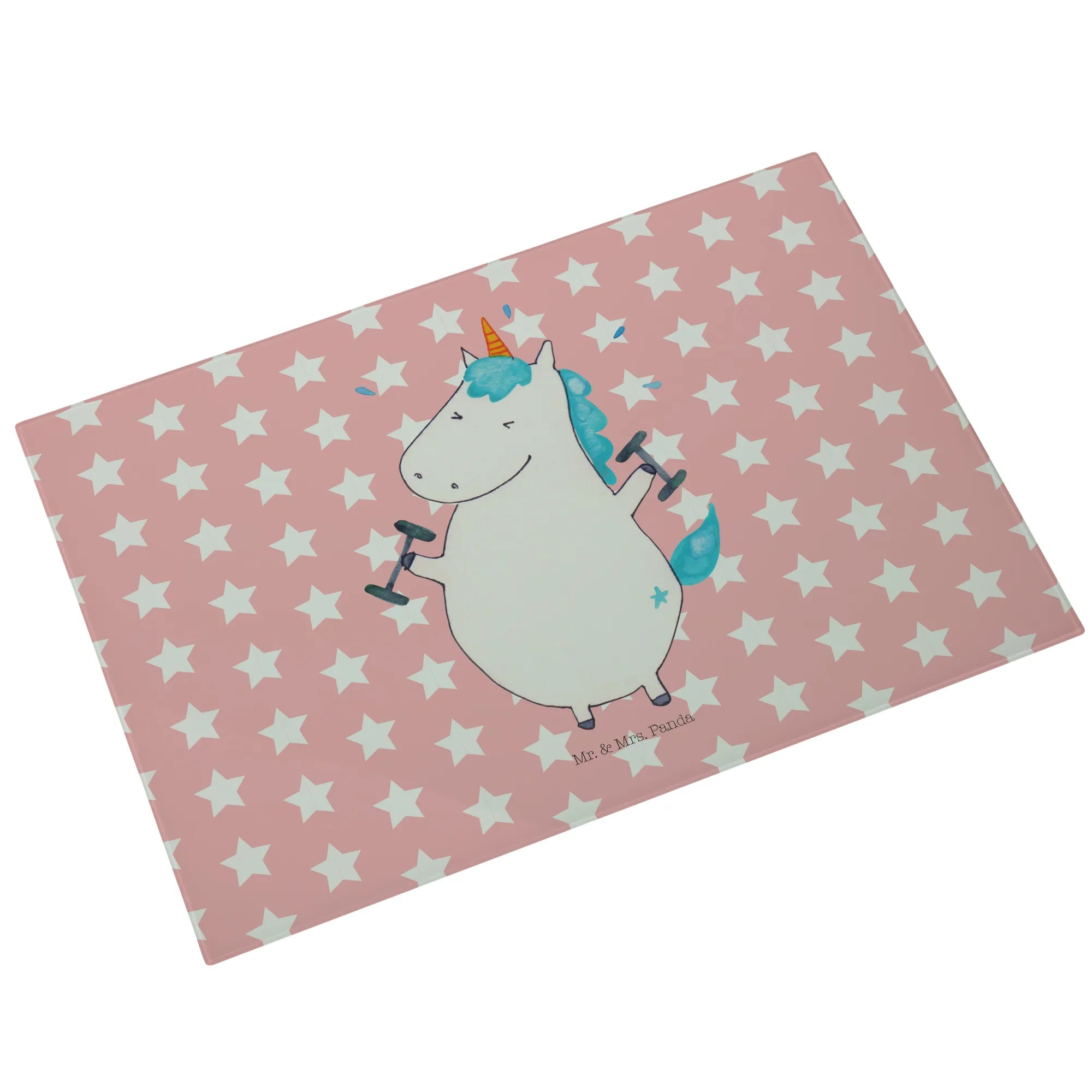 Das Medium Glas Schneidbrett "Einhorn Fitness" von Mr. & Mrs. Panda ist nicht nur ein praktisches Küchenutensil, sondern auch ein fröhliches Statement für all diejenigen, die sich für Fitness und gesunde Ernährung begeistern!