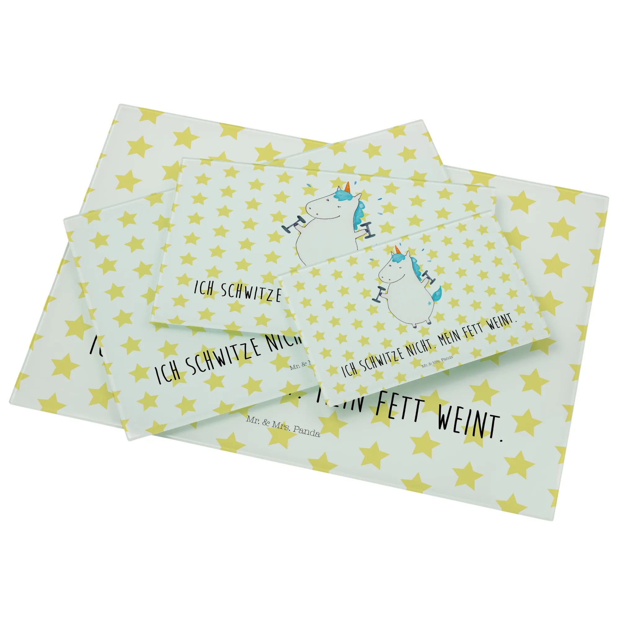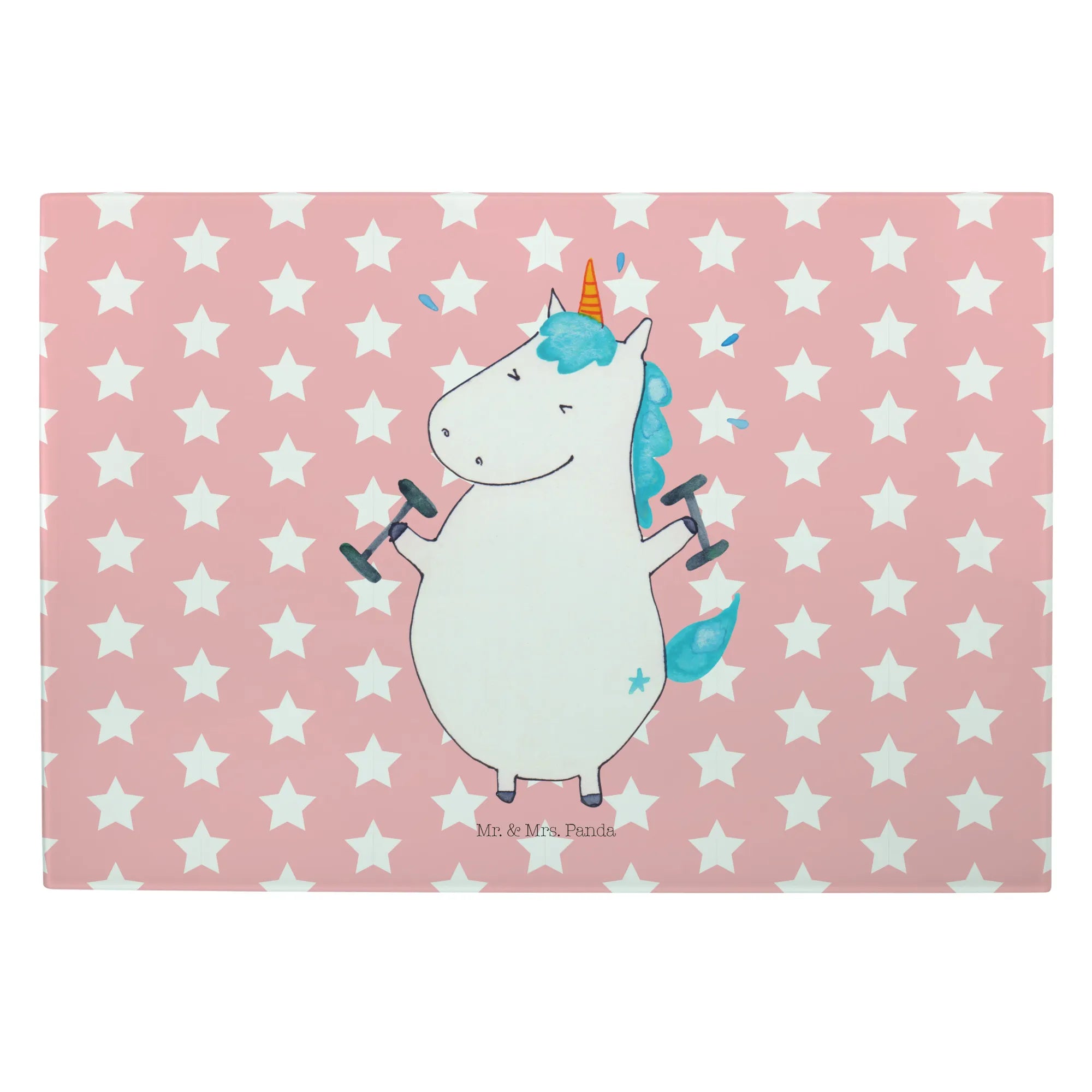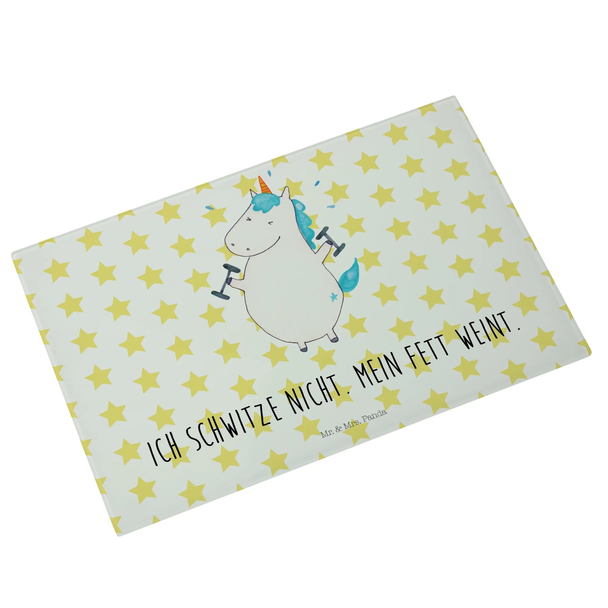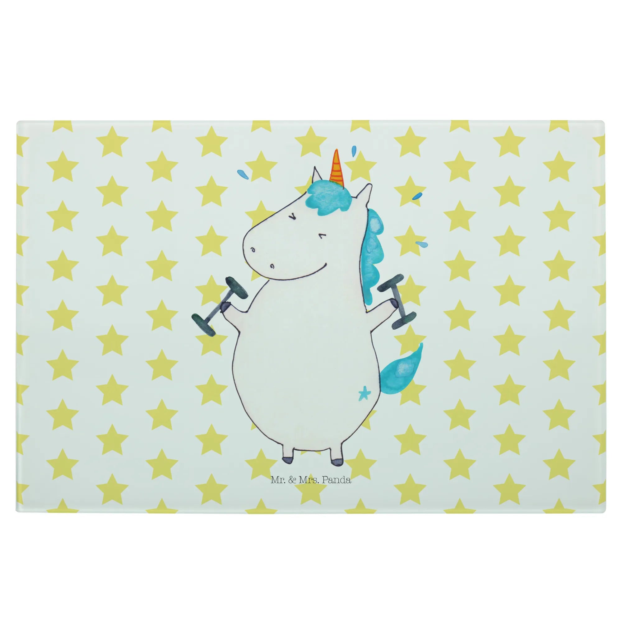 Das Medium Glas Schneidbrett "Einhorn Fitness" von Mr. & Mrs. Panda ist nicht nur ein praktisches Küchenutensil, sondern auch ein fröhliches Statement für all diejenigen, die sich für Fitness und gesunde Ernährung begeistern!