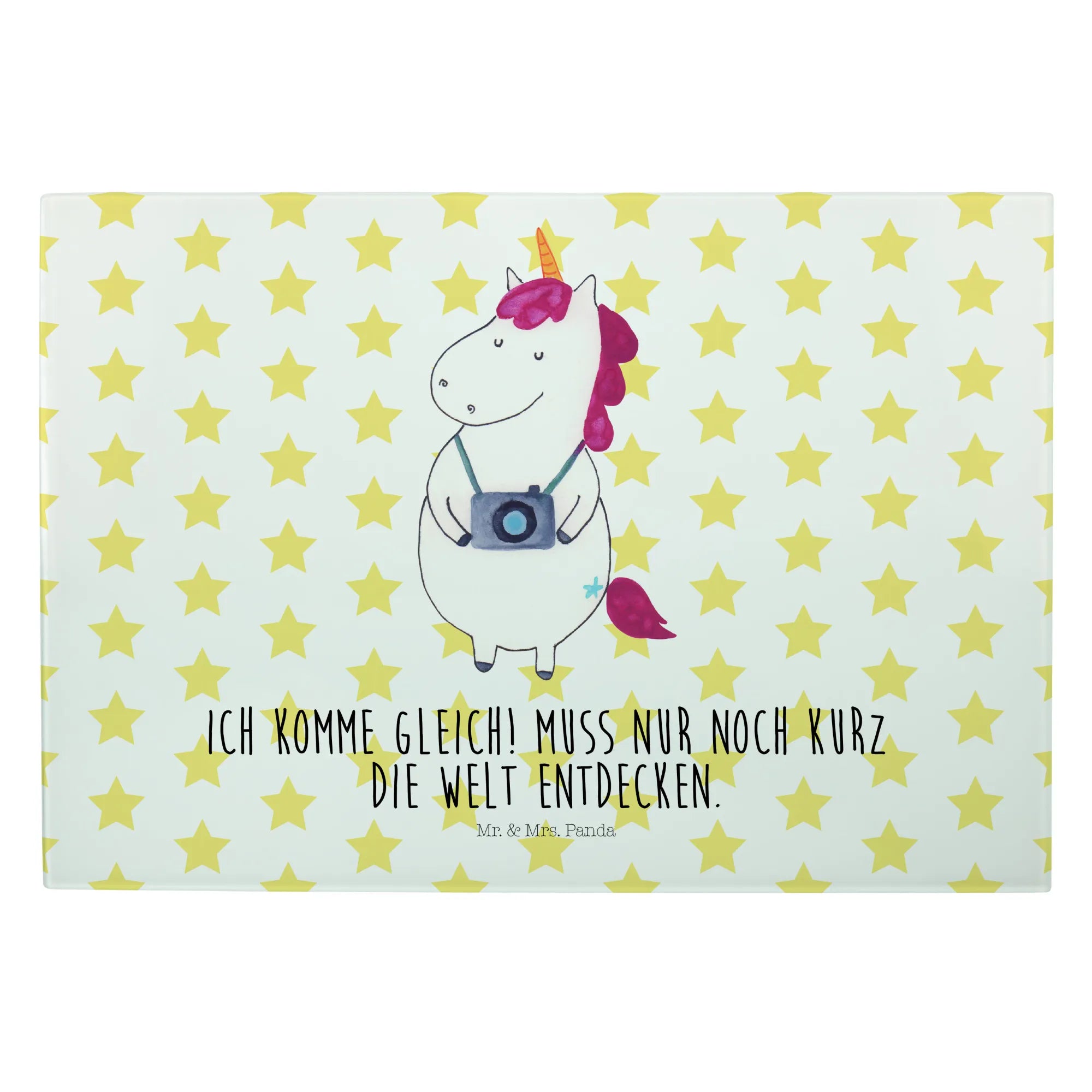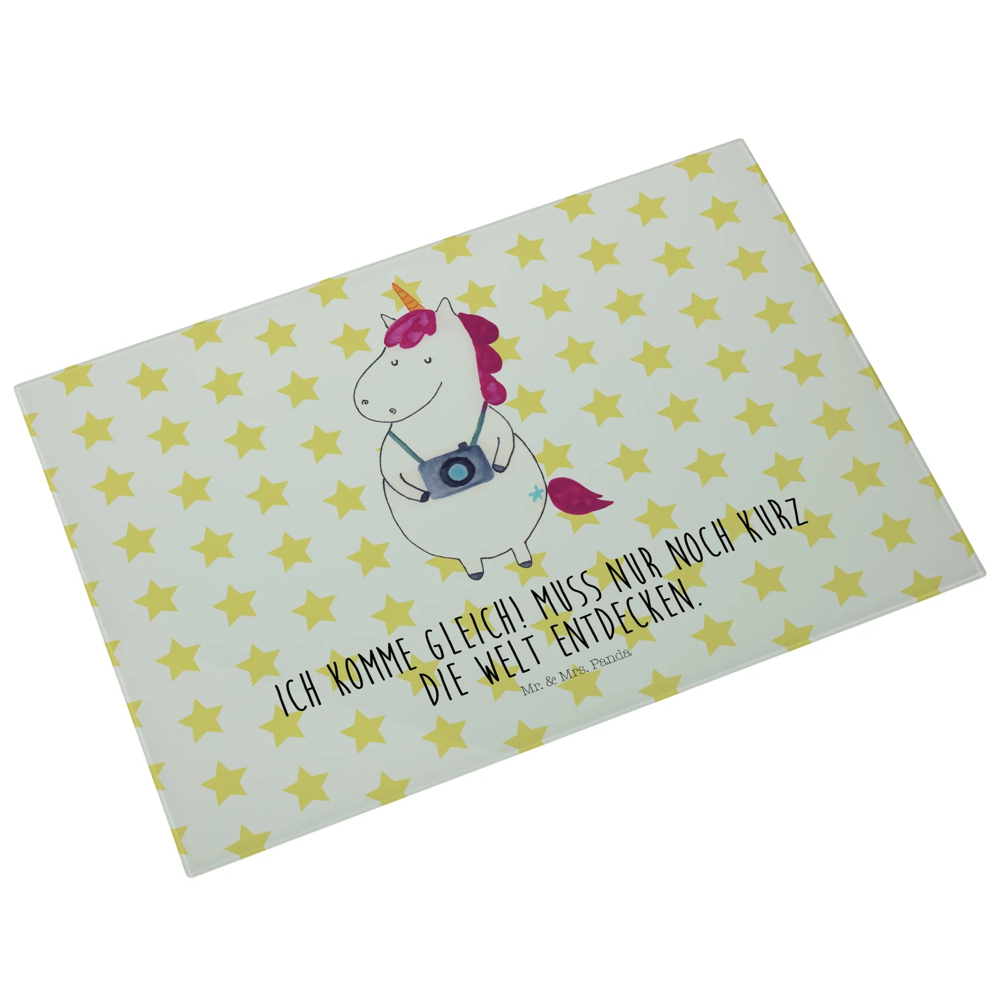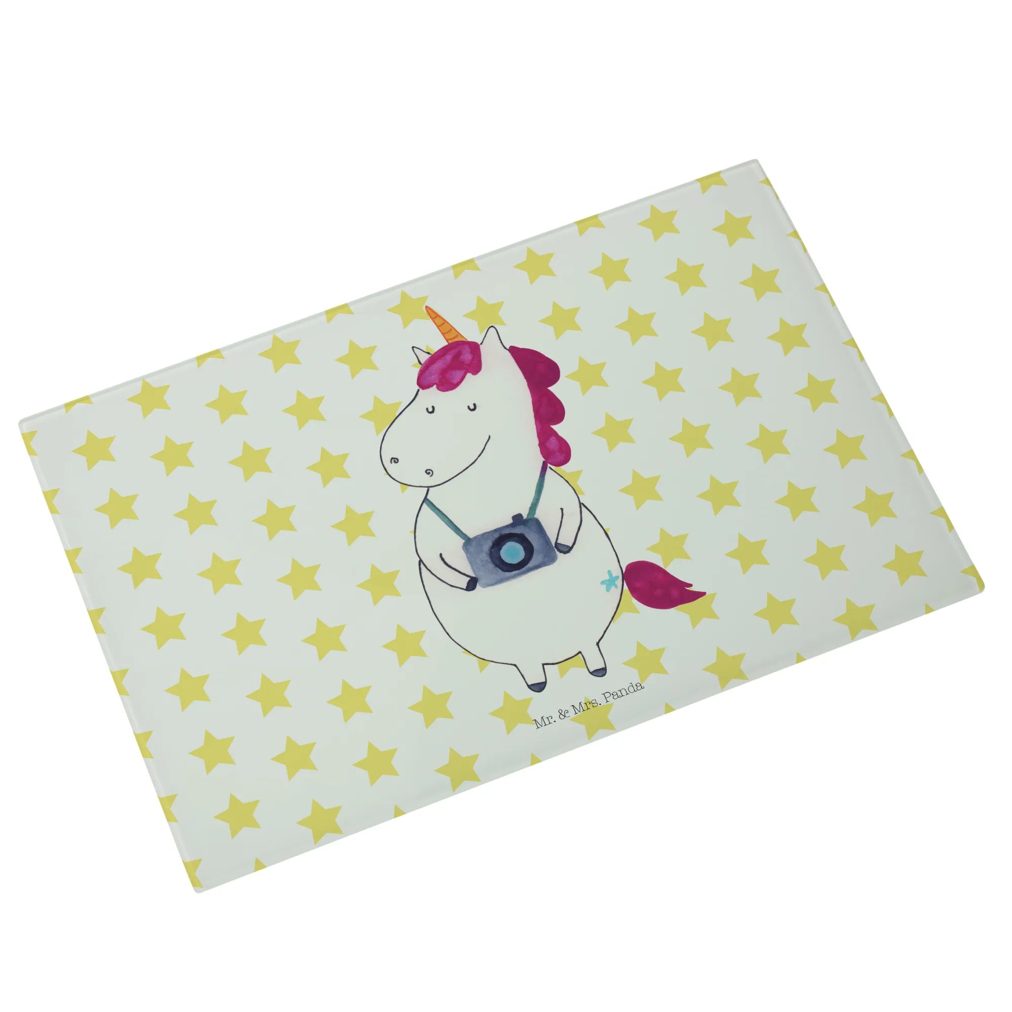 Das Medium Glas Schneidbrett mit dem süßen Einhorn Fotograf Motiv von Mr. & Mrs. Panda ist das perfekte Geschenk für alle Weltenbummler und Einhorn-Liebhaber! Ob für Freunde, die das Reisen lieben, oder als liebevolles Geschenk für Geburtstage, Hochzeiten oder Einweihungsfeiern – dieses Schneidebrett bringt Freude in jede Küche.