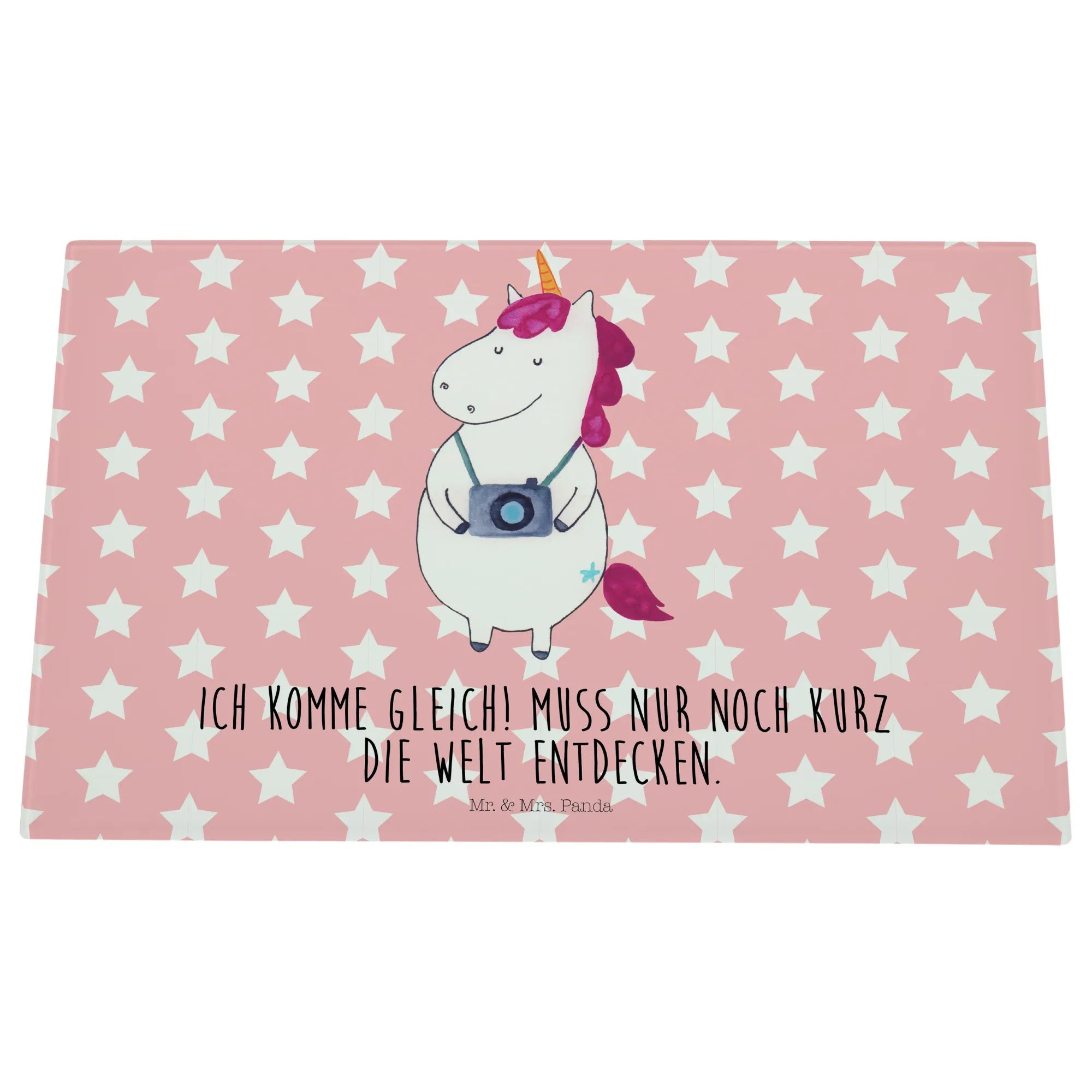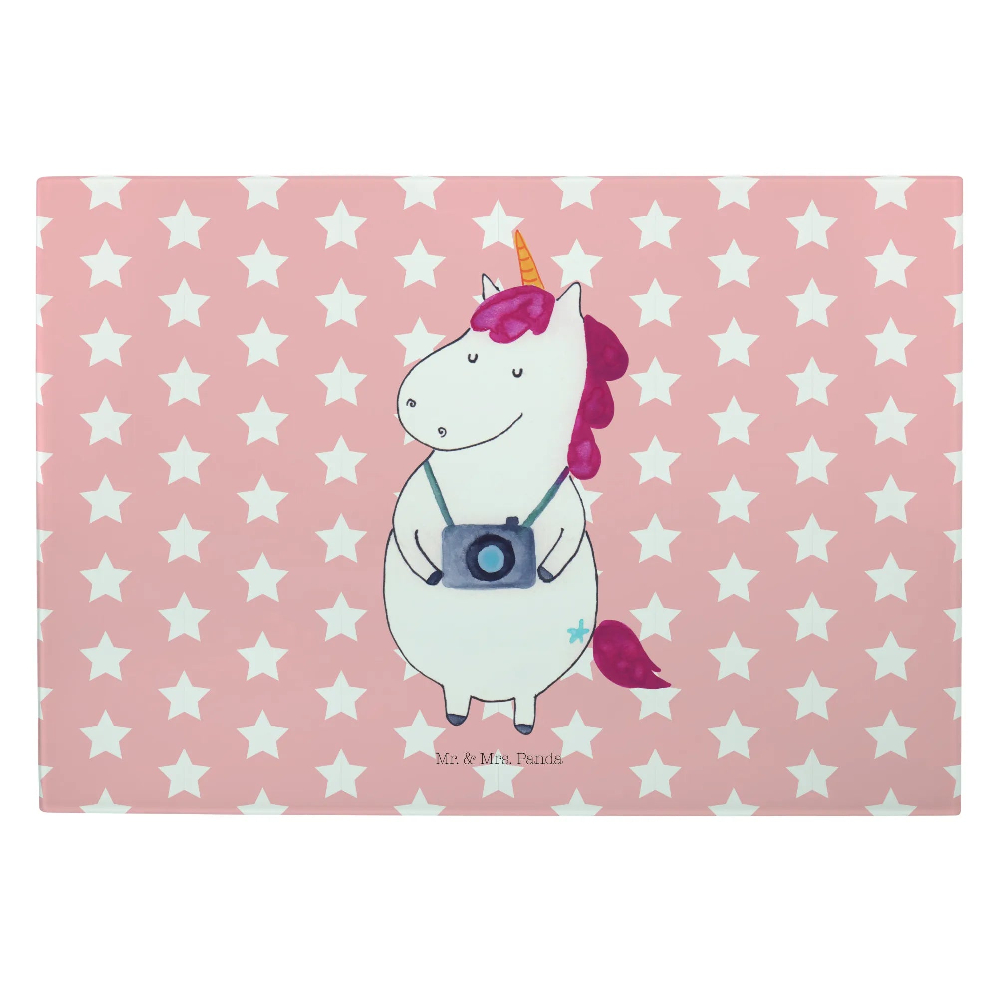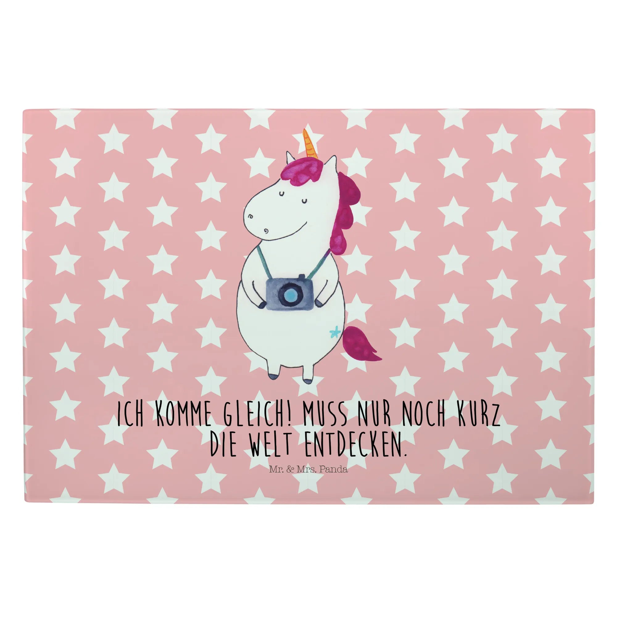 Das Medium Glas Schneidbrett mit dem süßen Einhorn Fotograf Motiv von Mr. & Mrs. Panda ist das perfekte Geschenk für alle Weltenbummler und Einhorn-Liebhaber! Ob für Freunde, die das Reisen lieben, oder als liebevolles Geschenk für Geburtstage, Hochzeiten oder Einweihungsfeiern – dieses Schneidebrett bringt Freude in jede Küche.