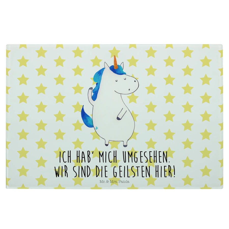 Du suchst nach dem perfekten Geschenk für einen Einhorn-Liebhaber? Unser XL Glas Schneidbrett mit dem charmanten Motiv "Einhorn Mann" aus der exklusiven Einhorn-Kollektion von Mr. & Mrs. Panda ist genau das Richtige! Dieses liebevoll gestaltete Schneidebrett ist nicht nur ein echtes Highlight in jeder Küche, sondern auch ein wundervolles Geschenk für Freunde, Familie oder deinen besten Freund. Das selbstbewusste Einhorn, das stolz sein Horn zeigt, wird garantiert ein Lächeln auf jedes Gesicht zaubern. Der witzige Spruch "Ich hab' mich umgesehen. Wir sind die Geilsten hier!" bringt zusätzlichen Humor und sorgt für jede Menge Gesprächsstoff – perfekt für Partys, Brunch oder einfach nur im Alltag.