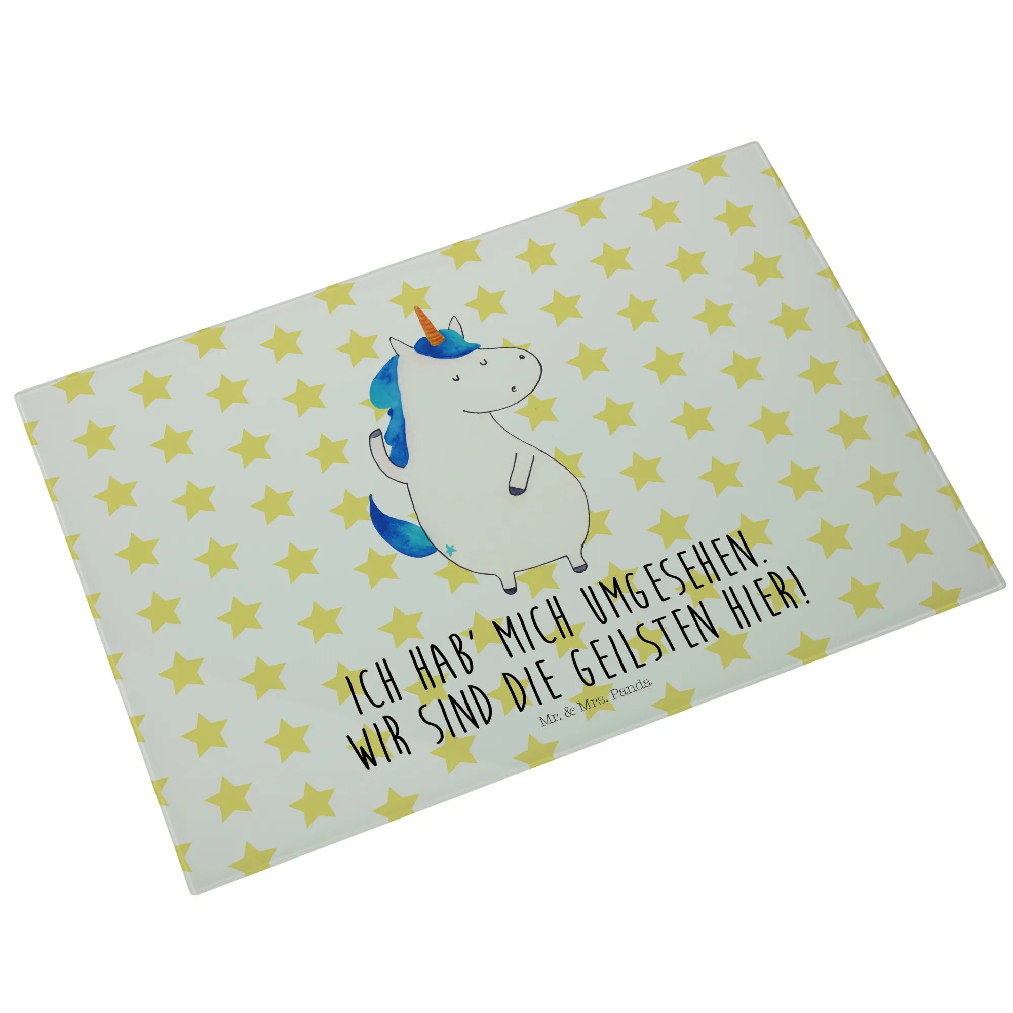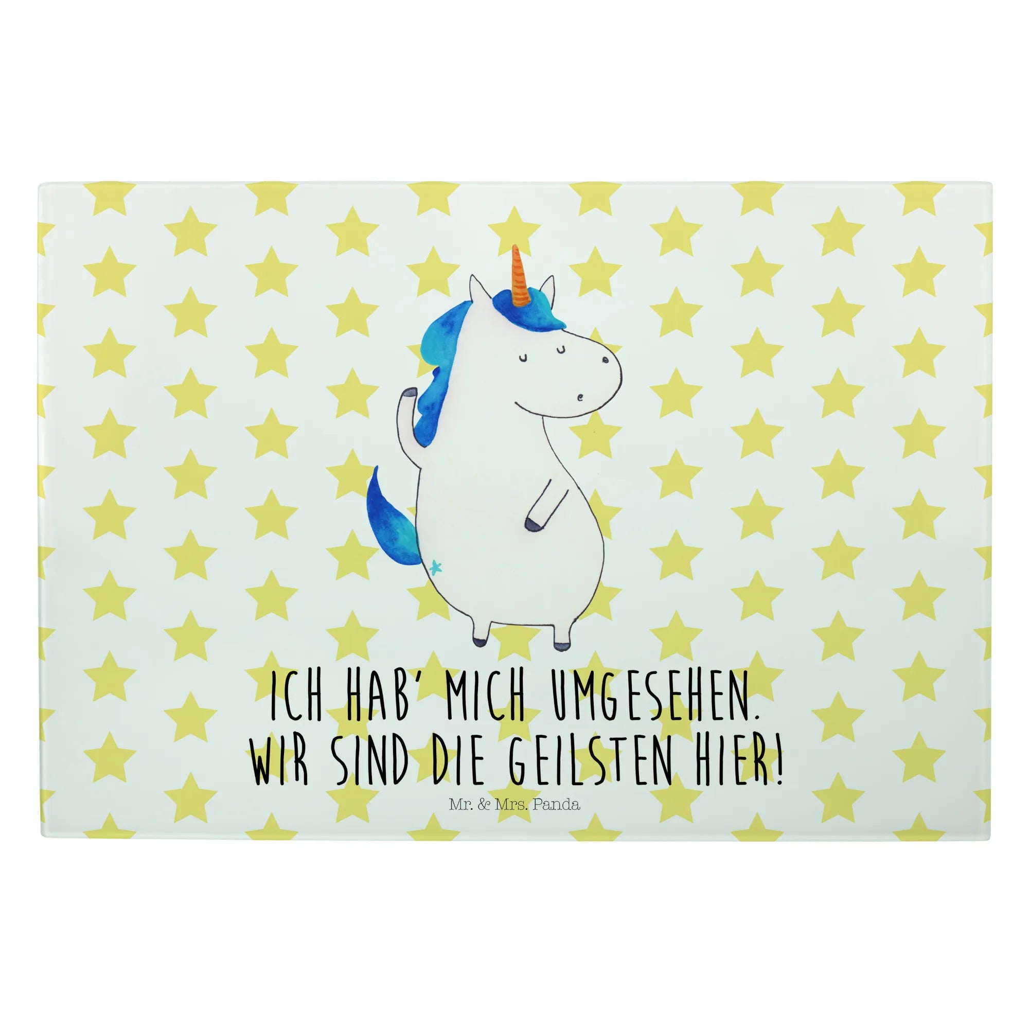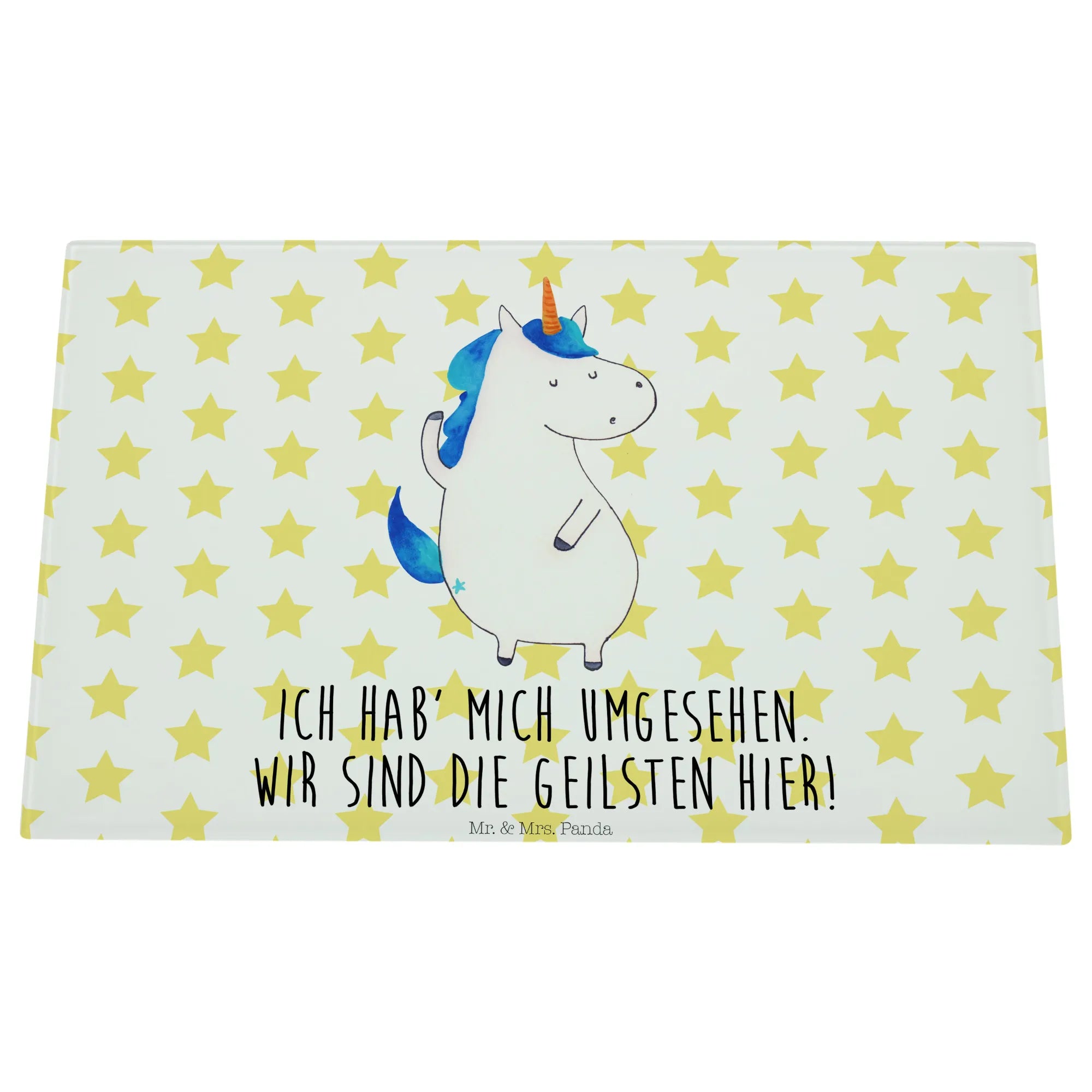 Das Medium Glas Schneidebrett "Einhorn Mann" von Mr. & Mrs. Panda ist das perfekte Geschenk für all jene, die Einhörner und die zauberhafte Welt, die sie umgibt, lieben. Mit seinem liebevoll gestalteten, handgezeichneten Einhorn-Motiv, zeigt dieses Schneidebrett nicht nur Funktionalität, sondern auch ein Stück magische Lebensfreude. Ob in der Küche oder bei der Zubereitung von leckeren Snacks auf deiner nächsten Party - dieses Schneidebrett ist ein echter Hingucker! Der spritzige Spruch "Ich hab' mich umgesehen. Wir sind die Geilsten hier!" gewährt einen humorvollen Geplänkel und bringt Freund und Familie zum Lachen.
