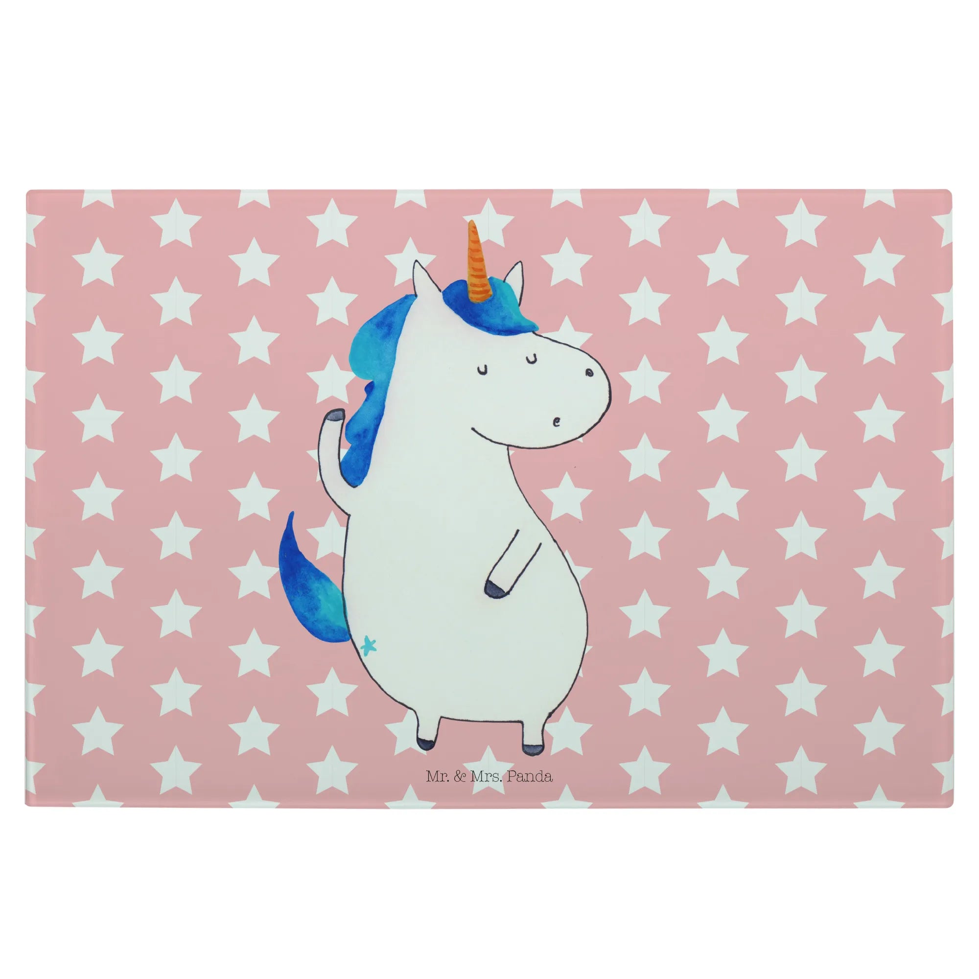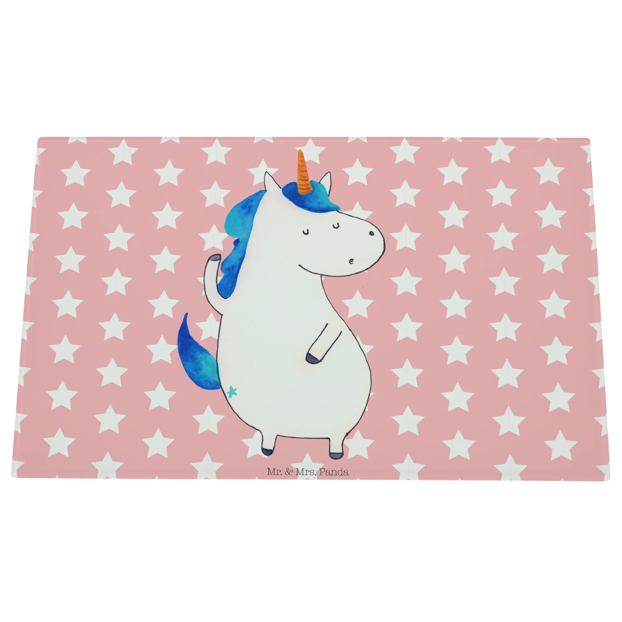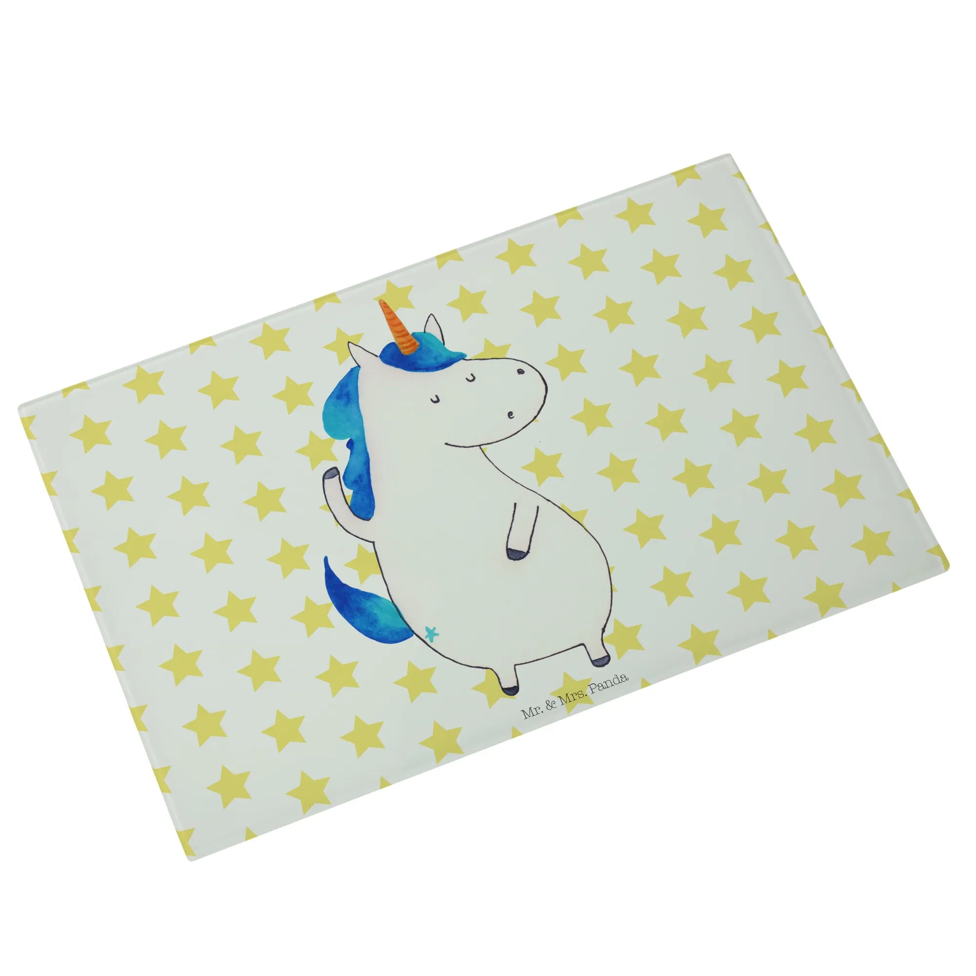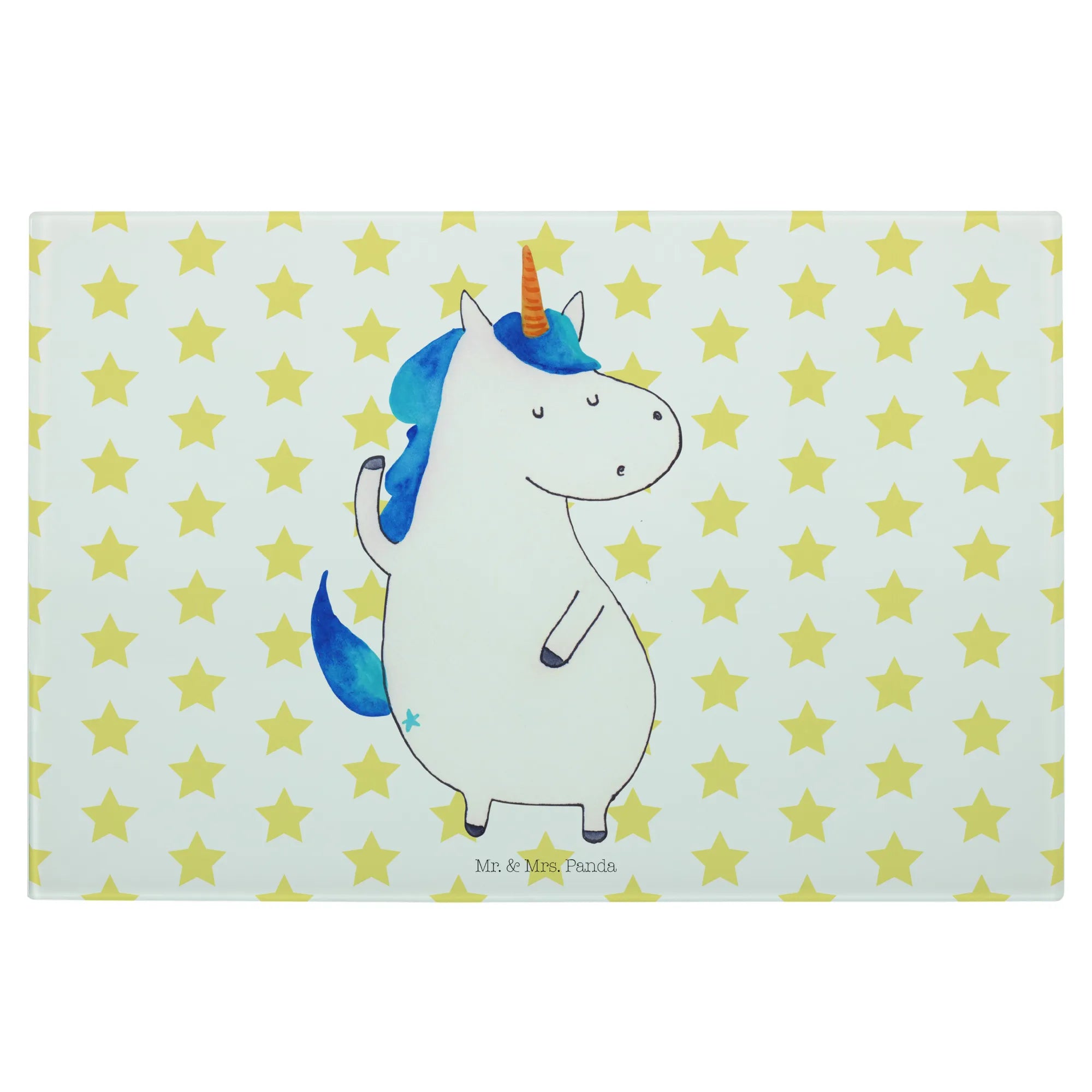 Das Medium Glas Schneidbrett mit dem Motiv Einhorn Mann von Mr. & Mrs. Panda ist das perfekte Geschenk für Einhorn-Liebhaber und alle, die Freude an außergewöhnlichen Küchenutensilien haben.