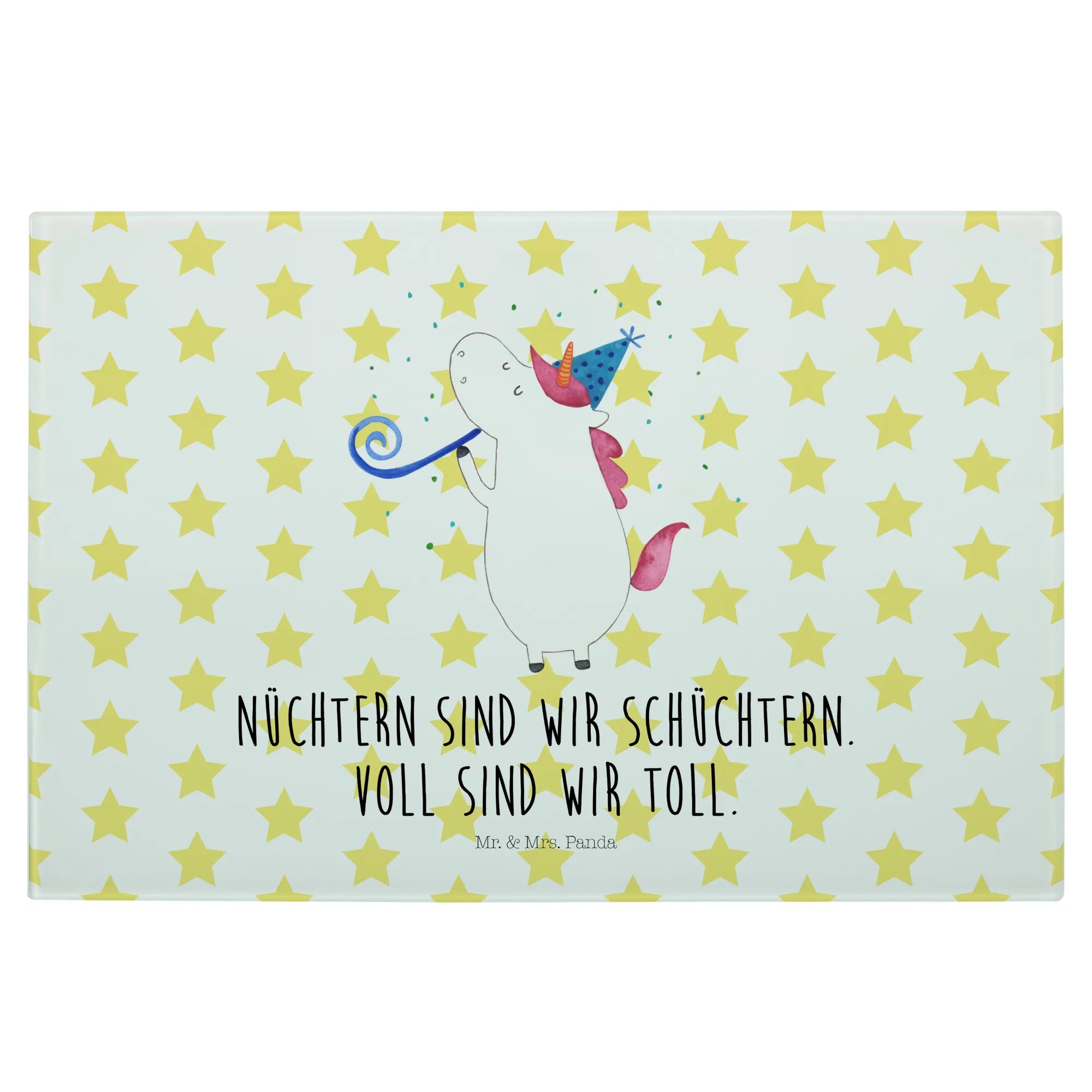 Das XL Glas Schneidbrett mit dem zauberhaften Motiv "Einhorn Party" aus der Einhorn-Kollektion von Mr. & Mrs. Panda ist das perfekte Geschenk für alle, die das Besondere lieben! Ein Einhorn, das Party feiert und das Leben in vollen Zügen genießt, verleiht deiner Küche eine fröhliche Note.