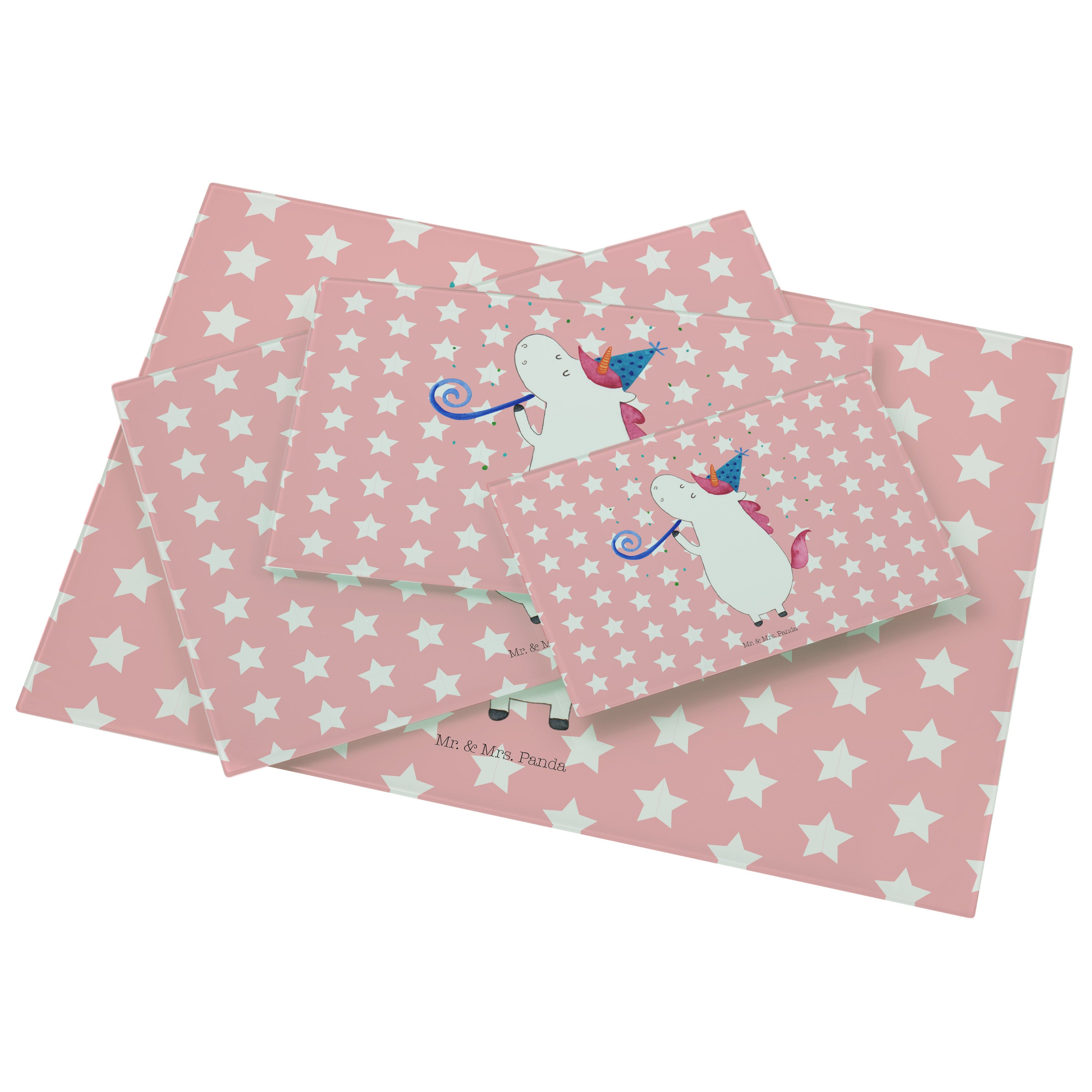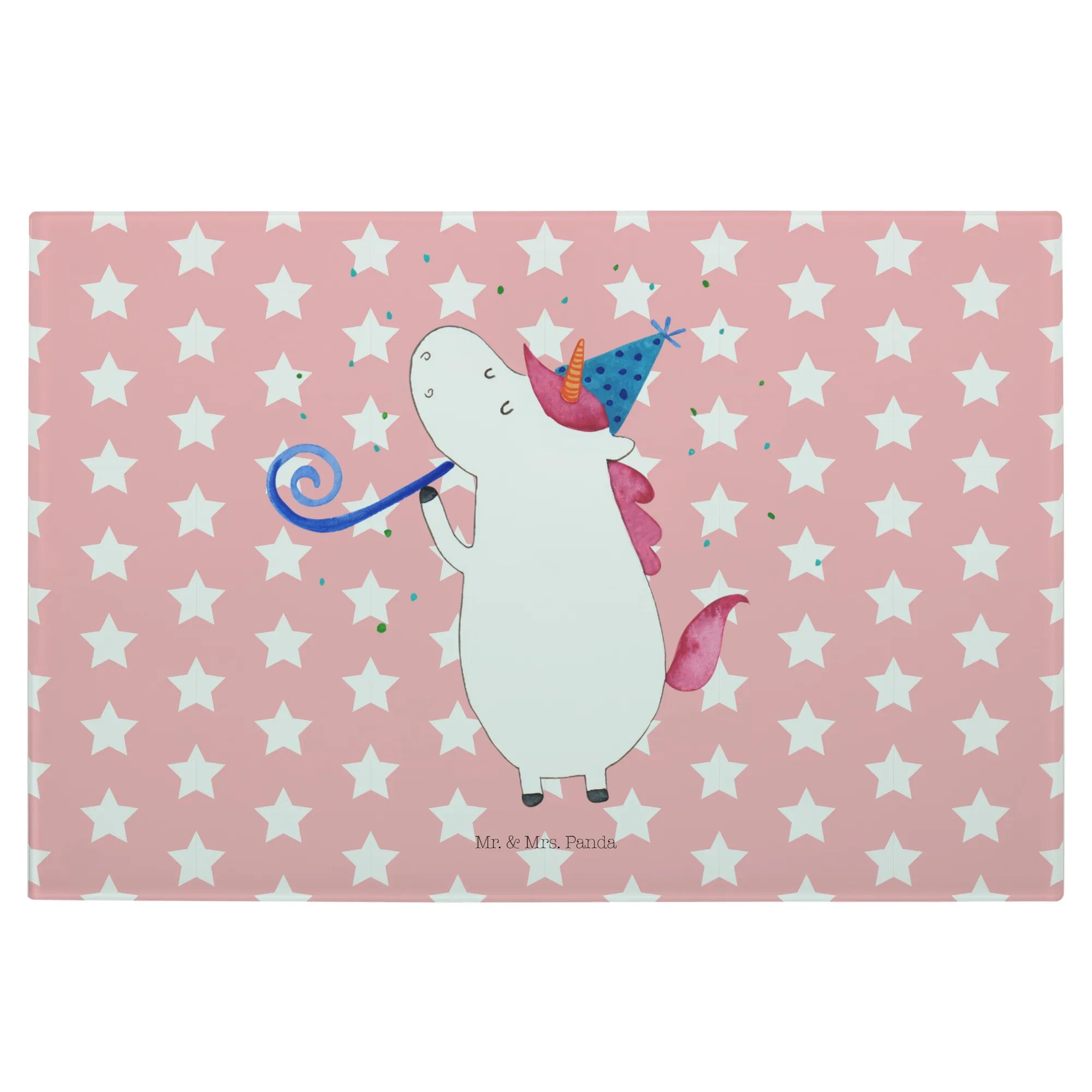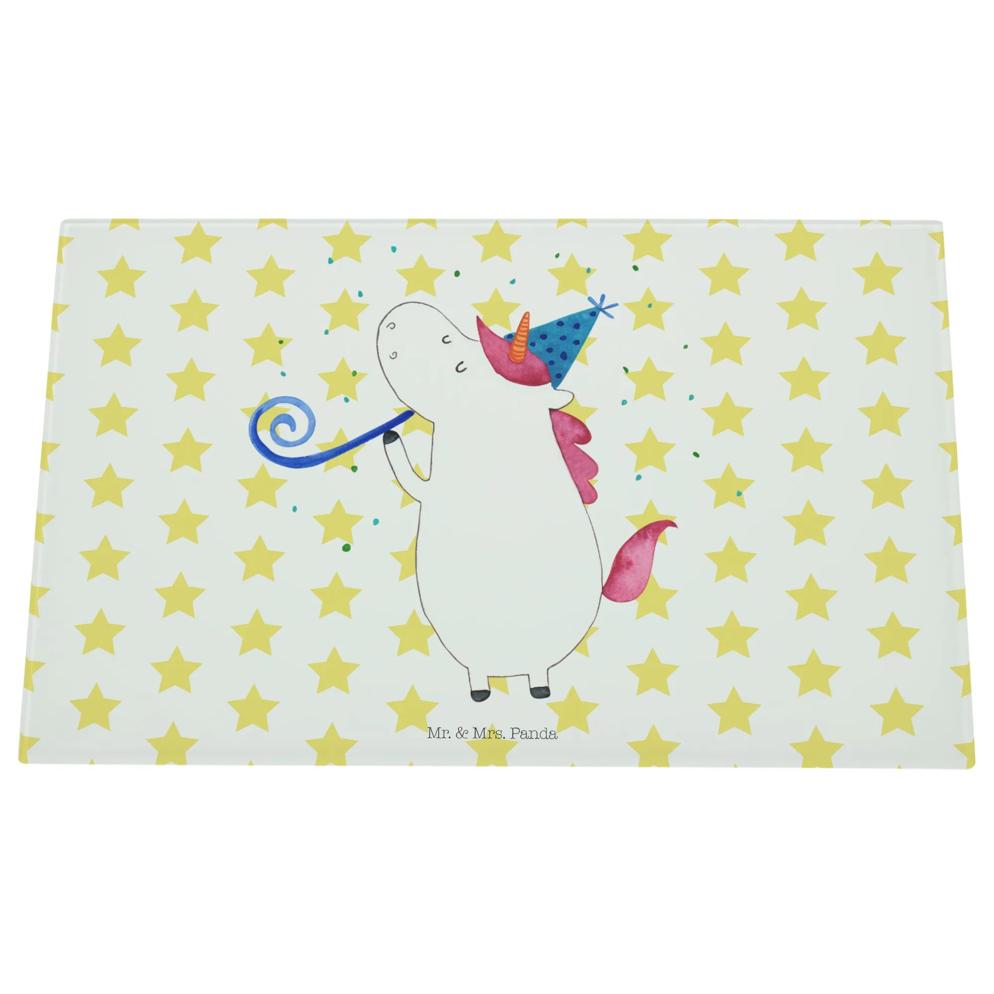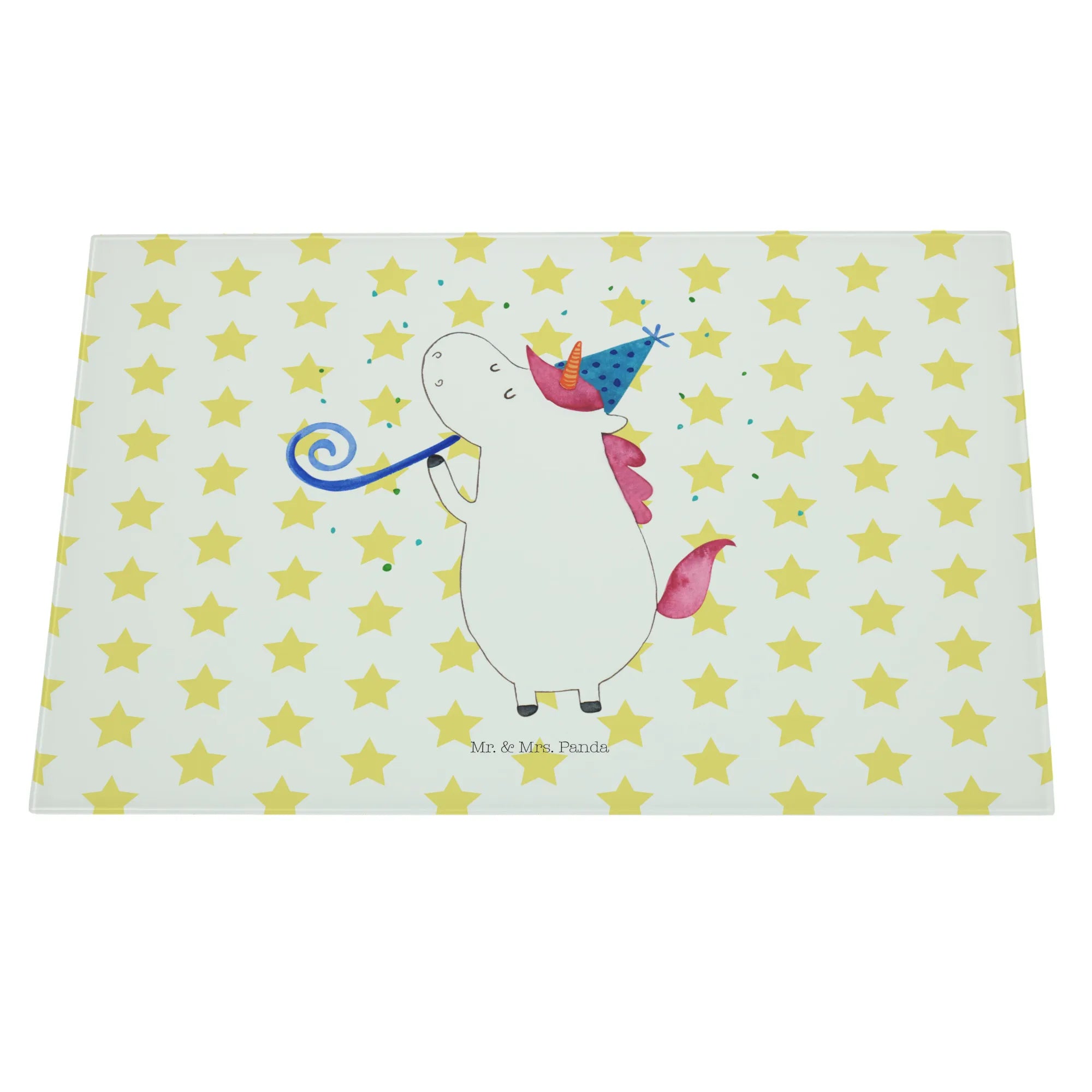 Entdecke unser einzigartiges Medium Glas Schneidbrett mit dem bezaubernden Einhorn-Party-Motiv aus der liebevollen Einhorn - Kollektion von Mr. & Mrs. Panda!
