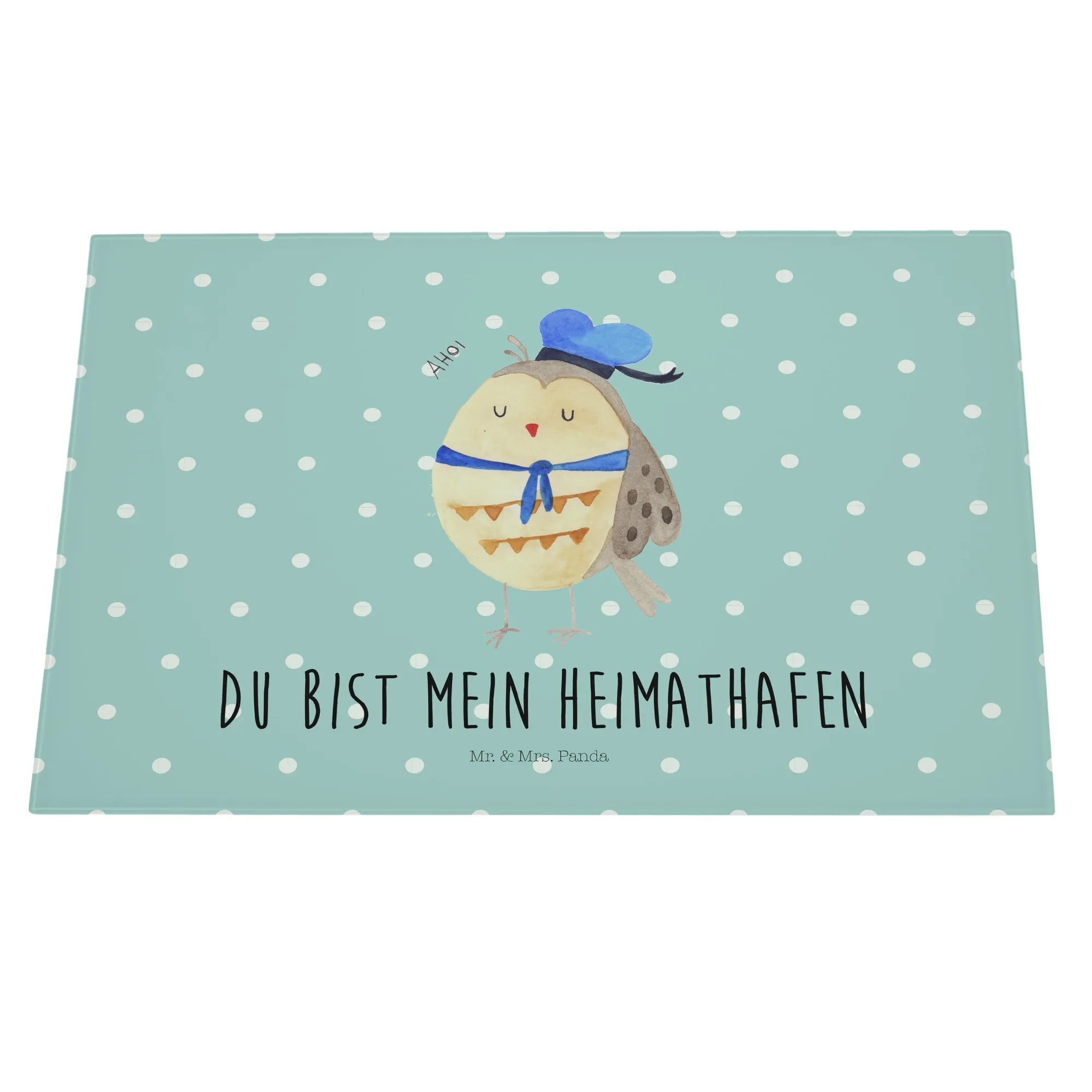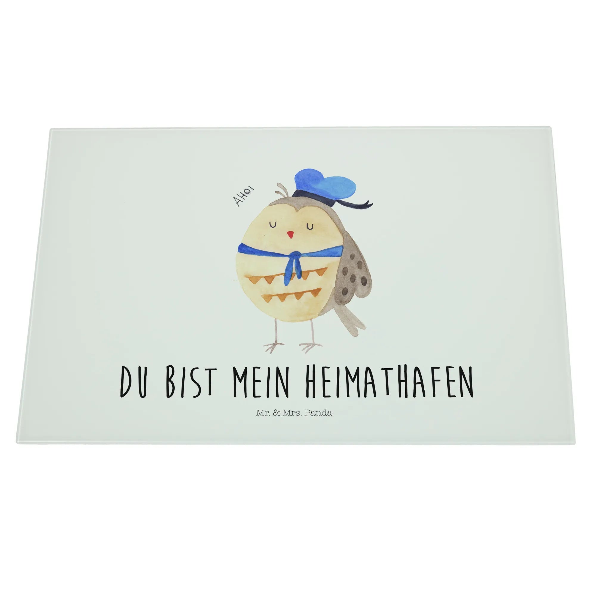 Das Medium Glas Schneidbrett Eule Matrosen von Mr. & Mrs. Panda ist der perfekte Begleiter für deine Küche! Mit seinem süßen Design und dem Spruch "Du bist mein Heimathafen" bringt es nicht nur Freude beim Kochen, sondern auch Liebe in dein Zuhause.