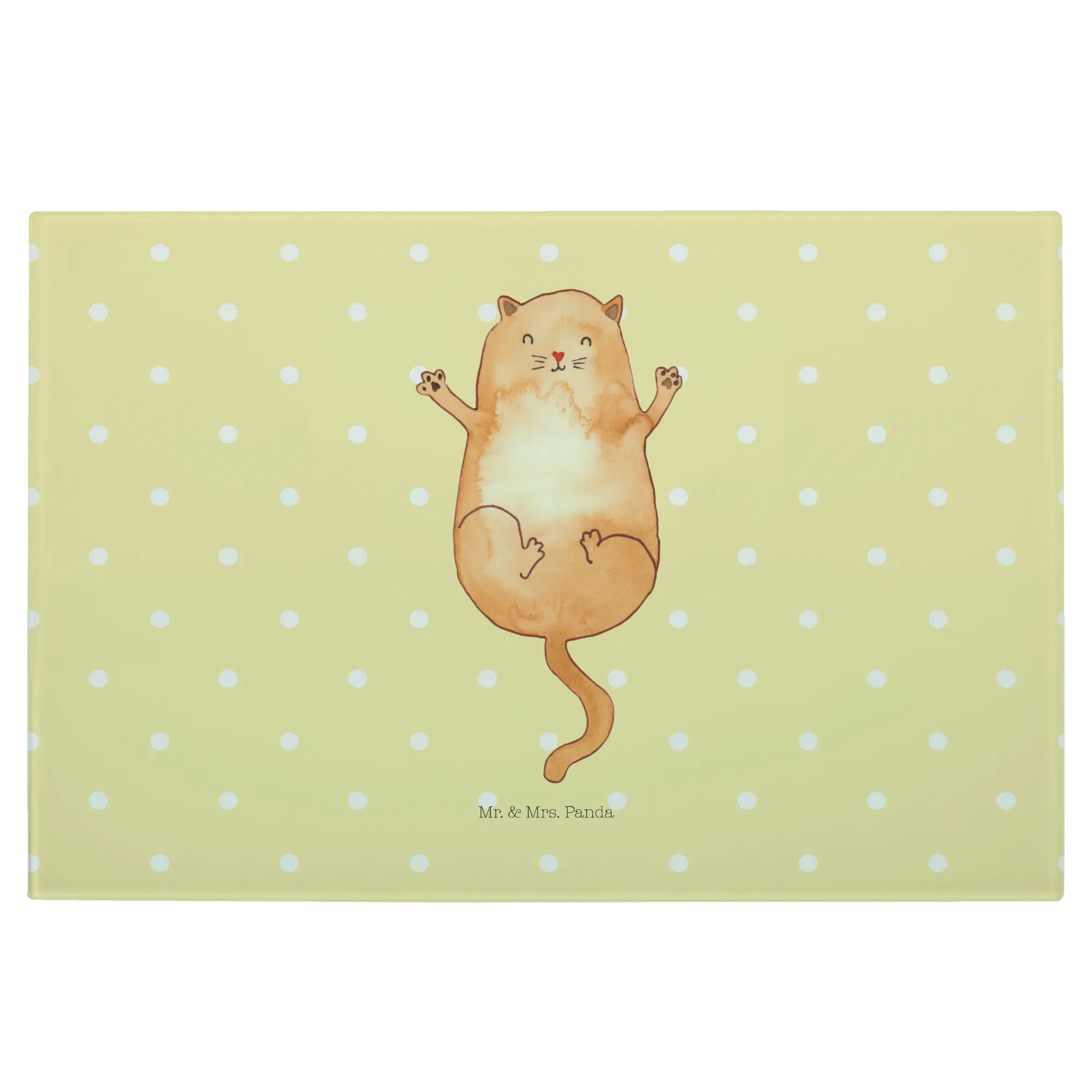 Das großflächige Design bietet genug Platz für alle Deine Zutaten, während die Katzenmotivation für gute Laune sorgt. Ob als Frühstücksbrett oder beim Schneiden von Gemüse und Obst, dieses robuste und kratzfeste Glasbrett wird schnell zum unverzichtbaren Küchenhelfer. Es ist nicht nur praktisch, sondern auch ein echter Hingucker! Die liebevoll handgezeichnete Katze, die auf dem Rücken liegt und ihre Arme begeistert ausbreitet, sorgt für einen charmanten Akzent in Deiner Küche.