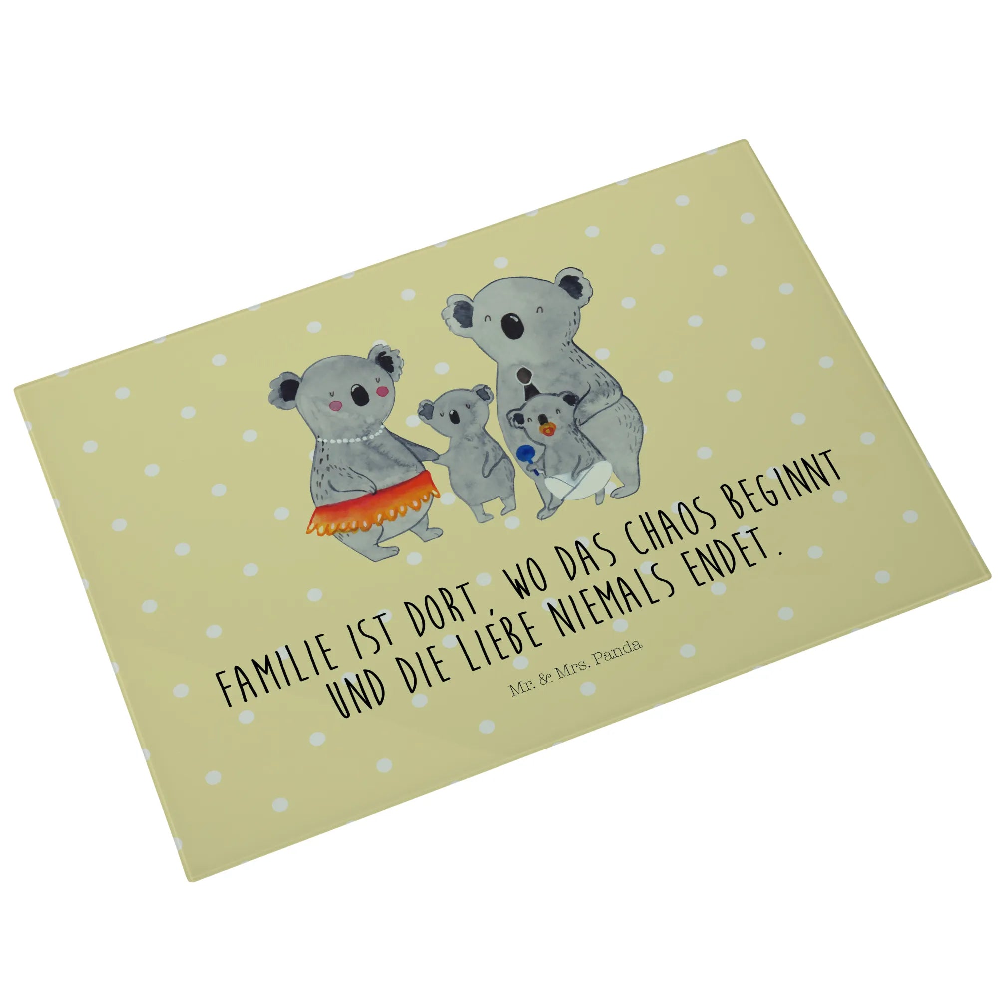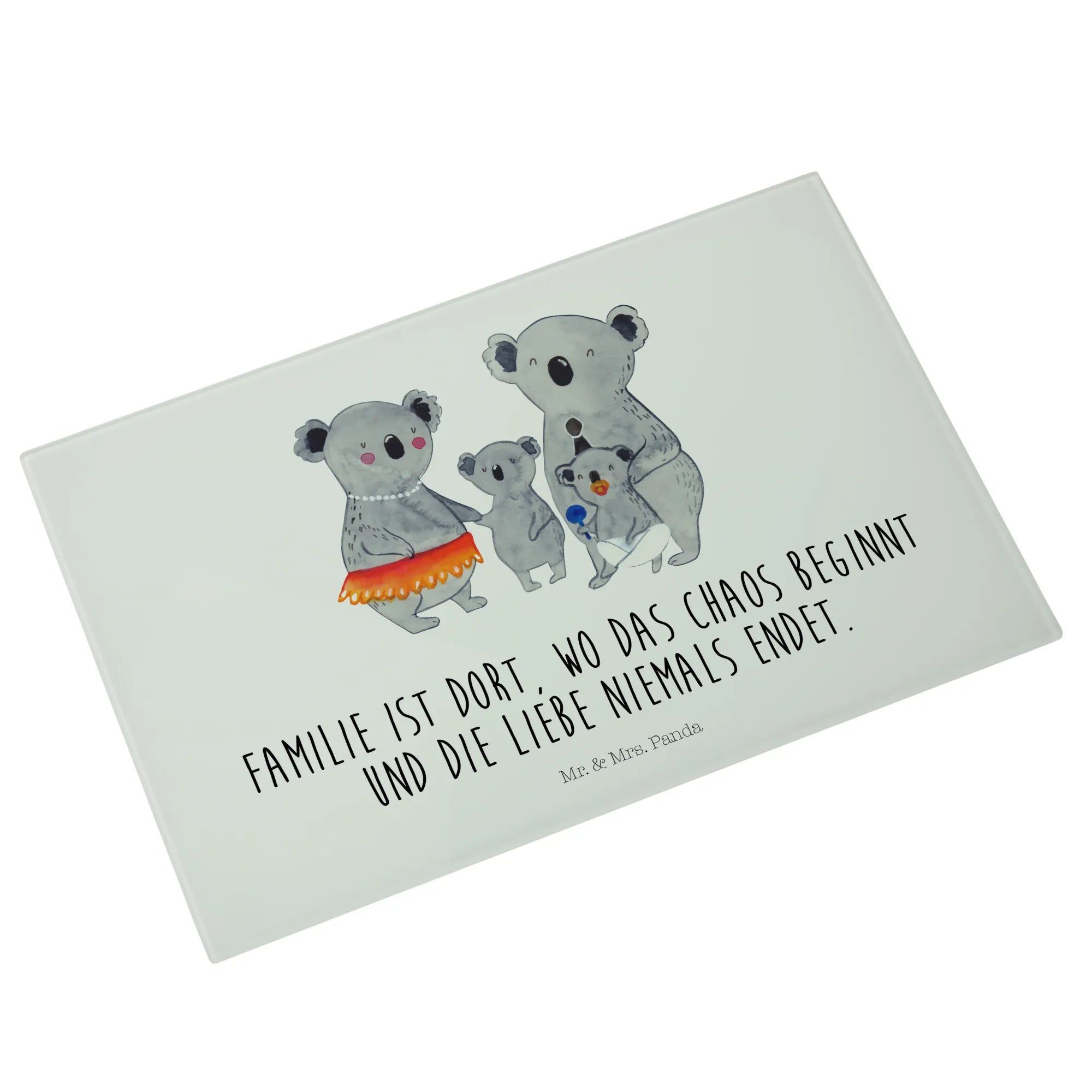 Wenn du auf der Suche nach dem perfekten Geschenk für deine Familie bist, dann ist das Medium Glas Schneidbrett mit dem süßen Koala Familienmotiv von Mr. & Mrs. Panda genau das Richtige! Mit einem herzlichen Slogan wie 'Familie ist dort, wo das Chaos beginnt und die Liebe niemals endet', bringt es viel Liebe und Freude in jede Küche.