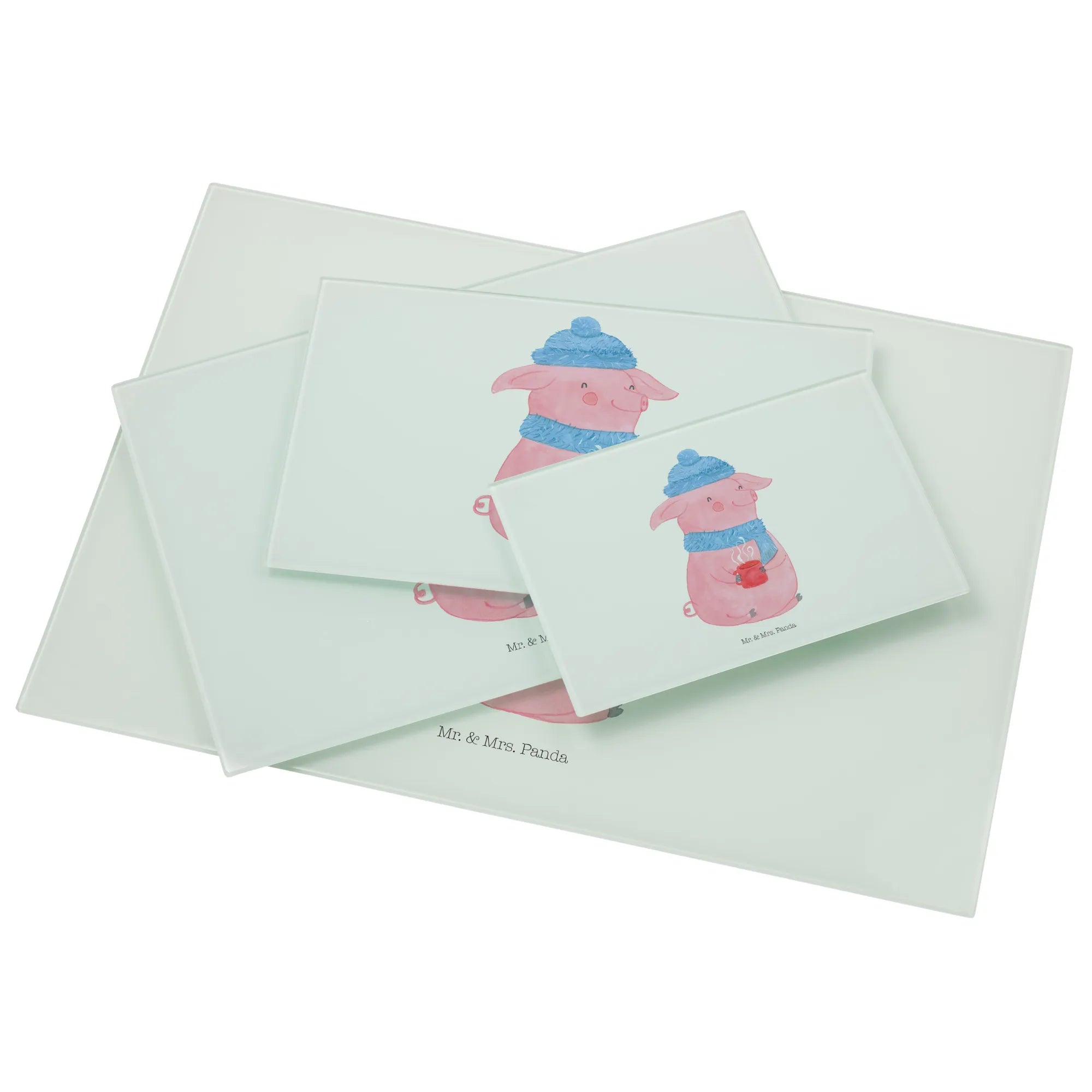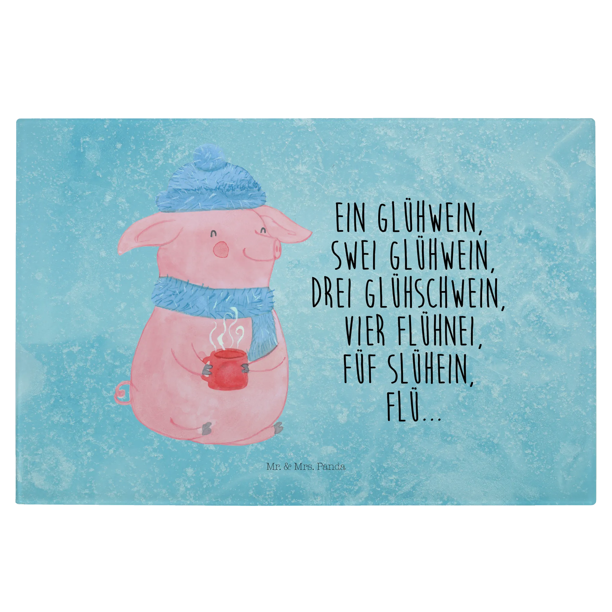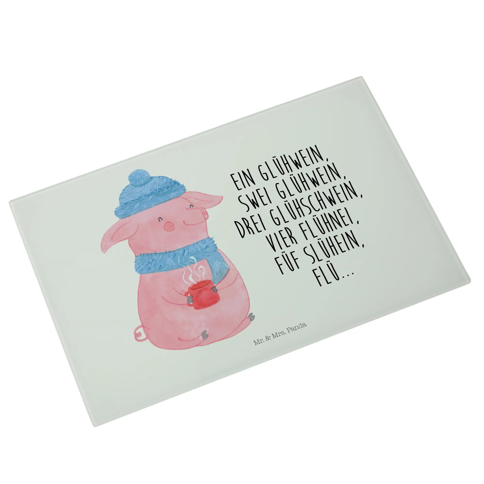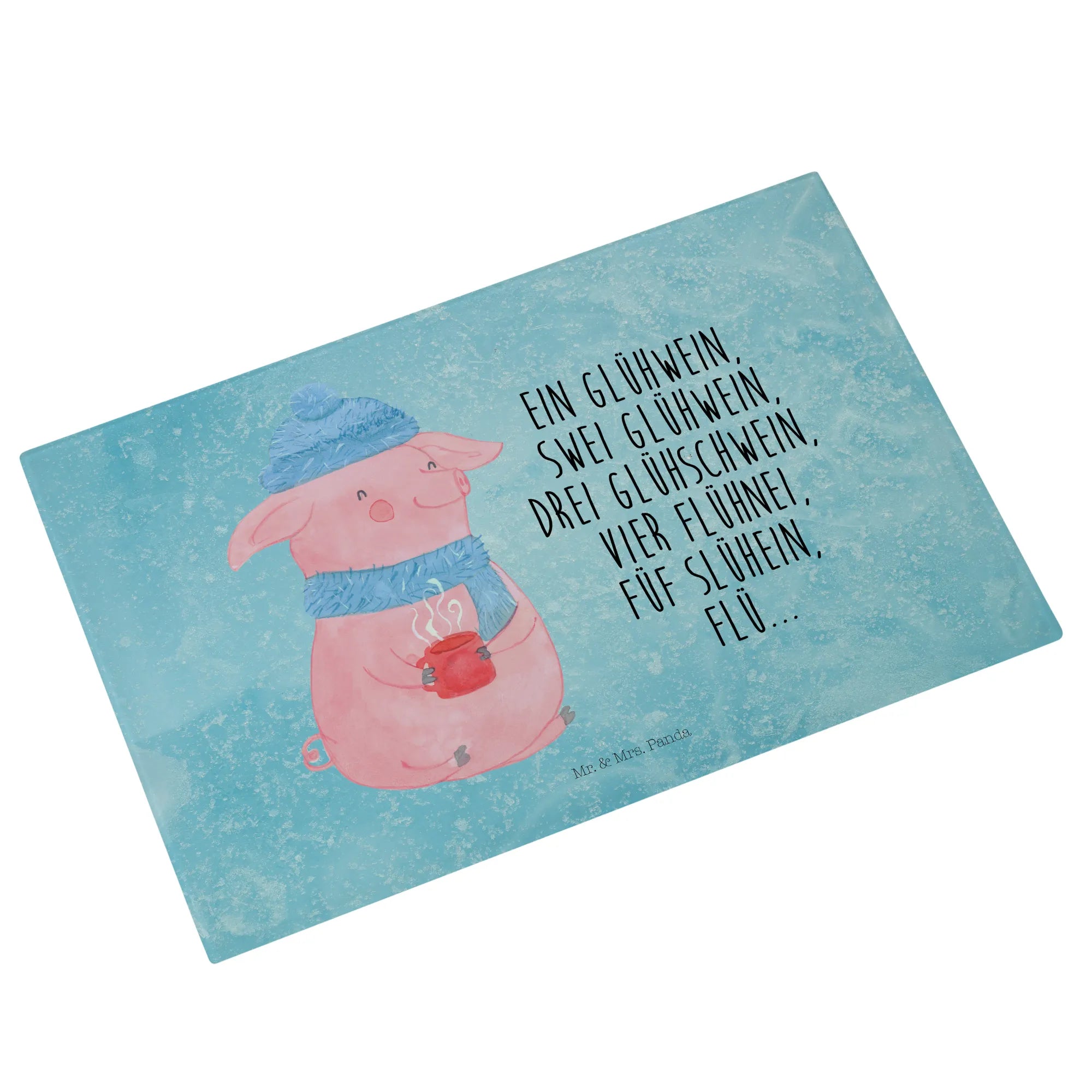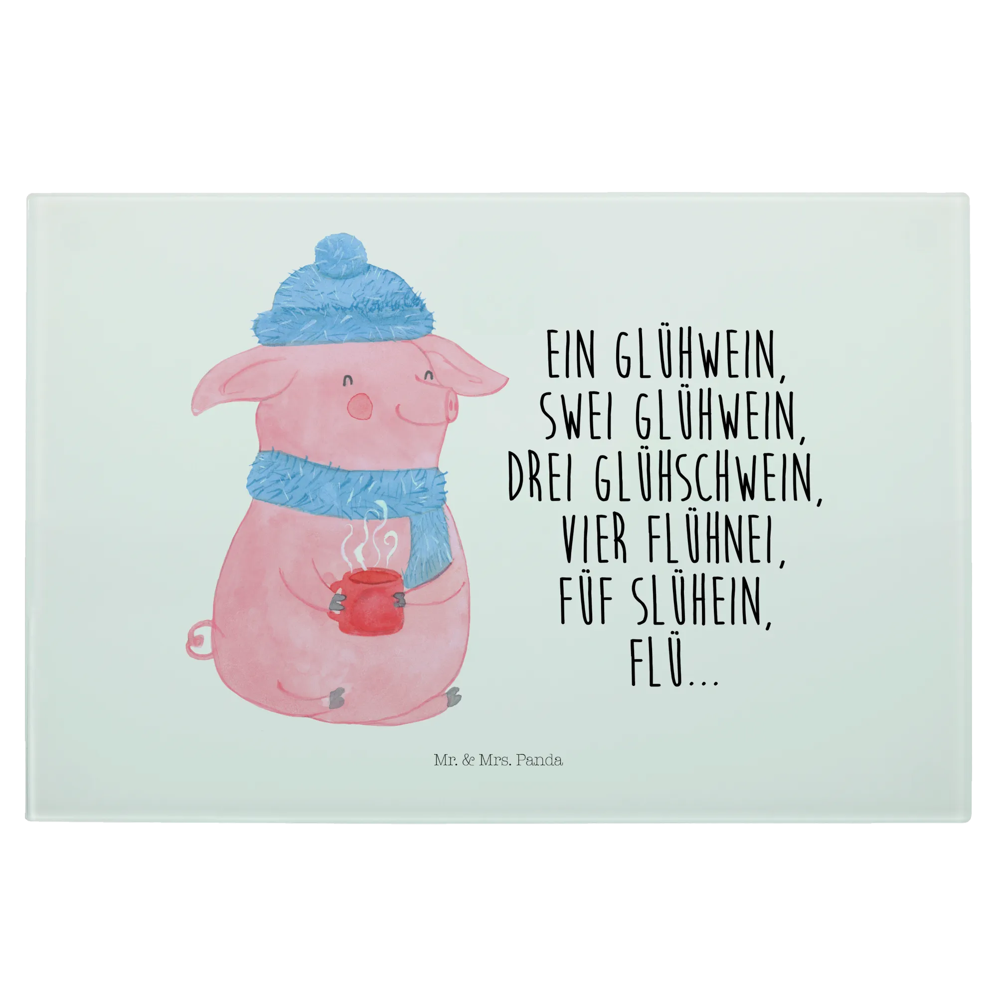 Das Lallelndes Glühschwein Medium Glas Schneidbrett von Mr. & Mrs. Panda macht jede Küche zu einem winterlichen Erlebnis! Mit einem charmanten Design, das ein fröhlich lächelndes, rosa Schwein zeigt, das mit einer blauen Mütze und einem passenden Schal eingekleidet ist, bringt es sofort festliche Stimmung.
