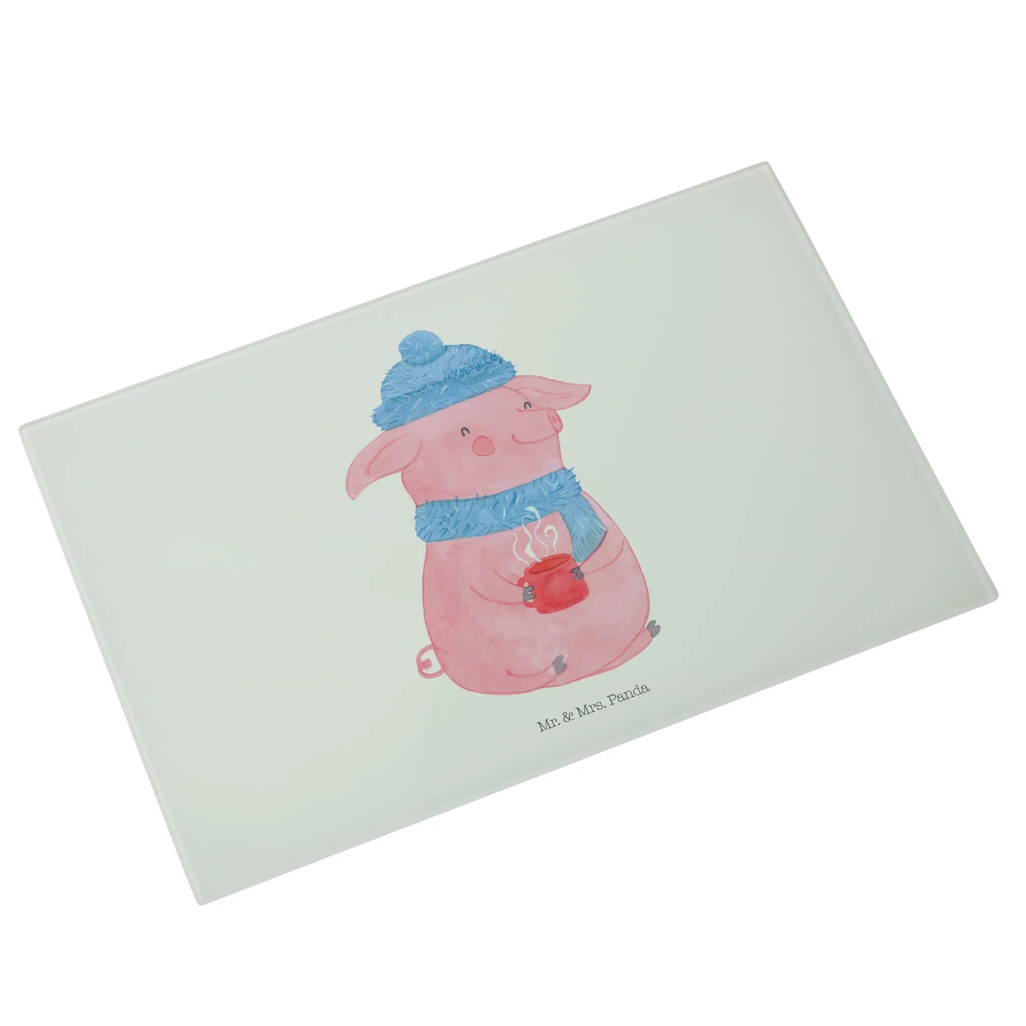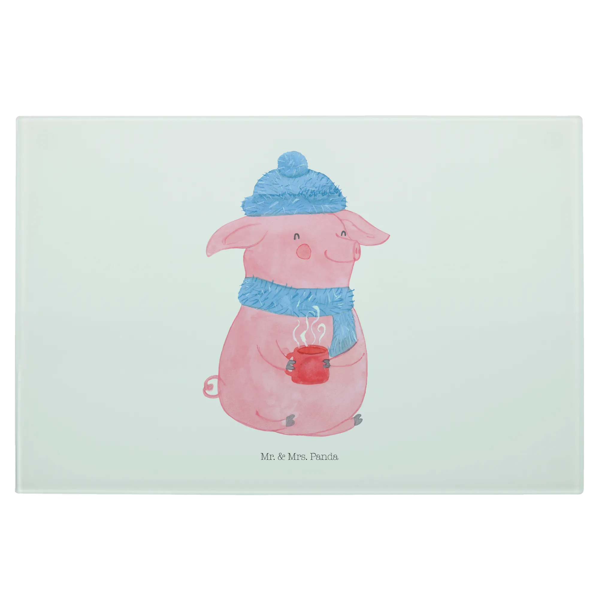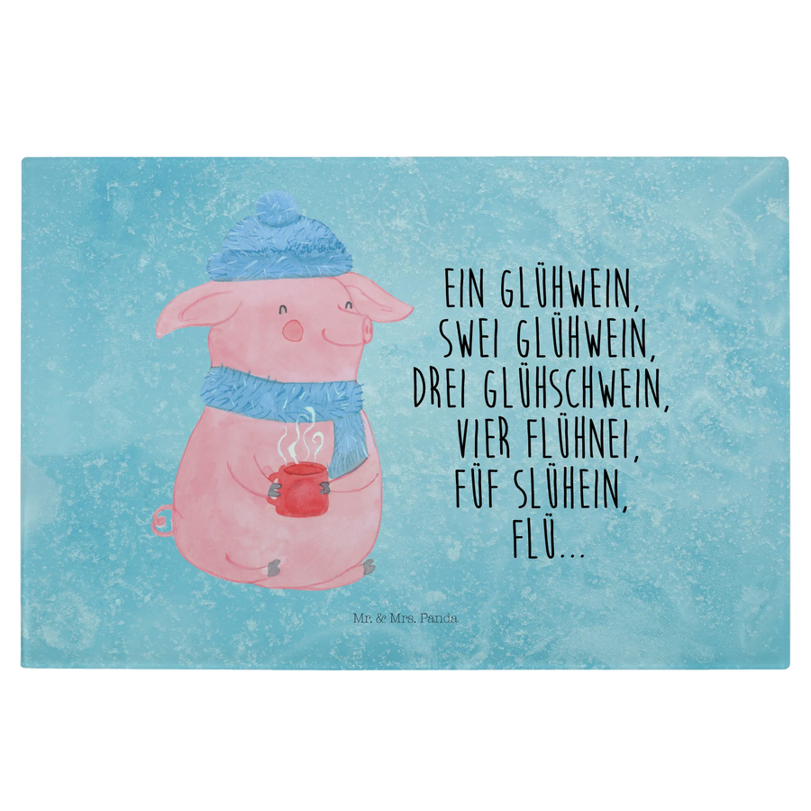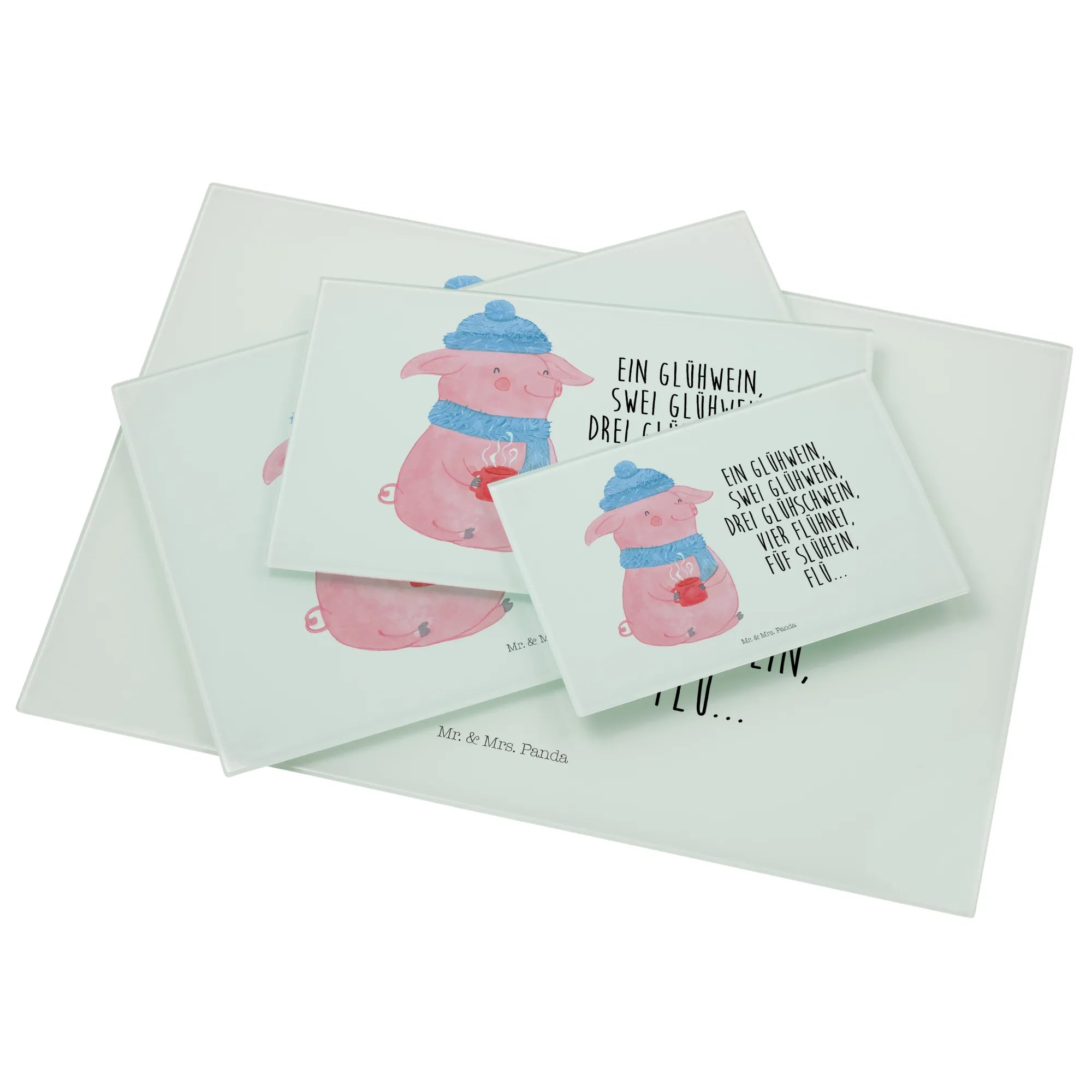 Das Lallelndes Glühschwein Medium Glas Schneidbrett von Mr. & Mrs. Panda macht jede Küche zu einem winterlichen Erlebnis! Mit einem charmanten Design, das ein fröhlich lächelndes, rosa Schwein zeigt, das mit einer blauen Mütze und einem passenden Schal eingekleidet ist, bringt es sofort festliche Stimmung.