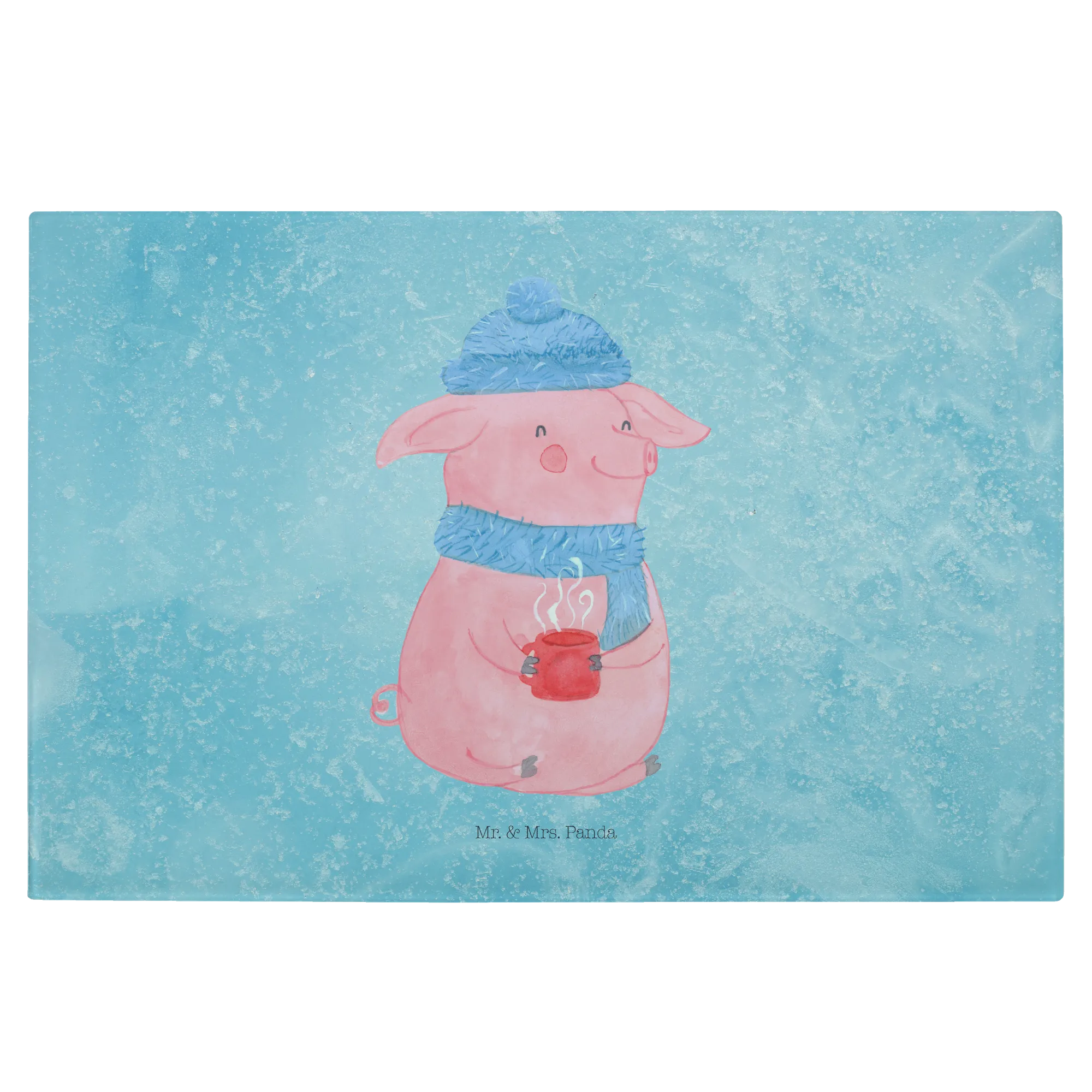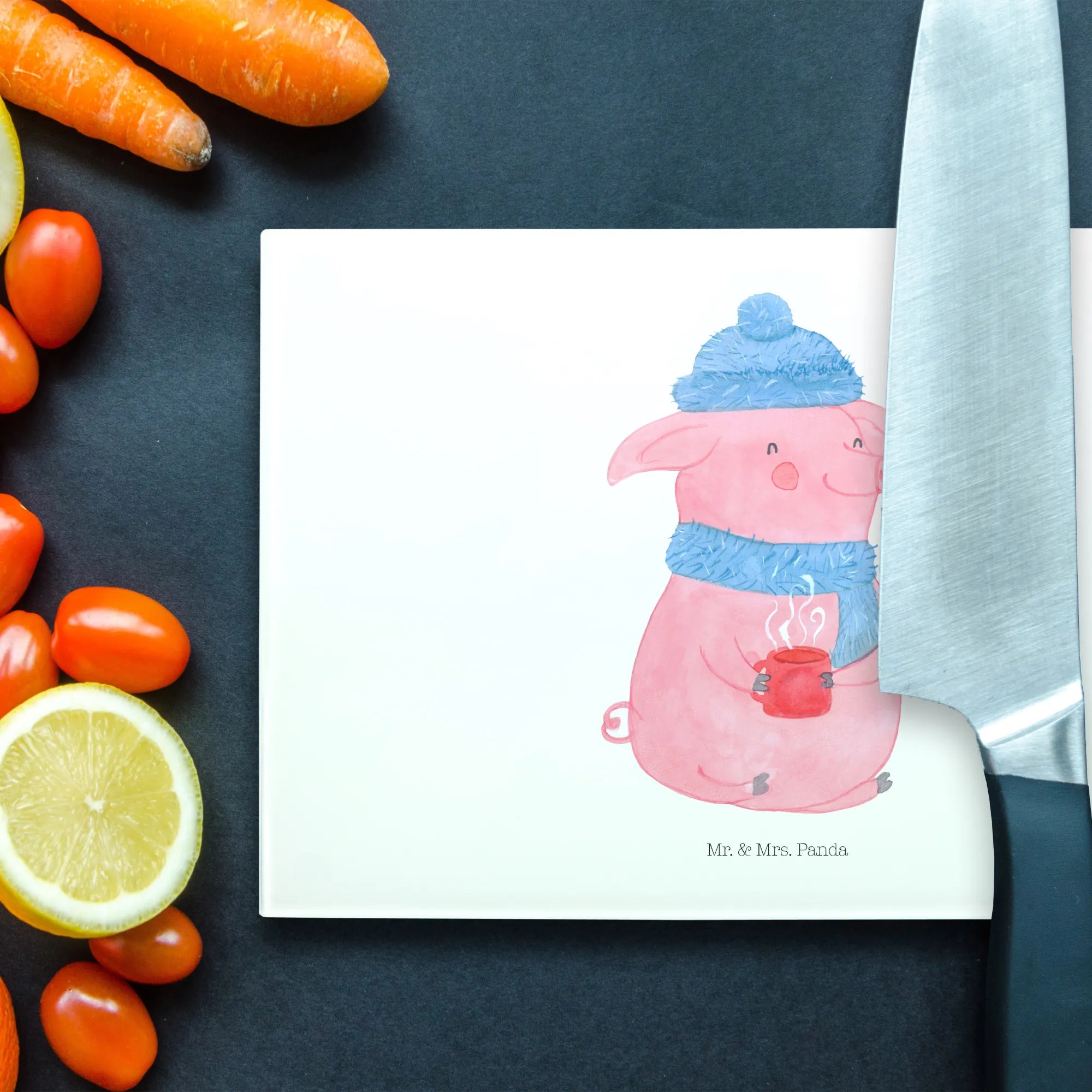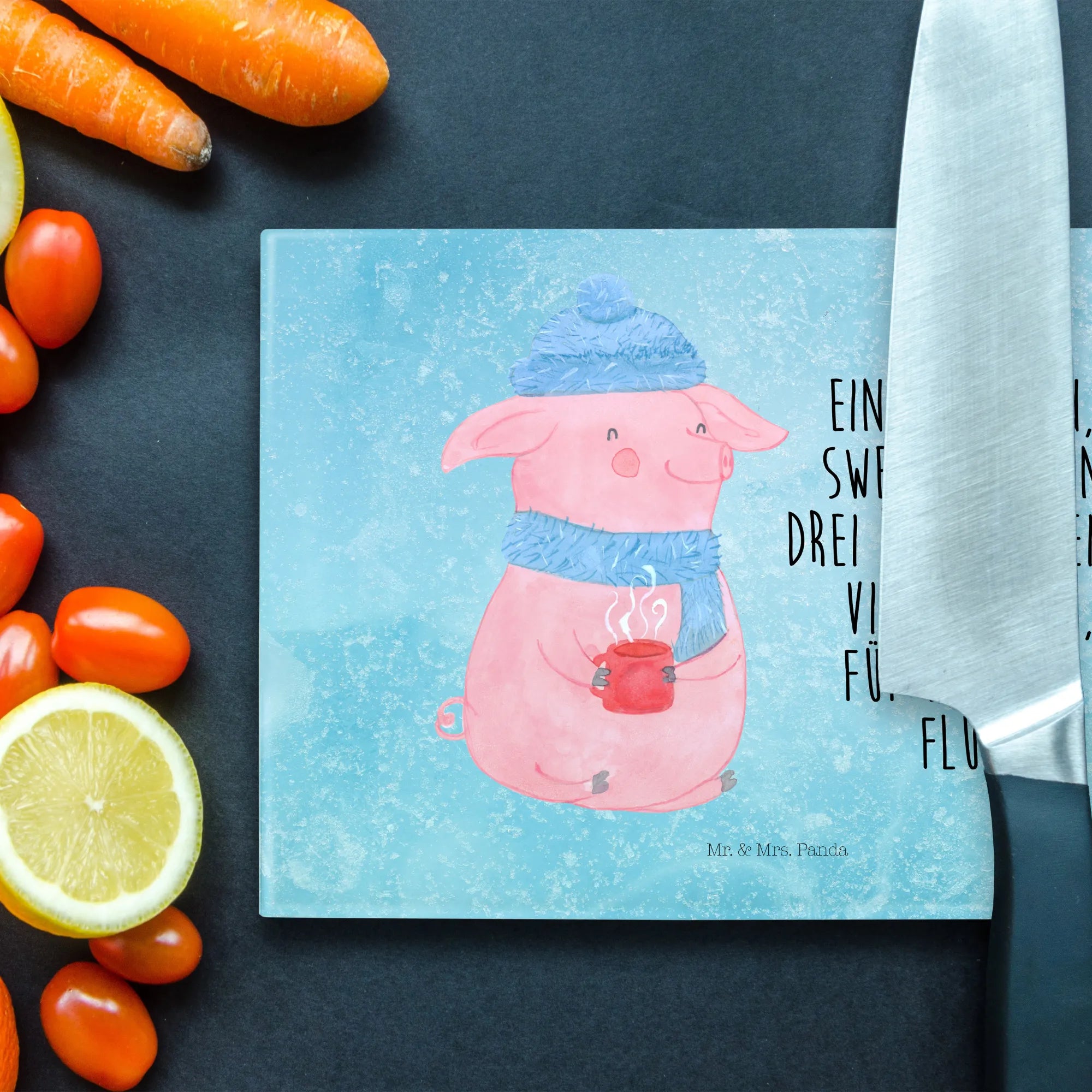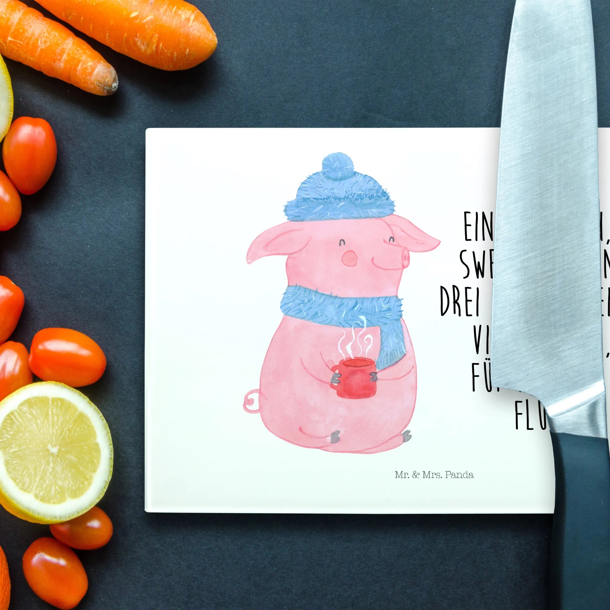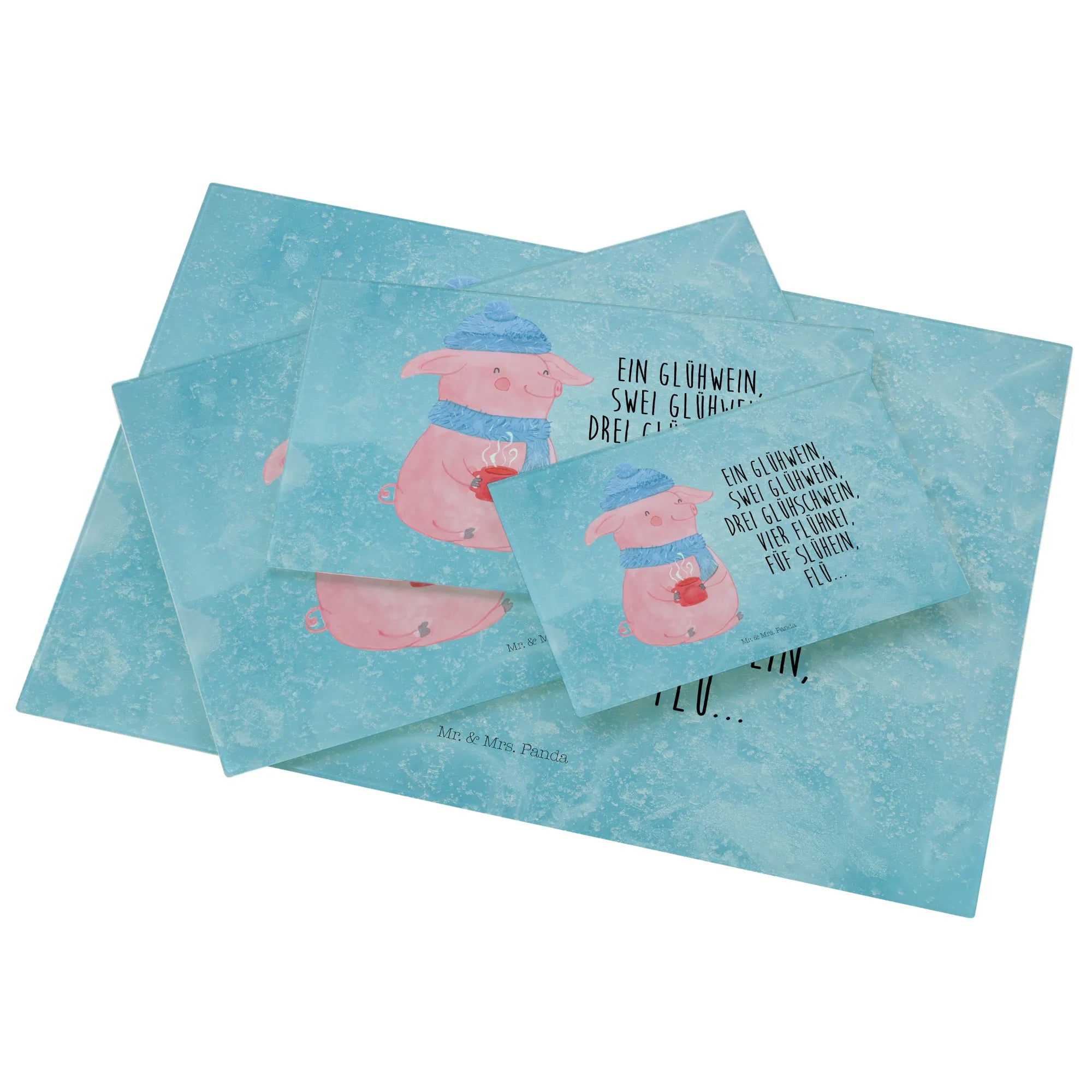 Das Lallelndes Glühschwein Medium Glas Schneidbrett von Mr. & Mrs. Panda macht jede Küche zu einem winterlichen Erlebnis! Mit einem charmanten Design, das ein fröhlich lächelndes, rosa Schwein zeigt, das mit einer blauen Mütze und einem passenden Schal eingekleidet ist, bringt es sofort festliche Stimmung.