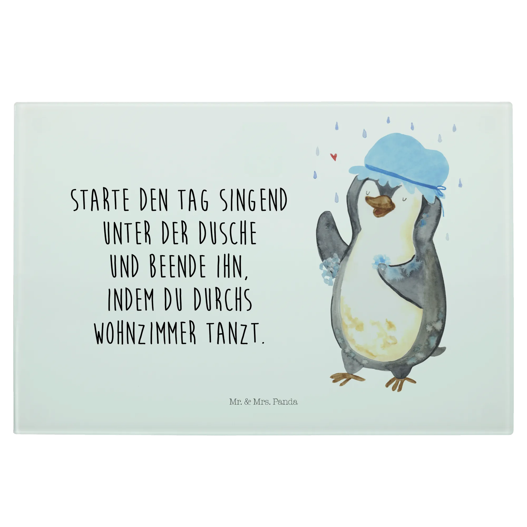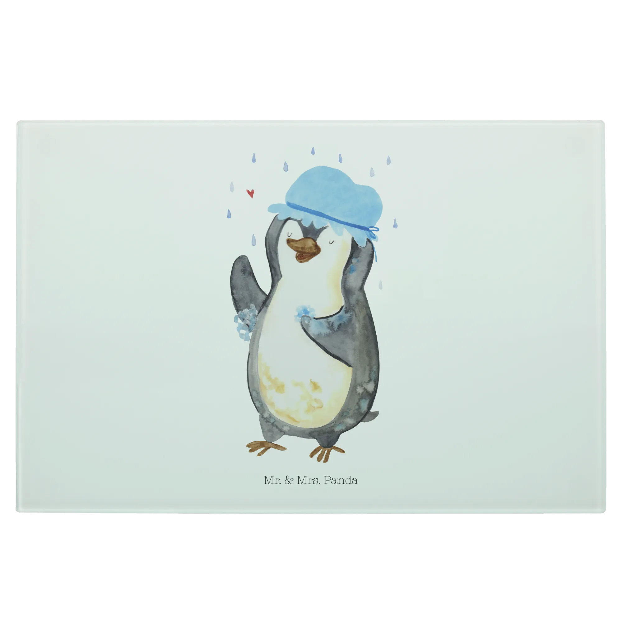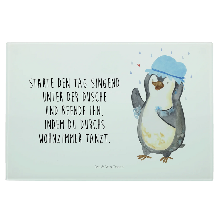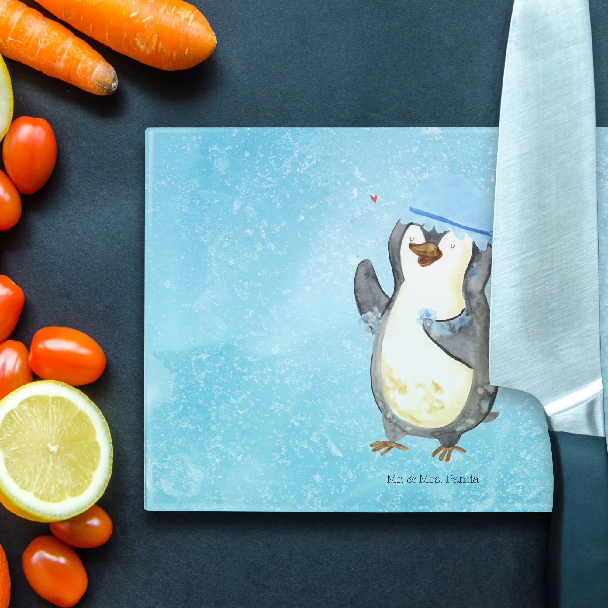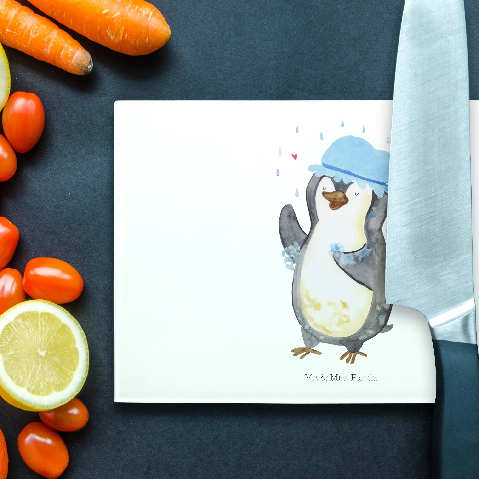Das XL Glas Schneidbrett "Pinguin duscht" aus der liebevollen Pinguin-Kollektion von Mr. & Mrs. Panda ist das perfekte Geschenk für alle, die eine Prise gute Laune in ihrer Küche benötigen!