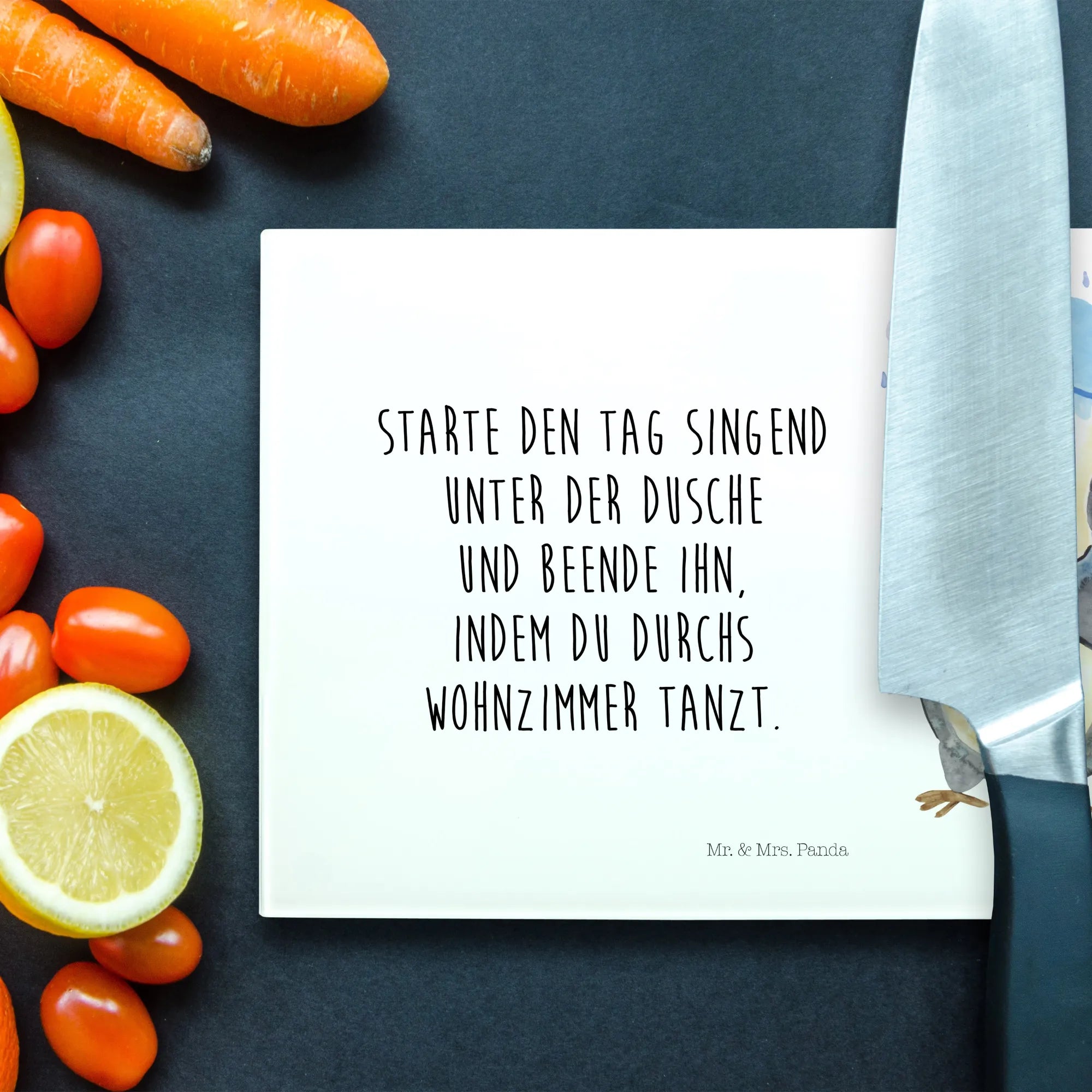 Wenn du auf der Suche nach einem einzigartigen Geschenk bist, das Herzen erfreut und schlechte Laune vertreibt, ist das XL Glas Schneidbrett genau das Richtige! Mit dem prägnanten Slogan "Starte den Tag singend unter der Dusche und beende ihn, indem du durch’s Wohnzimmer tanzt" bringt es nicht nur den Spirit eines Neuanfangs mit sich, sondern inspiriert auch jeden Tag aufs Neue.