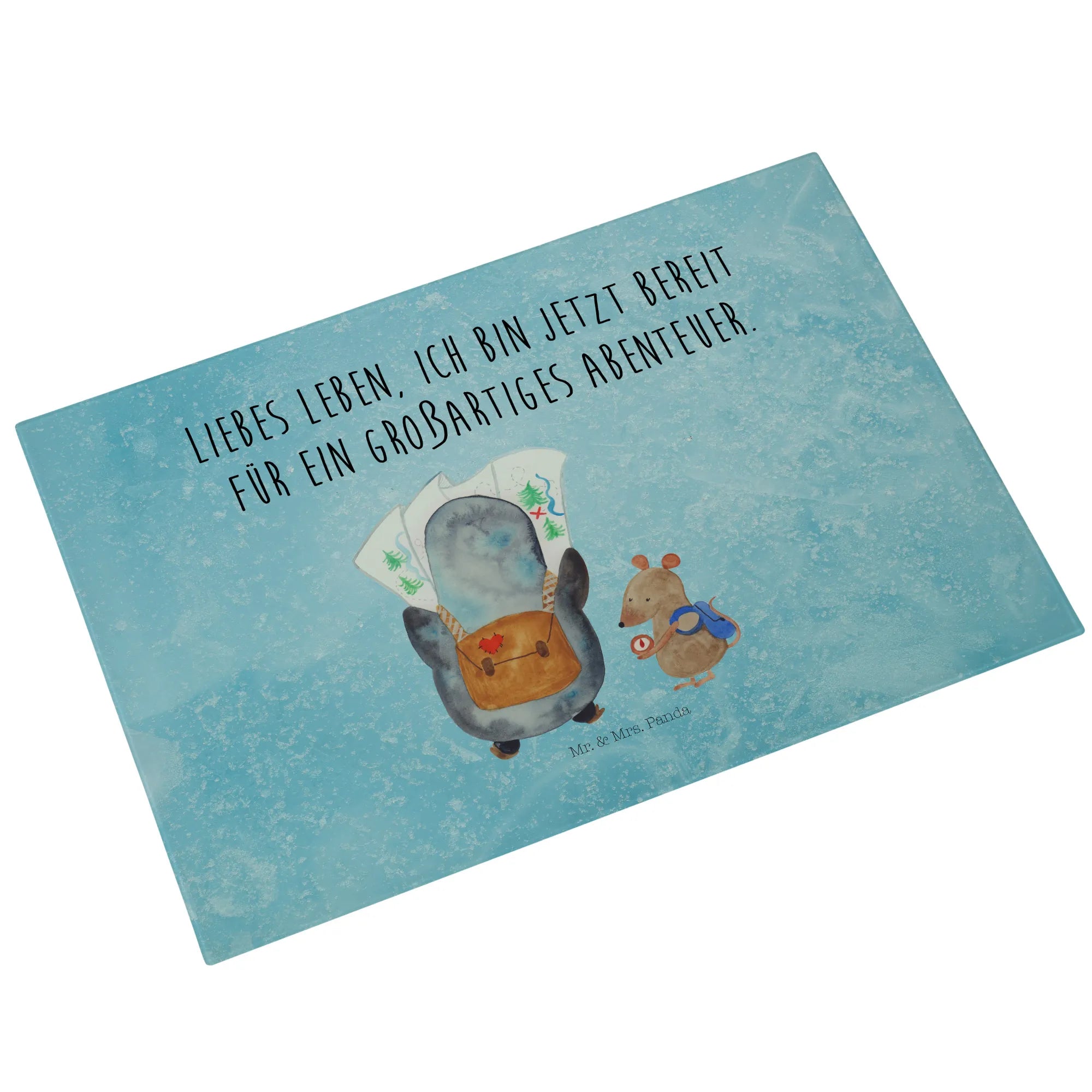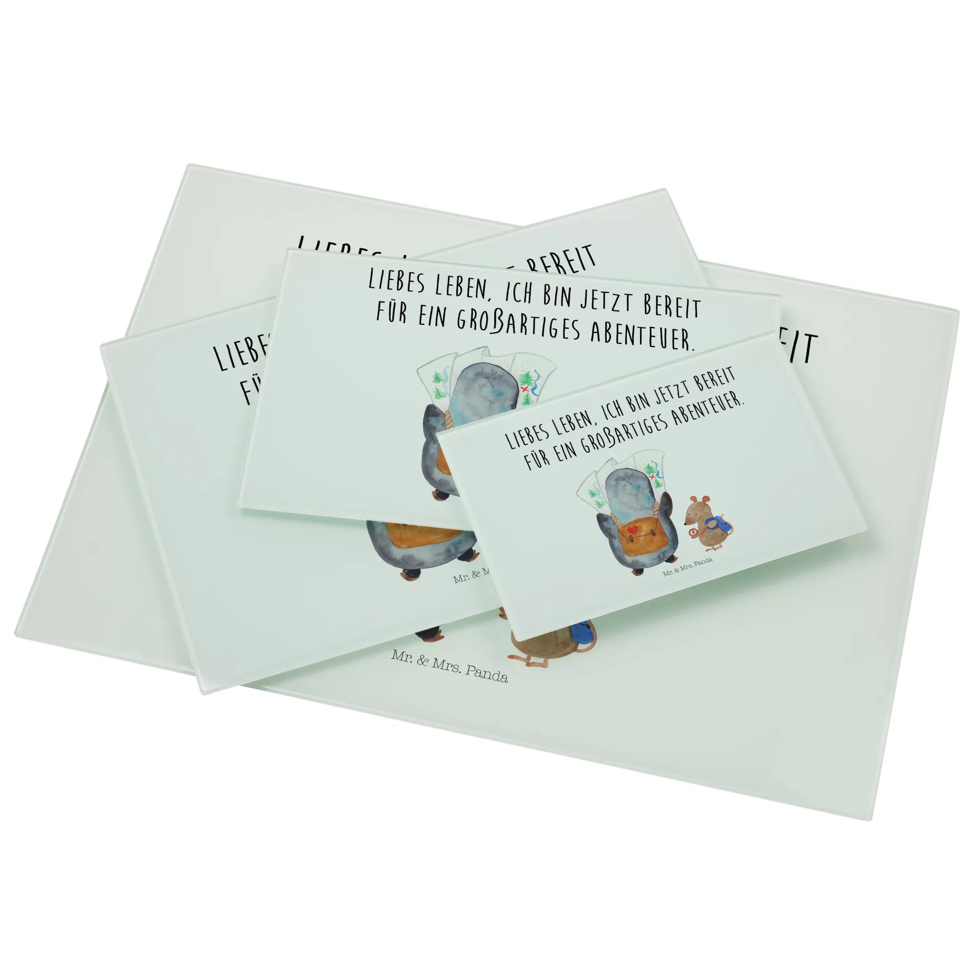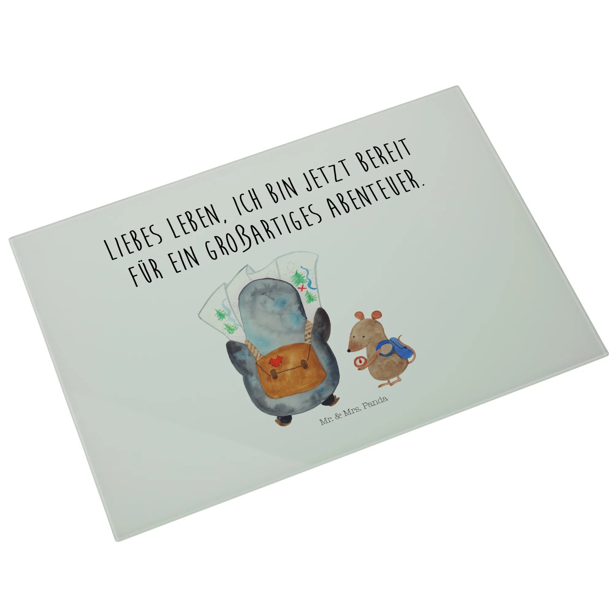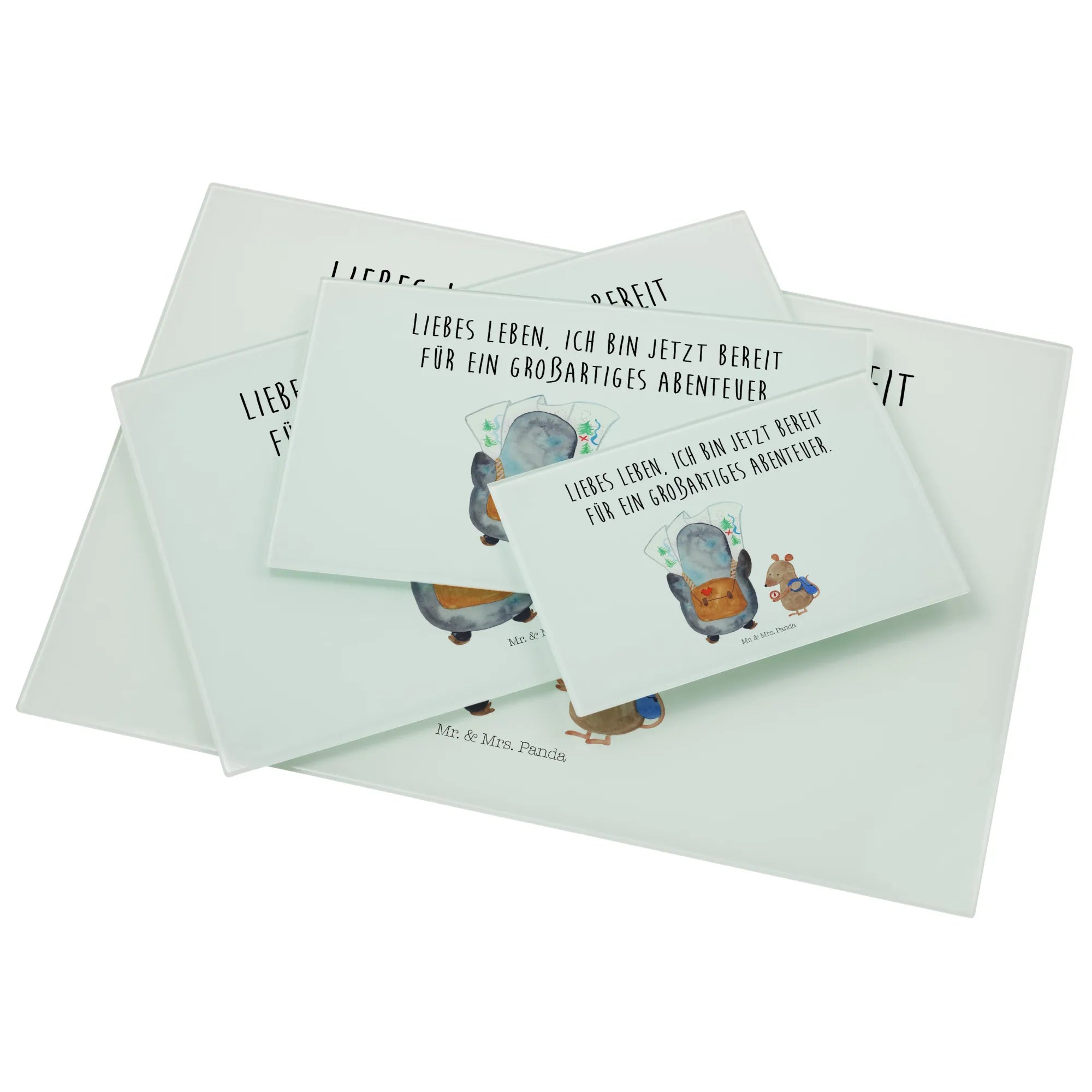 Glasschneidebrett Pinguin & Maus Wanderer - Medium Glas Schneidbrett - mit Spruch - Weiß