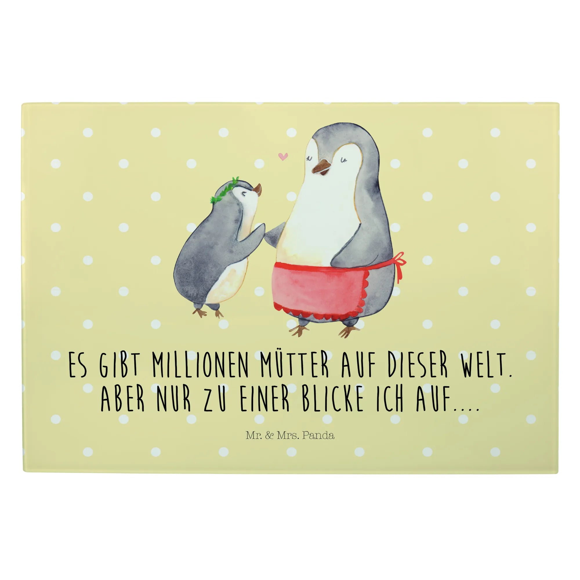 Suchst du nach dem perfekten Geschenk für die beste Mama der Welt? Unser Medium Glas Schneidbrett mit dem süßen Motiv "Pinguin mit Kind" von Mr. & Mrs. Panda ist genau das Richtige! Dieses liebevoll gestaltete Schneidebrett macht jede Küche zu einem ganz besonderen Ort. Die Szene zeigt einen großen Pinguin in einer roten Schürze, der fürsorglich auf den kleinen Pinguin mit grünem Kranz schaut. Zwischen ihnen schwebt ein kleines Herz, welches die innige Verbindung zwischen Mama und Kind symbolisiert.