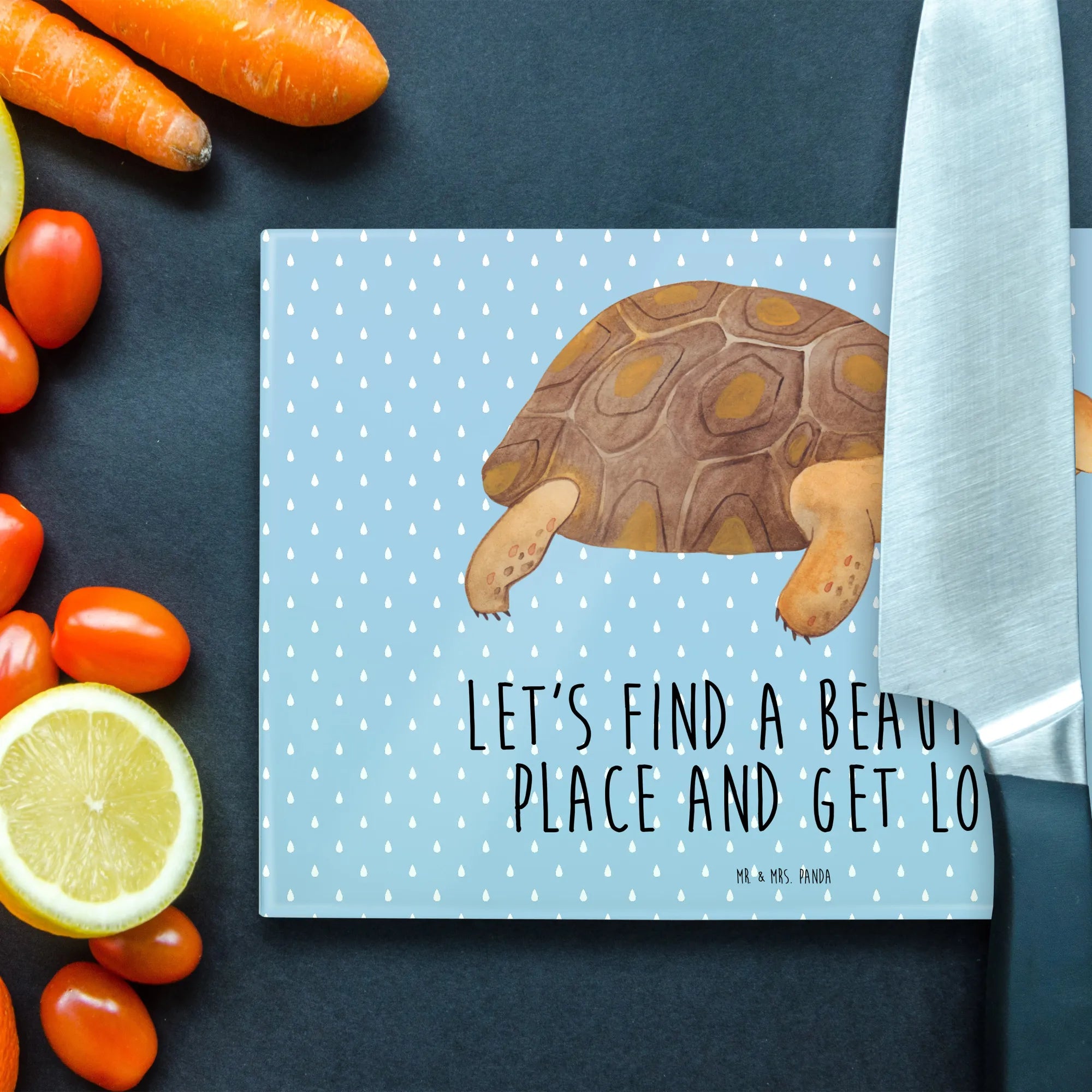 Unser Extra großes Glasschneidebrett bringt Meeresflair in deine Küche: die zarte, handgezeichnete Schildkröte mit ihrem freundlichen Lächeln erinnert dich daran, ab und zu einen Gang runterzuschalten und Neues zu entdecken. Mit dem liebevollen Slogan „Let’s find a beautiful place and get lost.“ wird dieses dekorative Glasschneidebrett XL zu einem inspirierenden Geschenk für Reisefreudige, Neustarter und Lieblingsmenschen. 🌊🐢