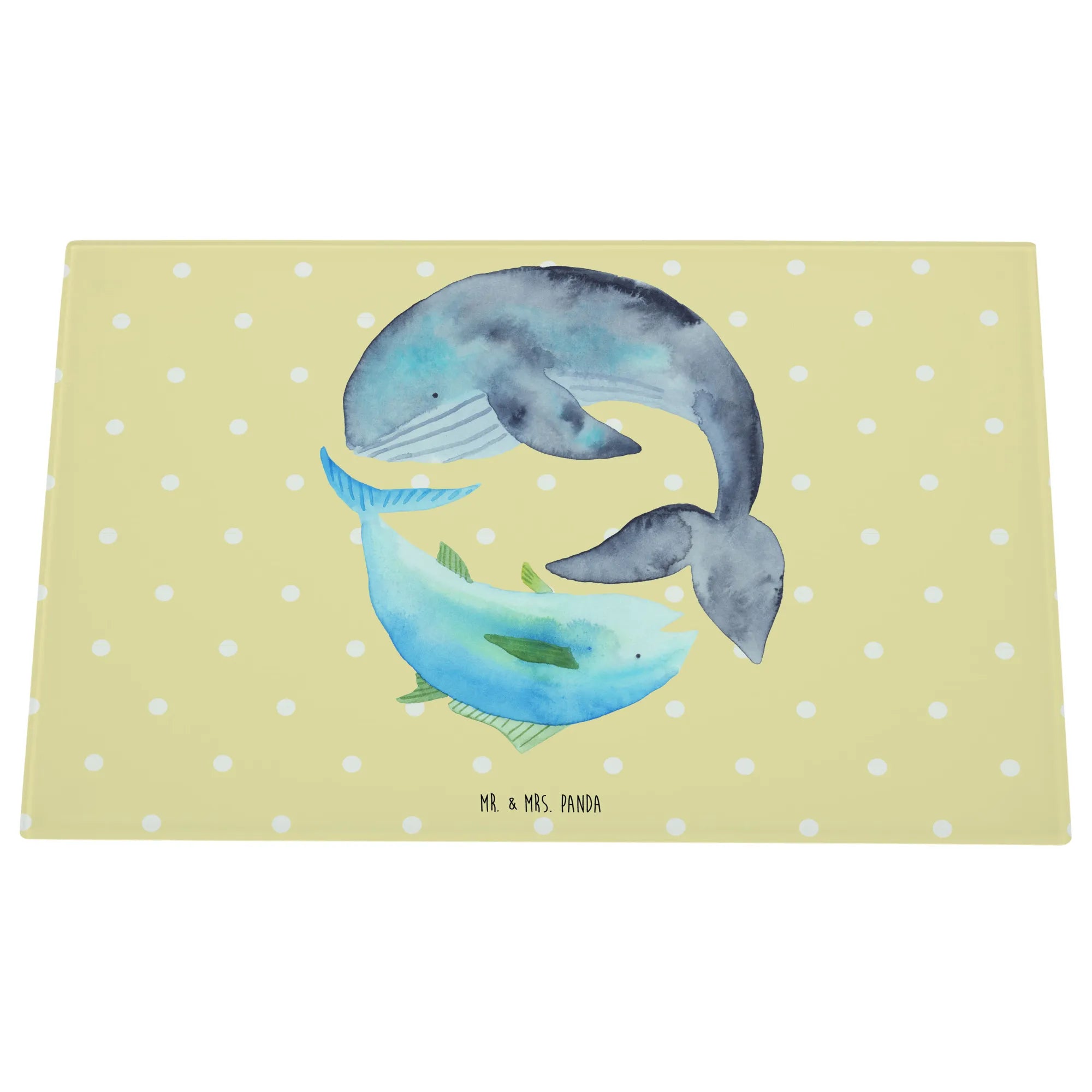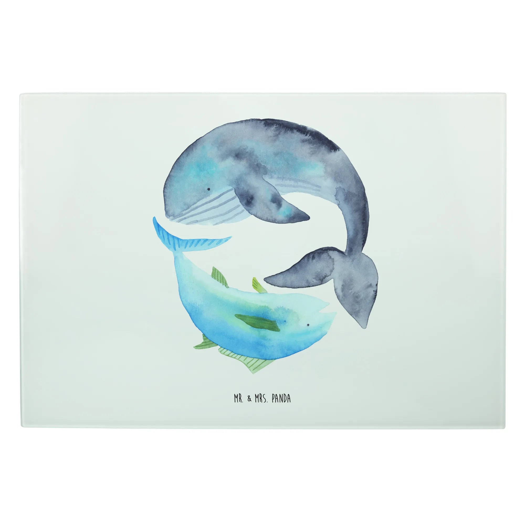 Das Medium Glas Schneidbrett mit dem einzigartigen Motiv von Mr. & Mrs. Panda, featuring einen freundlichen Walfisch und seinen Gesprächspartner, den Thunfisch, ist das perfekte Geschenk für jeden, der das Meer und seine Bewohner liebt. Die verspielte Darstellung der beiden Fische, die für Freiheit und Freundschaft stehen, bringt Freude in jede Küche.