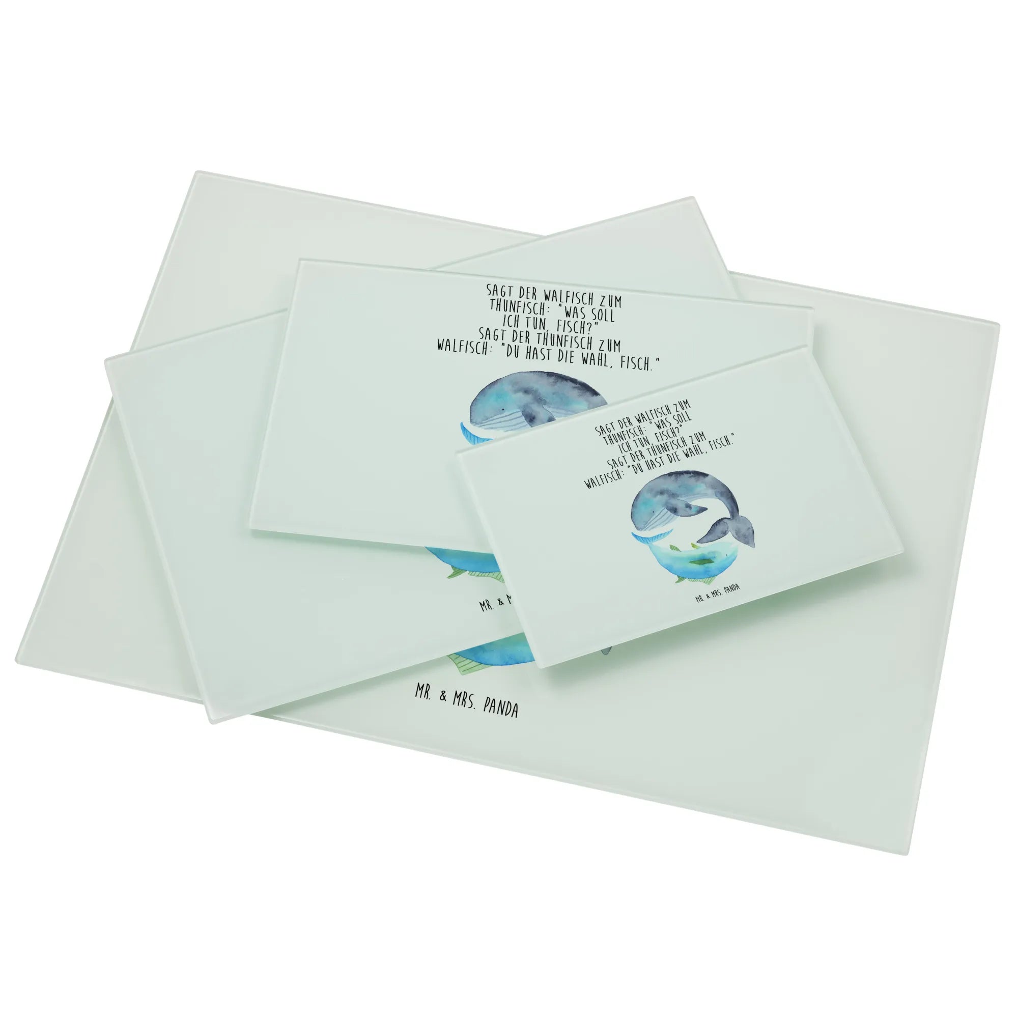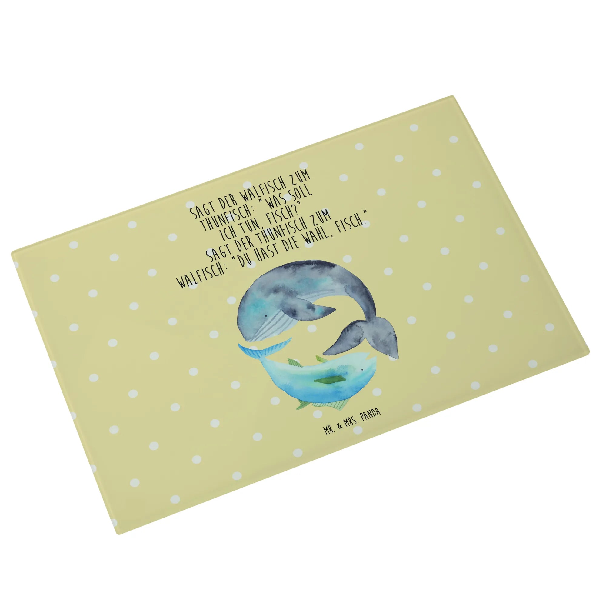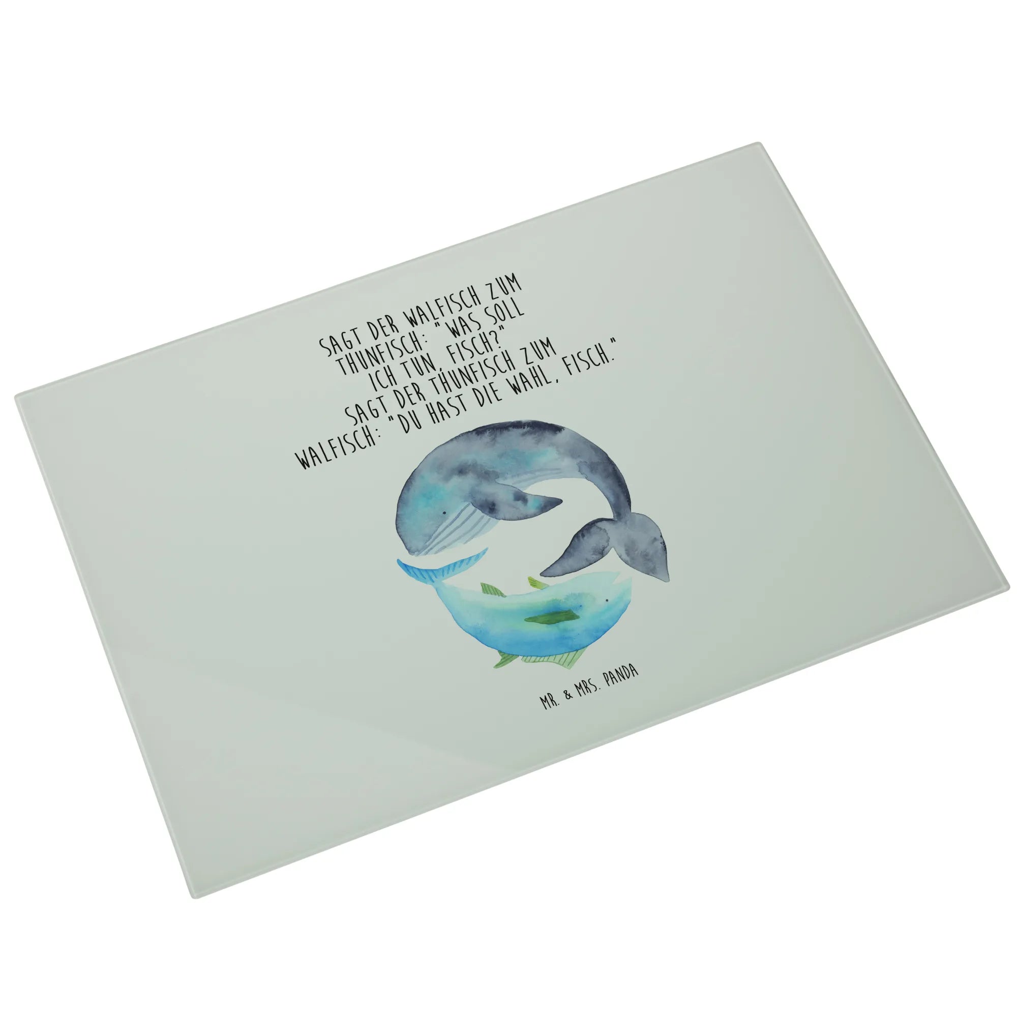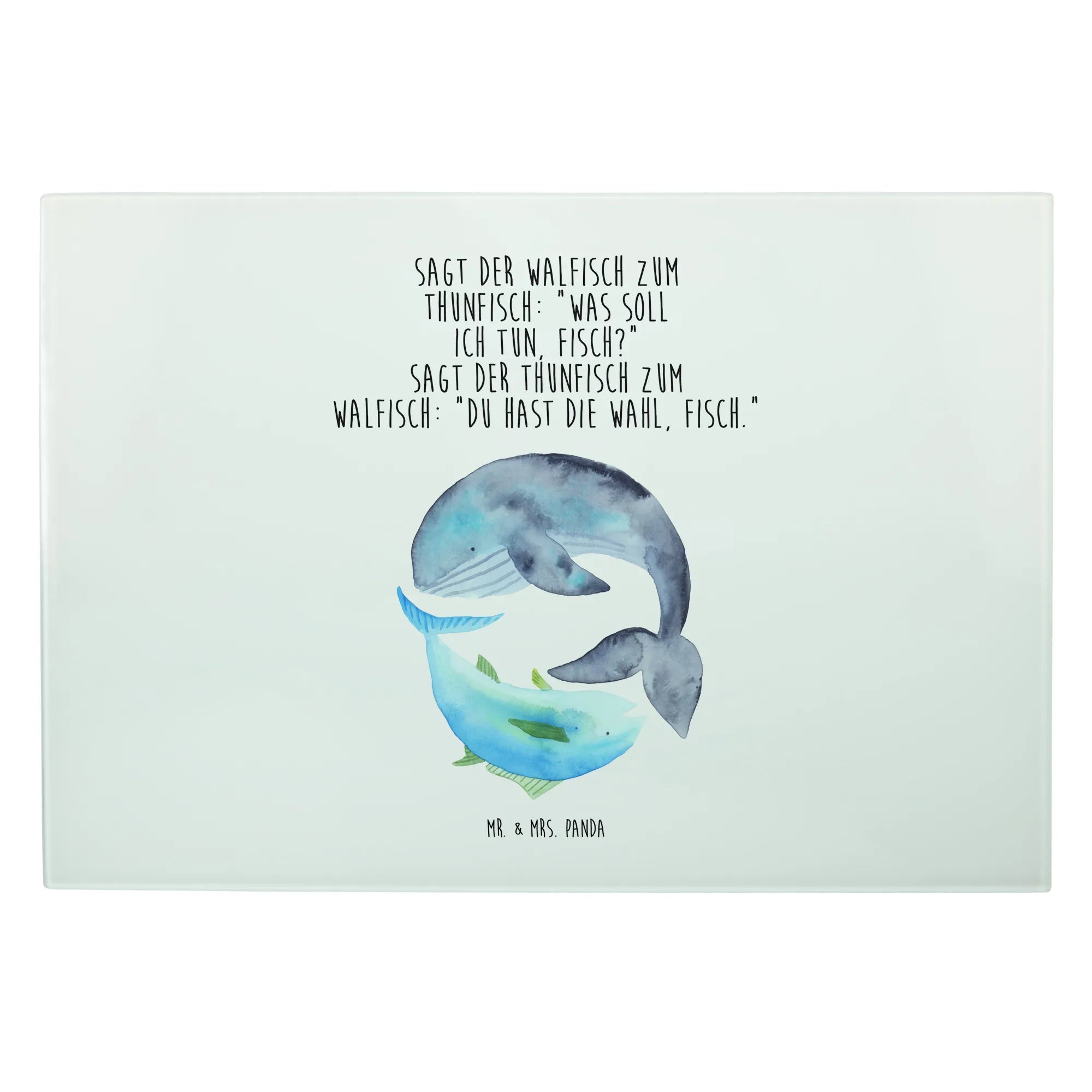 Entdecke das liebevoll gestaltete Medium Glas Schneidebrett von Mr. & Mrs. Panda, das mit einem bezaubernden Motiv von Walfisch und Thunfisch verziert ist. Dieses Schneidebrett sorgt nicht nur für gute Laune in deiner Küche, sondern bringt auch einen Hauch von maritimem Flair in dein Zuhause. Der witzige Spruch – 'Sagt der Walfisch zum Thunfisch: „Was soll ich tun, Fisch?“ Sagt der Thunfisch zum Walfisch: „Du hast die Wahl, Fisch.“ – macht es zu einem perfekten Geschenk für Freunde und Familie, die das Besondere lieben.