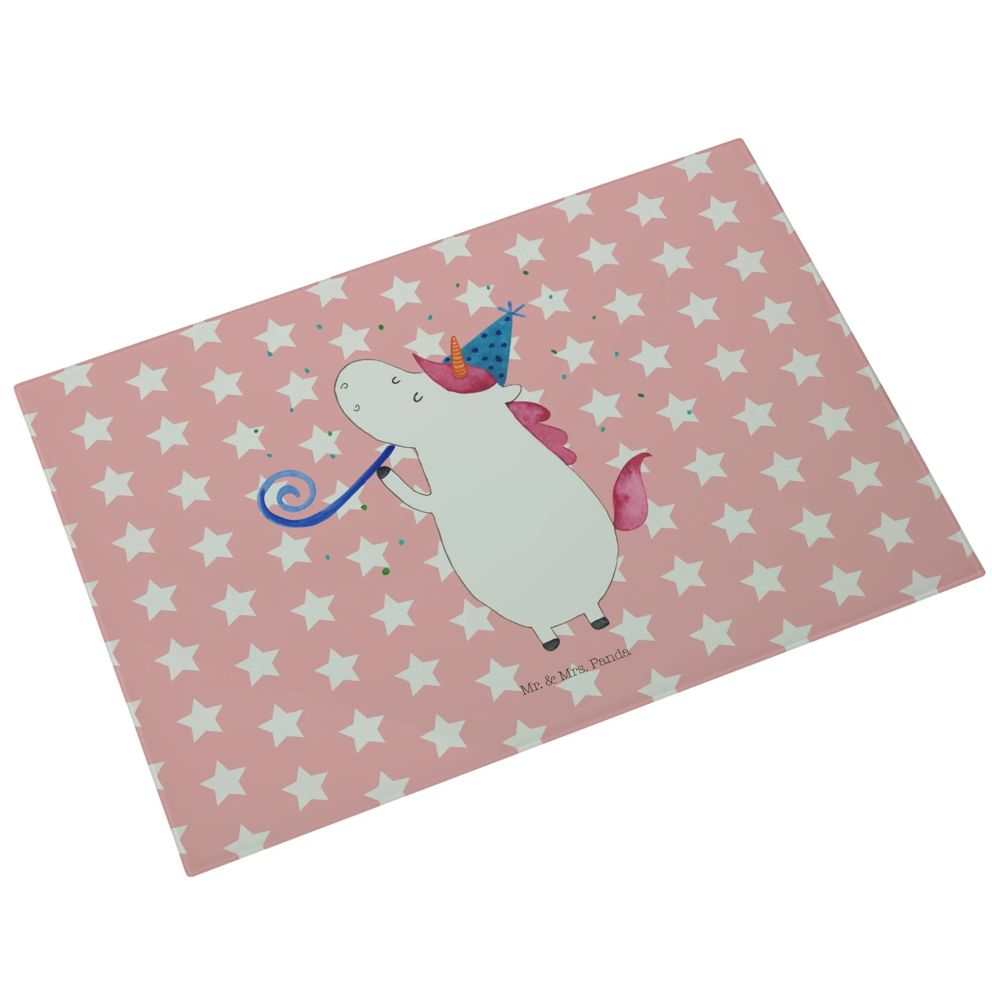 Entdecke unser einzigartiges Medium Glas Schneidbrett mit dem bezaubernden Einhorn-Party-Motiv aus der liebevollen Einhorn - Kollektion von Mr. & Mrs. Panda!