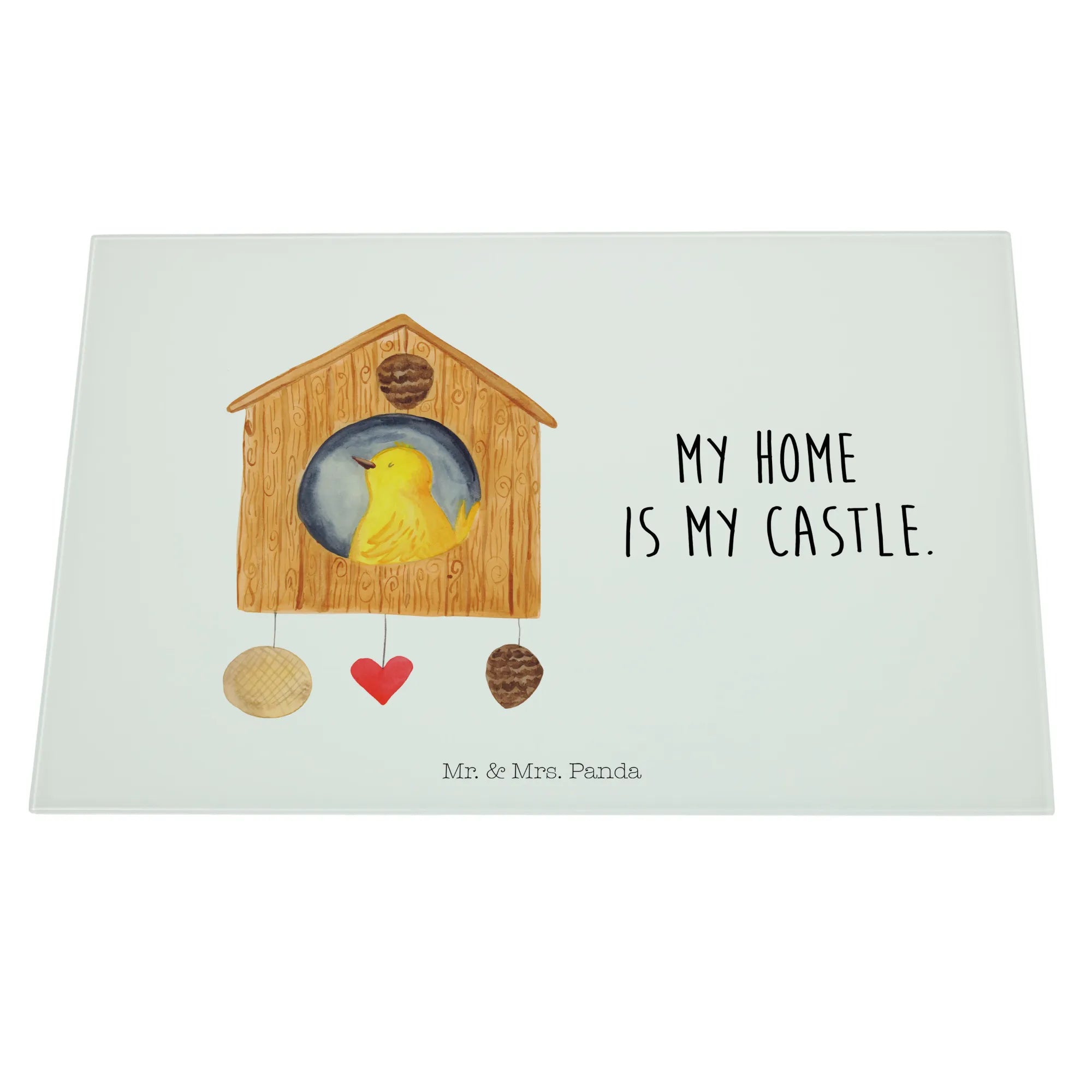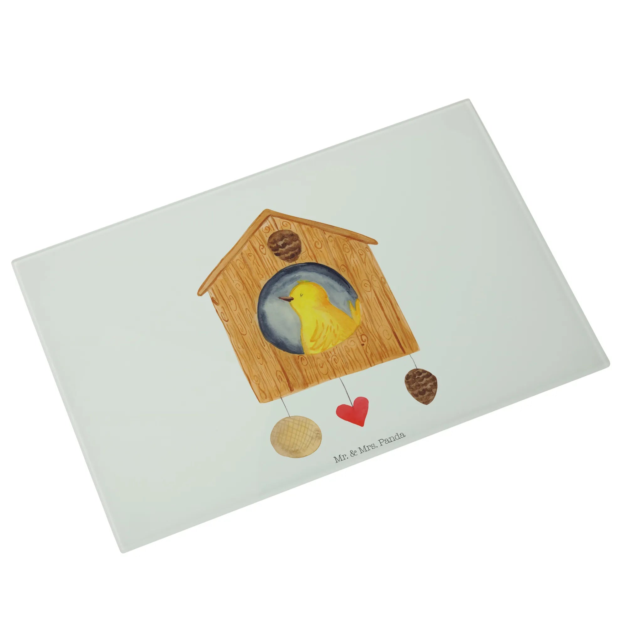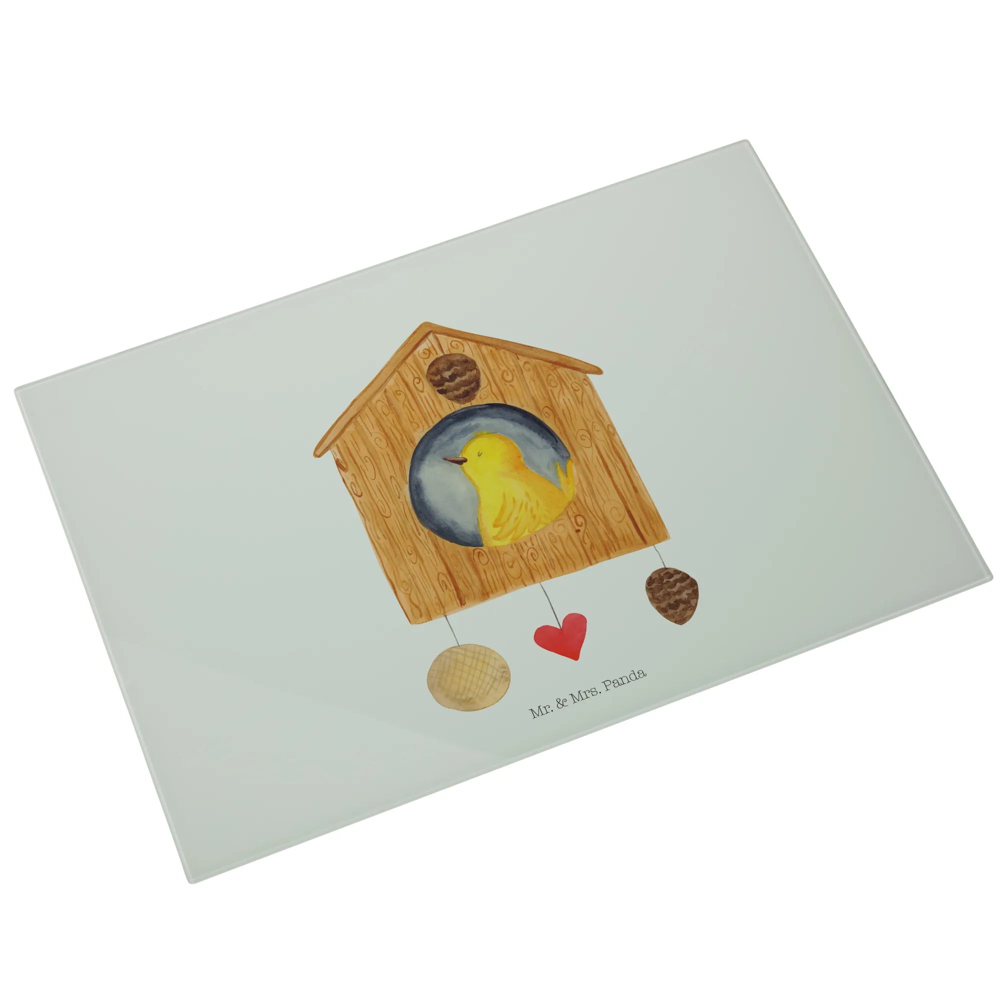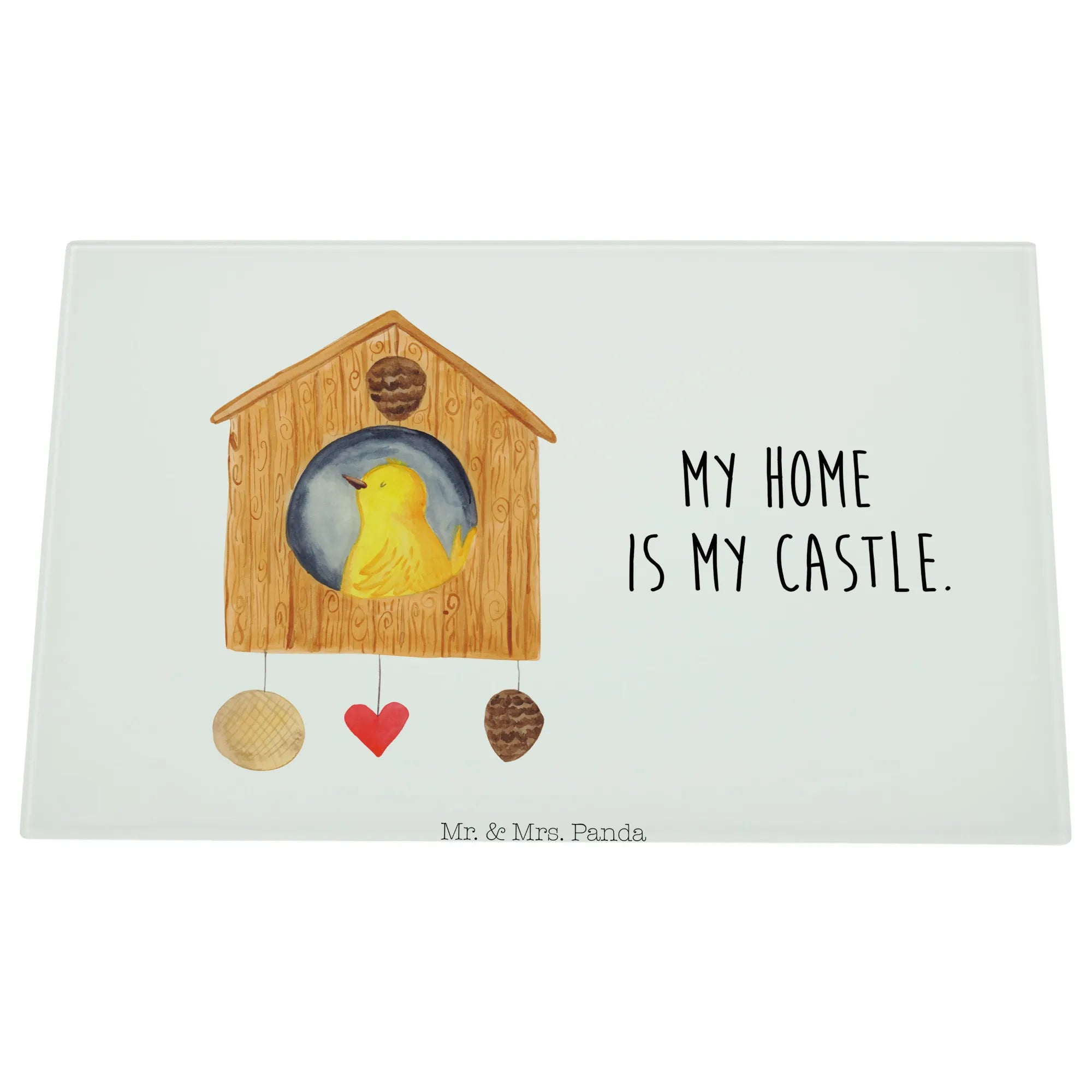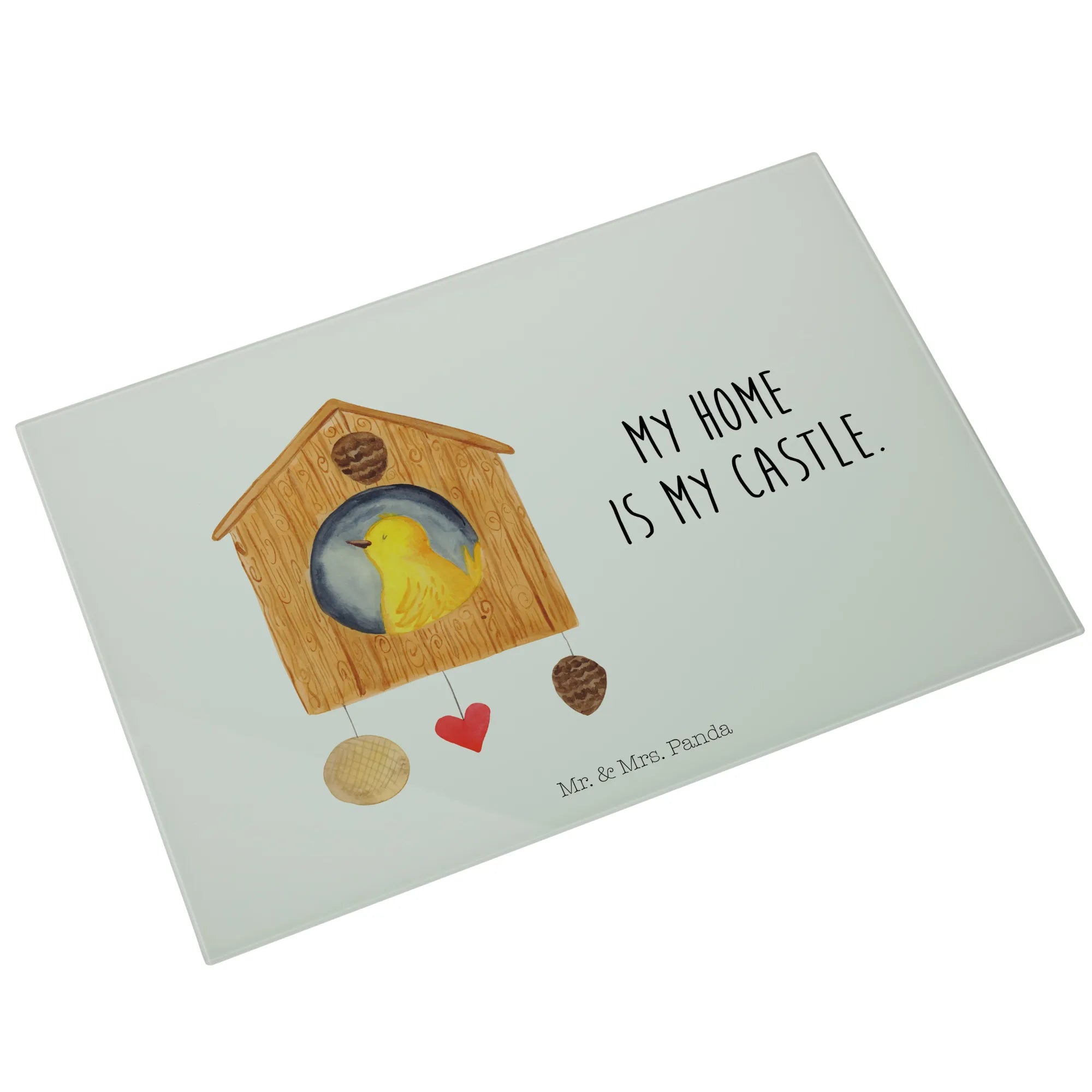 Glasschneidebrett Vogel Haus - Medium Glas Schneidbrett - mit Spruch - Weiß