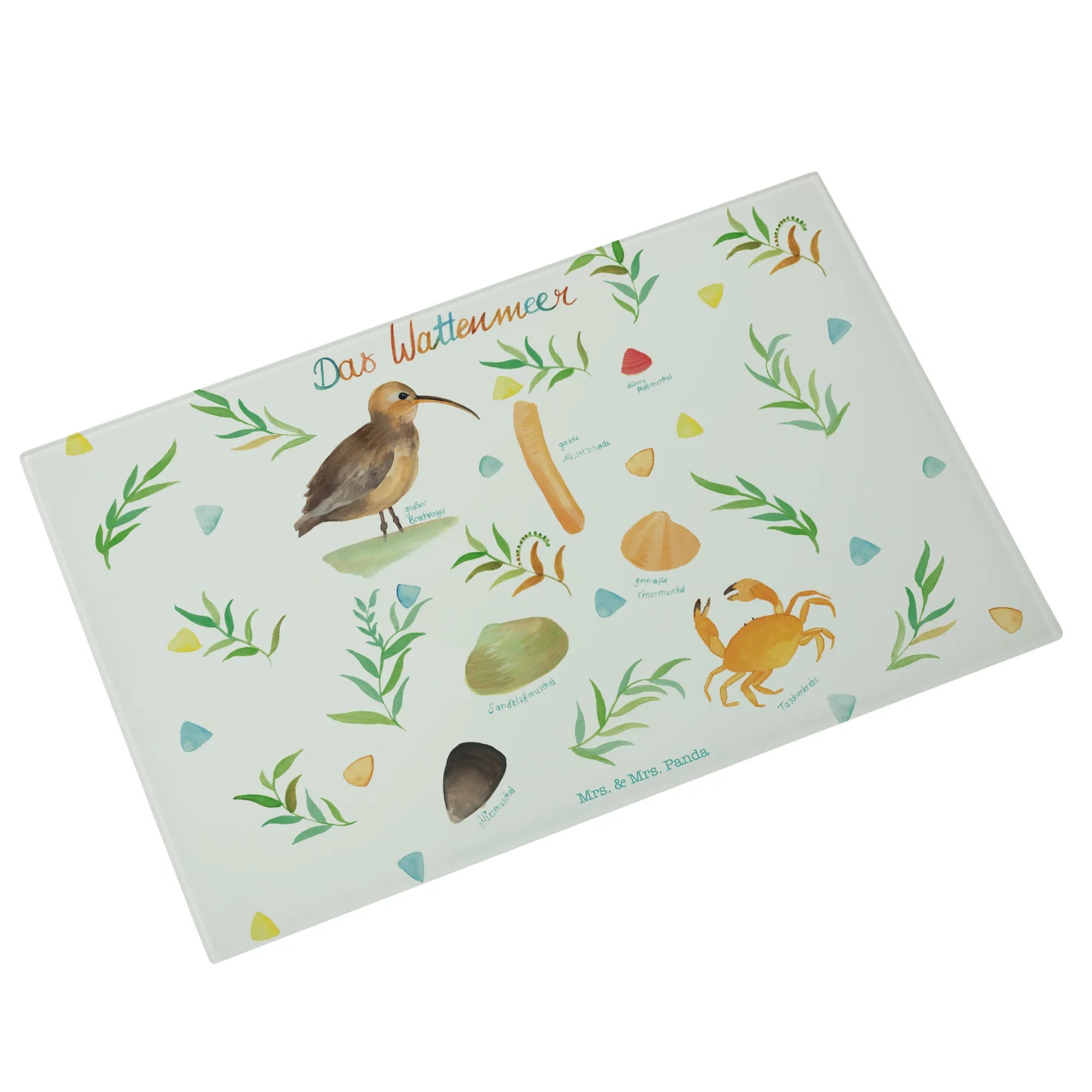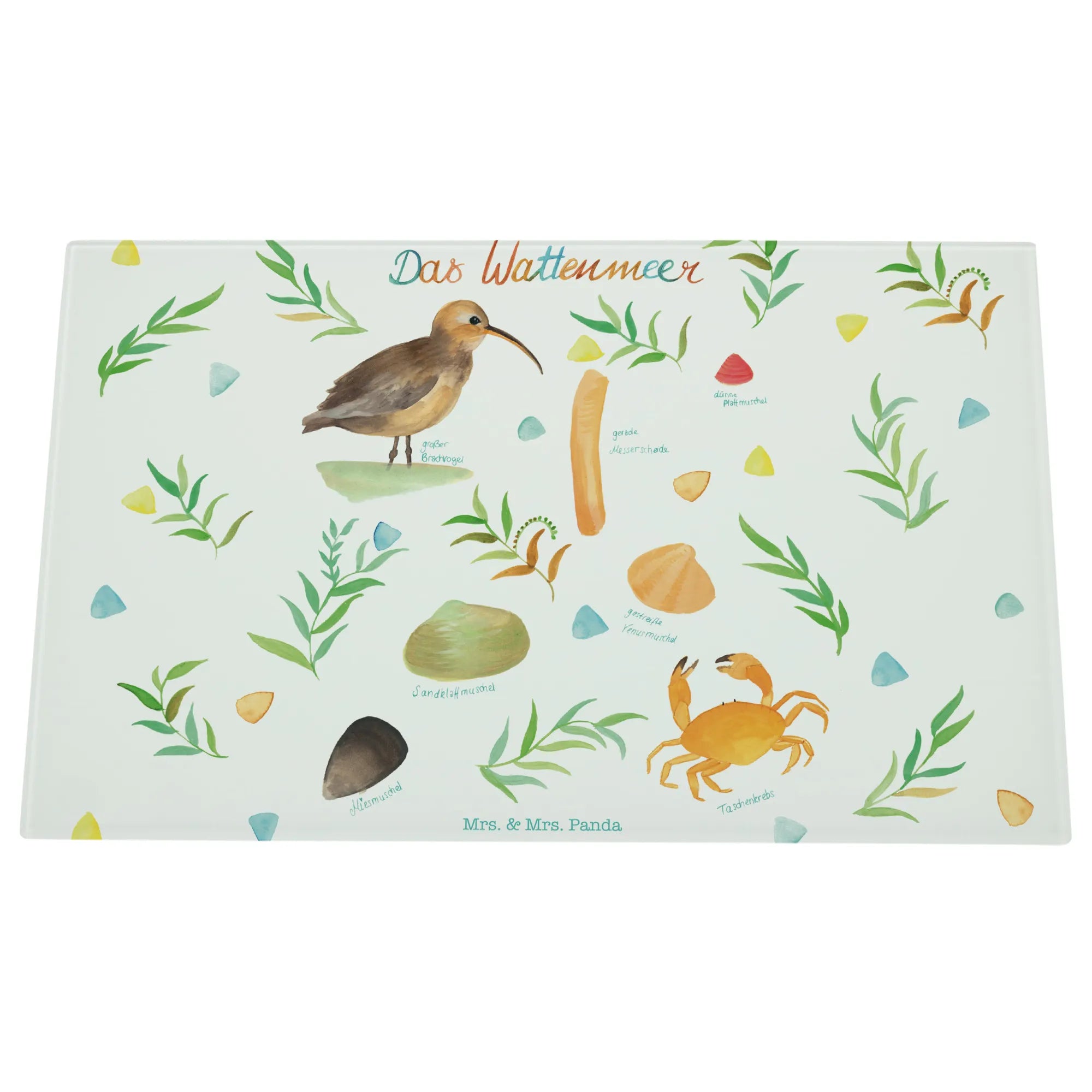 Das Medium Glas Schneidebrett mit dem bezaubernden Motiv Wattenmeer von Mr. & Mrs. Panda ist das perfekte Geschenk für Naturliebhaber und alle, die die Schönheit der Nordsee und Ostsee schätzen. Die handgezeichnete Illustrationen zeigen die facettenreiche Tier- und Pflanzenwelt des Wattenmeers: einen großen Brachvogel, den seenebelwurm, einen Taschenkrebs und verschiedene Muscheln umgeben von grünem Seegras. Dieses einzigartige Design weckt die Vorfreude auf ausgedehnte Strandspaziergänge und das Erforschen der Küstenlandschaften.