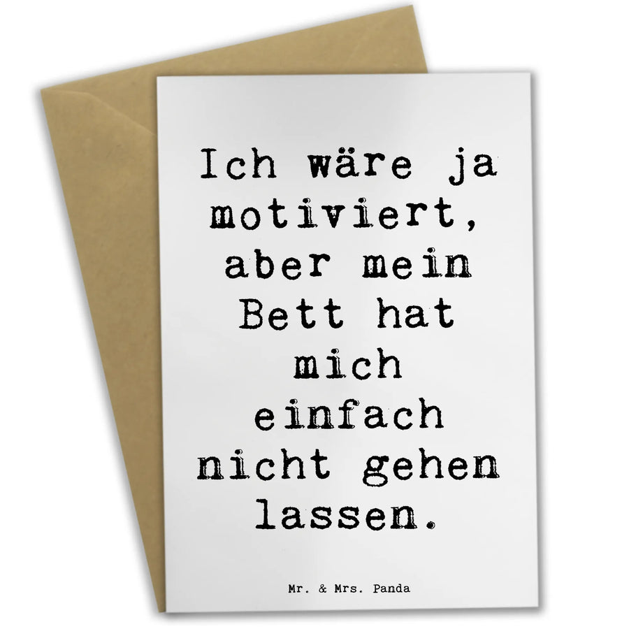 Die wunderschöne Grußkarte von Mr. & Mrs. Panda ist das perfekte Geschenk für alle, die in ihrem Leben eine Extra-Portion Motivation benötigen. Das besondere Design mit dem Spruch "Ich wäre ja motiviert, aber mein Bett hat mich einfach nicht gehen lassen." spricht nicht nur die Faulenzer unter uns an, sondern eignet sich auch für Freunde, Kollegen oder Familienmitglieder, die mit einer gesunden Portion Humor begrüßt werden möchten.